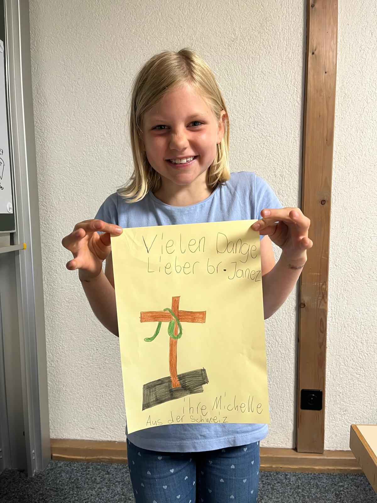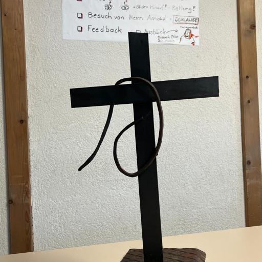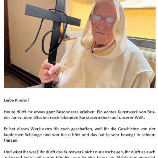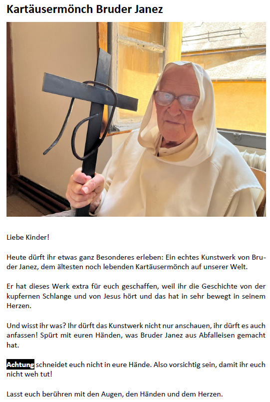 Der «Besuch» von Kartäusermönch Niclaus Schürstein aus der Kartause Thorberg. Er hat uns erzählt, wie Kartäusermönche leben und beten. Besonders spannend war die Kunst von Bruder Janez, der heute lebende und älteste Kartäusermönch mit seinem Kreuz und der Schlange.