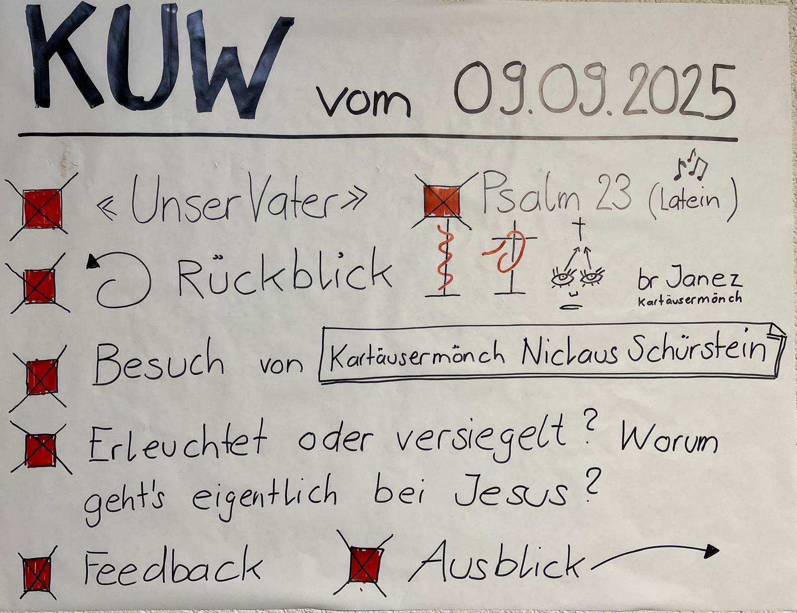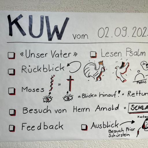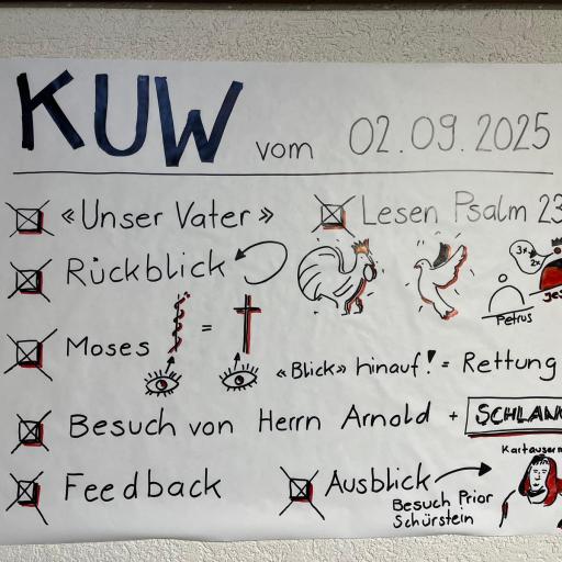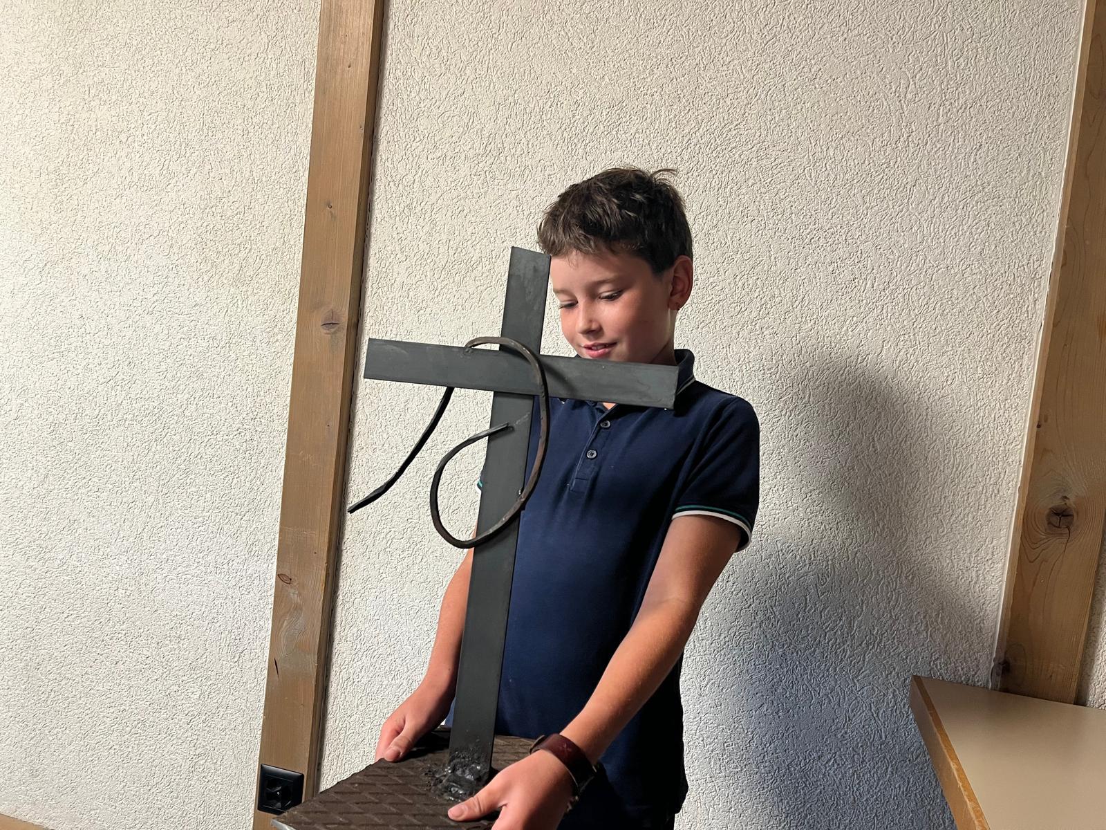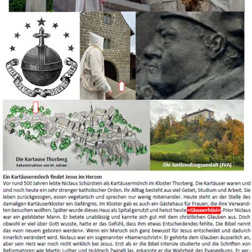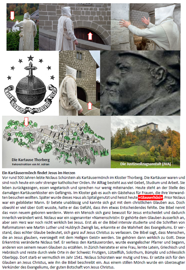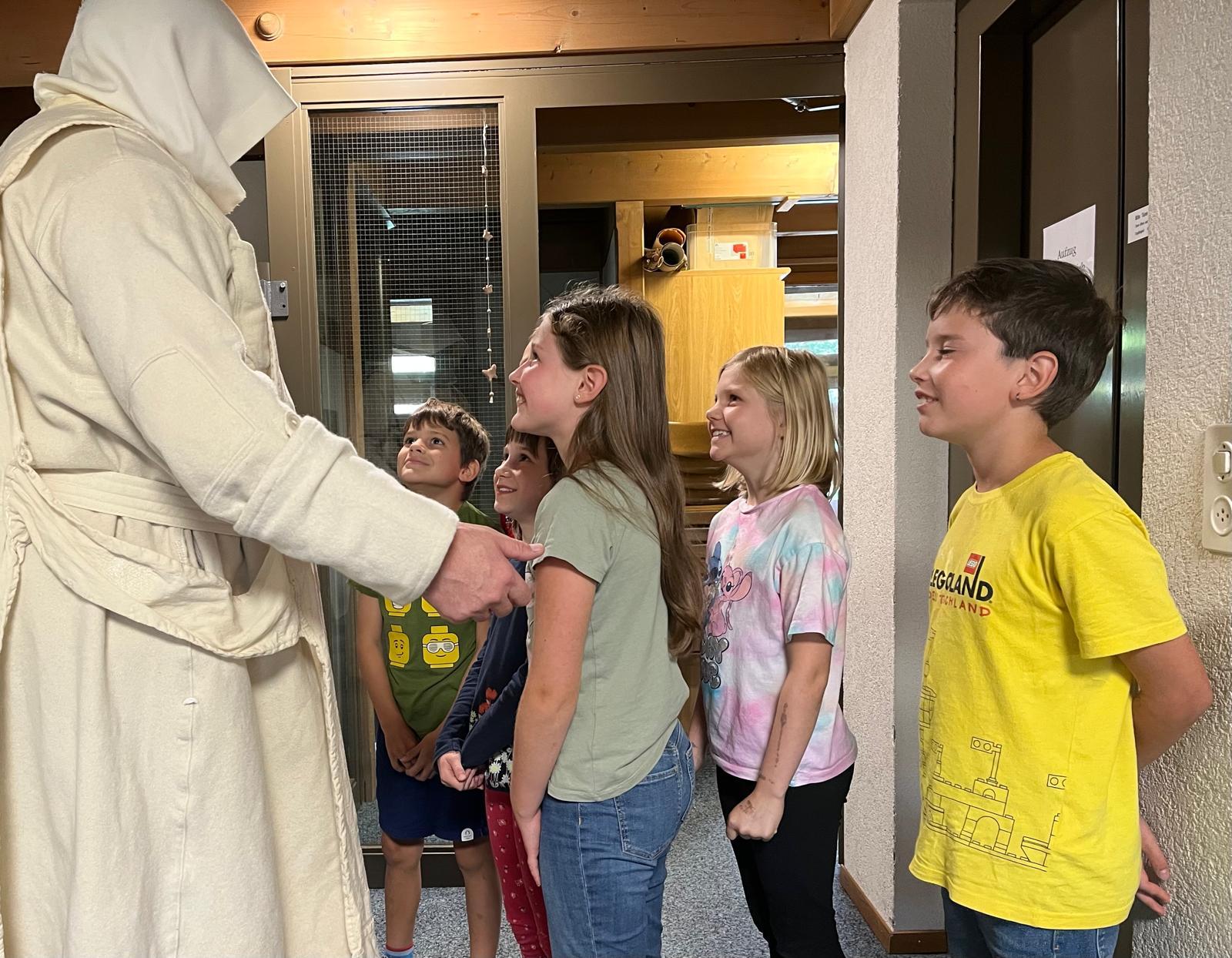 Heute durften wir einen ganz besonderen KUW Nachmittag erleben. Zu Beginn sprachen wir gemeinsam das «Unser Vater». Danach erinnerten wir uns an den letzten KUW Nachmittag: Die Geschichte der kupfernen Schlange, ein Zeichen dafür, dass Gott heilt und Hoffnung schenkt. Besonders aufregend war der Besuch von Herrn Arnold, mit seiner echten Schlange! Ein weiteres Highlight war das Kunstwerk von Bruder Janez, einem 92-jährigen Kartäusermönch. Psalm 23 hörten wir heute auf Lateinisch, gesungen von echten Kartäusermönchen. Ihre Stimmen waren wie ein sanfter Wind, der unser Herz berührte. Wir lauschten ganz still. Dann «besuchte» uns Niclaus Schürstein, ein Kartäusermönch, der vor 500 Jahren lebte. Wir durften sogar eine echte Kukulle anziehen. Das Obergewand der Kartäuser. Es war lustig und ehrfürchtig zugleich, einmal Kartäuser zu sein. Bruder Niclaus erzählte von seinem Weg mit Gott: Zunächst verstand er Jesus nur mit dem Verstand. Später erkannte er Ihn mit dem Herzen und wurde durch den Heiligen Geist versiegelt. Seine Geschichte zeigte uns, wie tief der Glaube an Christus wirken kann. Selbst ein Kartäusermönch wird davon verwandelt. Er erkannte, dass das Leben als Kartäusermönch nicht mit seinen biblischen Überzeugungen vereinbar war, und verliess daher den strengen katholischen Orden, um reformierter Pfarrer zu werden.