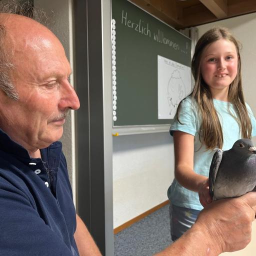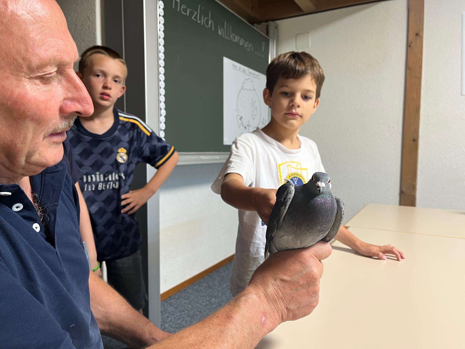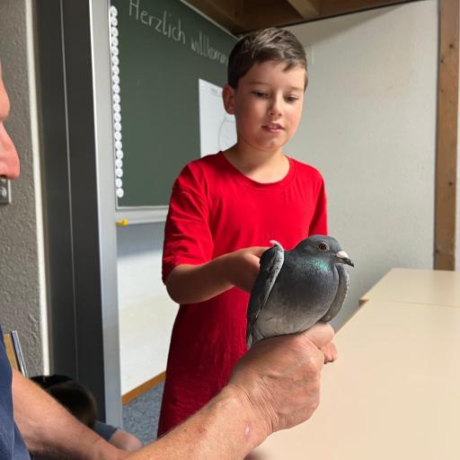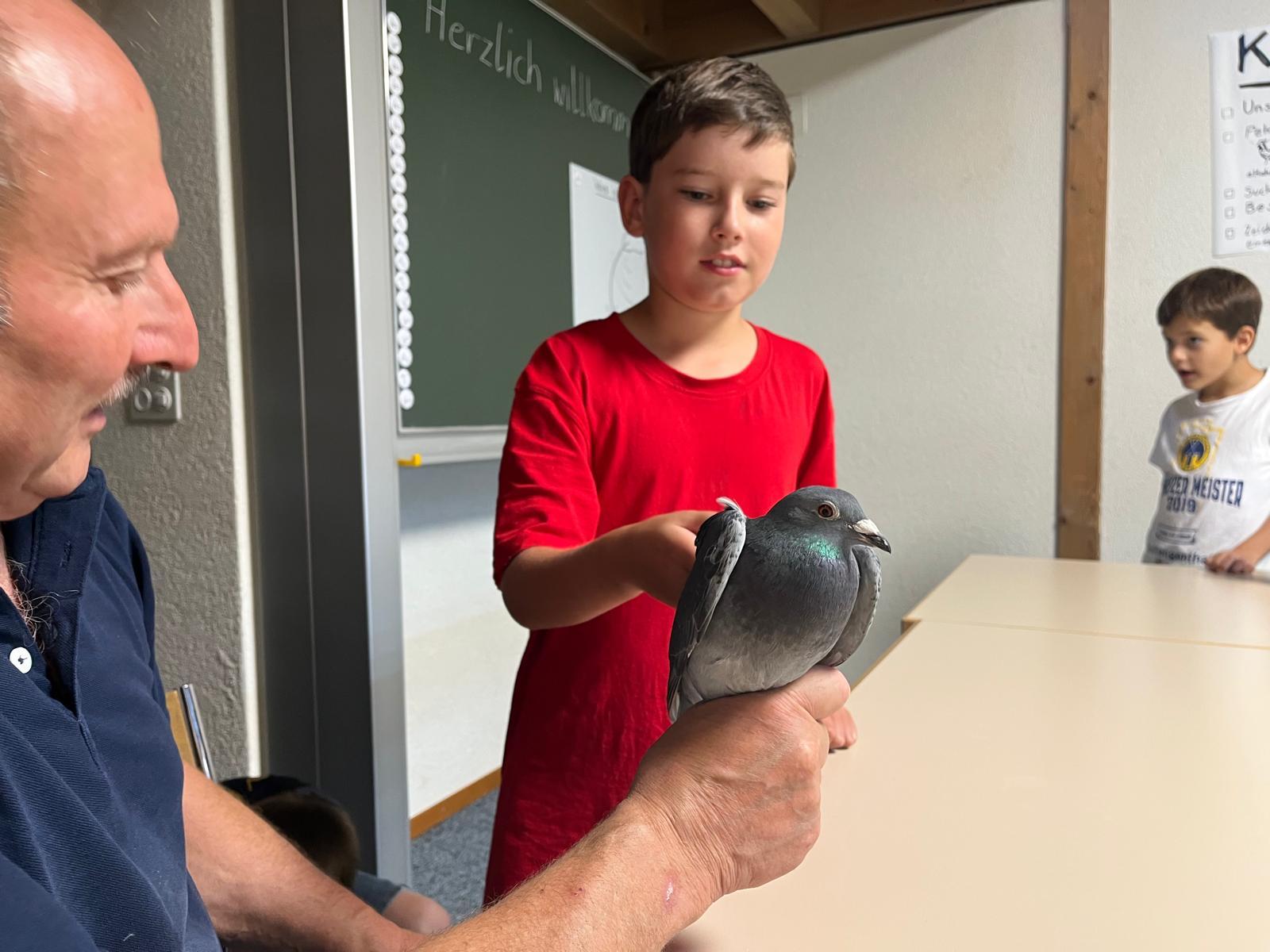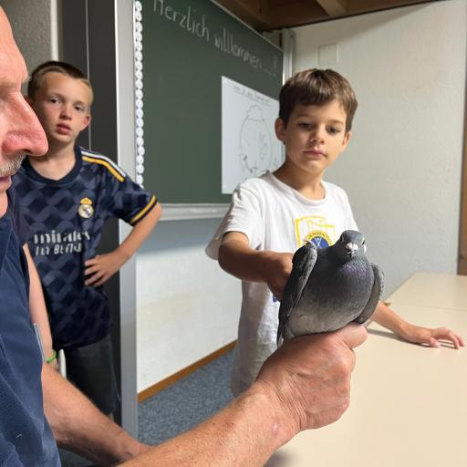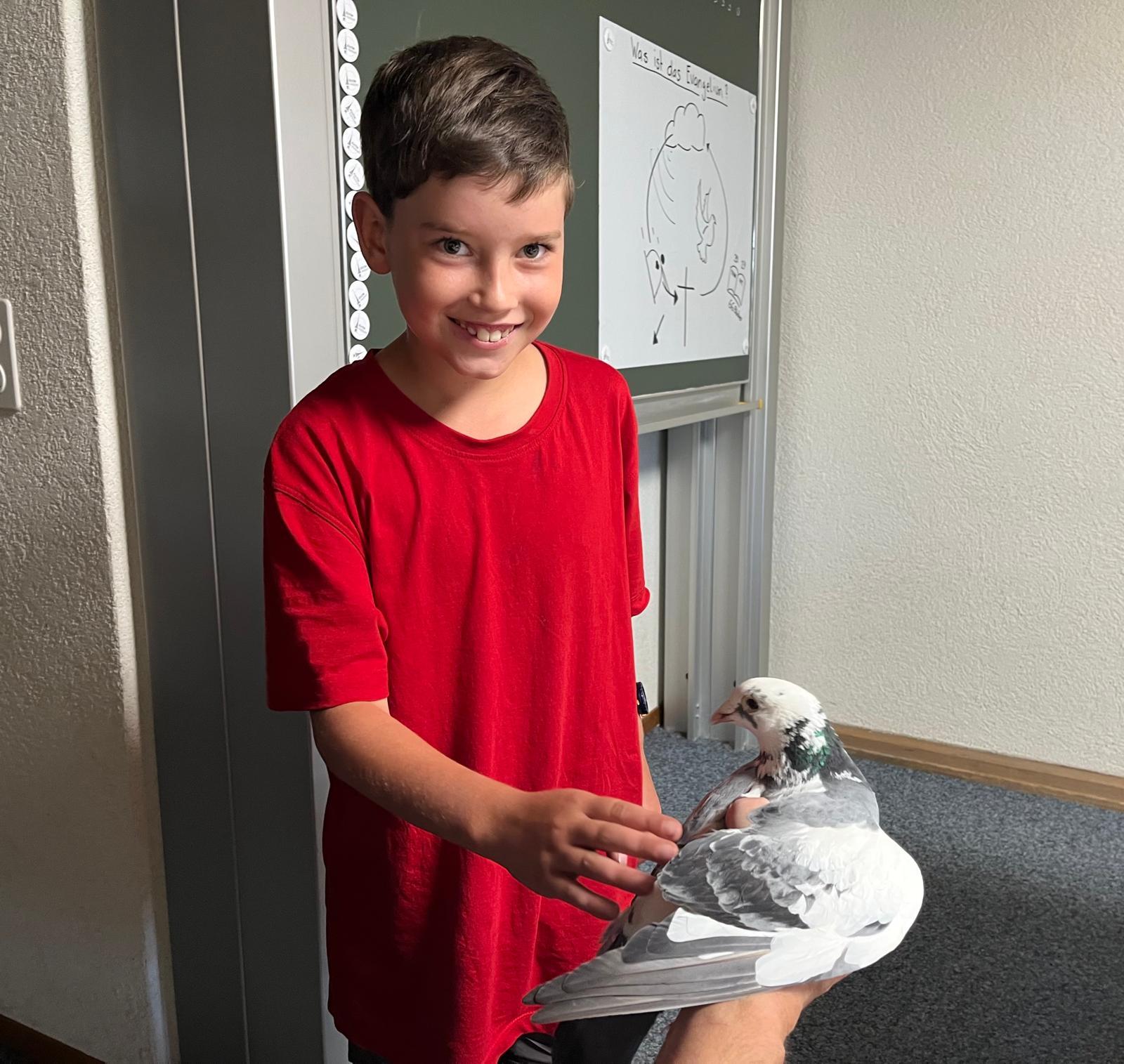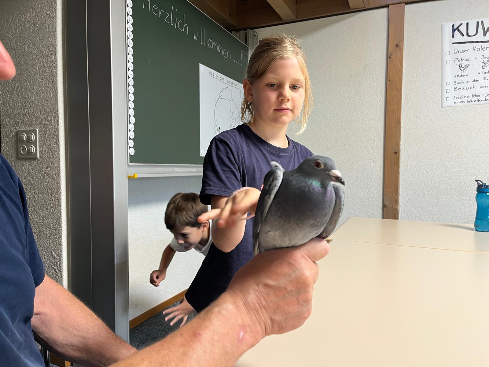 Heute durften wir in der KUW einen spannenden Besuch erleben: Herr Hansruedi Jost aus Madiswil kam zu uns und brachte drei Tiere mit, einen Maran-Hahn und zwei Brieftauben, ein Weibchen und ein Männchen. Herr Jost erzählte uns viel Interessantes über die Tiere. Die Brieftauben sind besonders treu: Ein Taubenpaar bleibt ein Leben lang zusammen. Sie finden ihren Weg nach Hause, ausser wenn es neblig ist. Der Hahn hingegen lebt mit mehreren Hennen und kann bis zu neun Jahre alt werden, eine Taube sogar zehn. Auch die Bibel erzählt von Hahn und Taube: Der Hahn erinnert uns an Petrus, der Jesus dreimal verleugnete, bevor der Hahn krähte. Das machte Petrus traurig, und er bereute es. Die Taube ist ein Zeichen für Frieden und Gottes Nähe. Als Jesus getauft wurde, kam der Heilige Geist wie eine Taube vom Himmel herab. Das zeigt: Gott ist bei uns und liebt uns. So haben uns Hahn und Taube heute nicht nur viel über Tiere gelehrt, sondern auch über Freundschaft, Vergebung und Gottes Liebe.