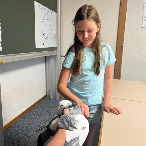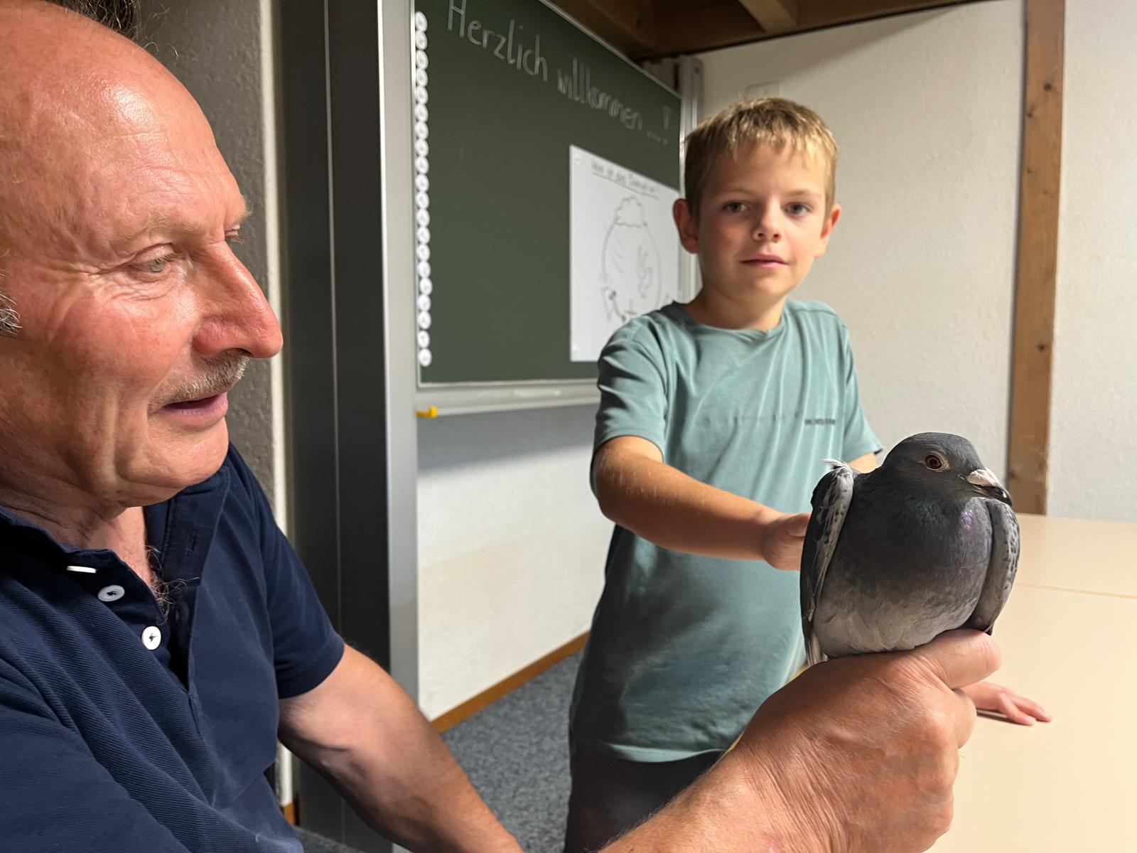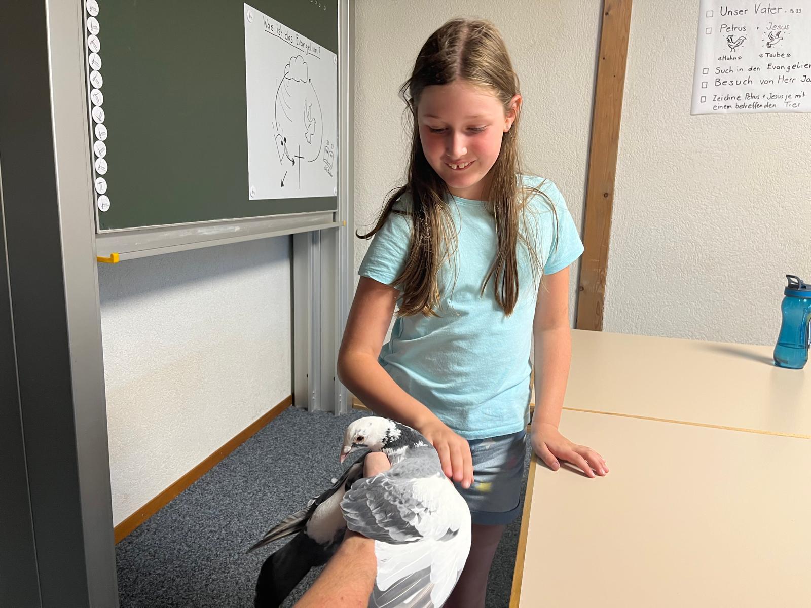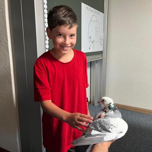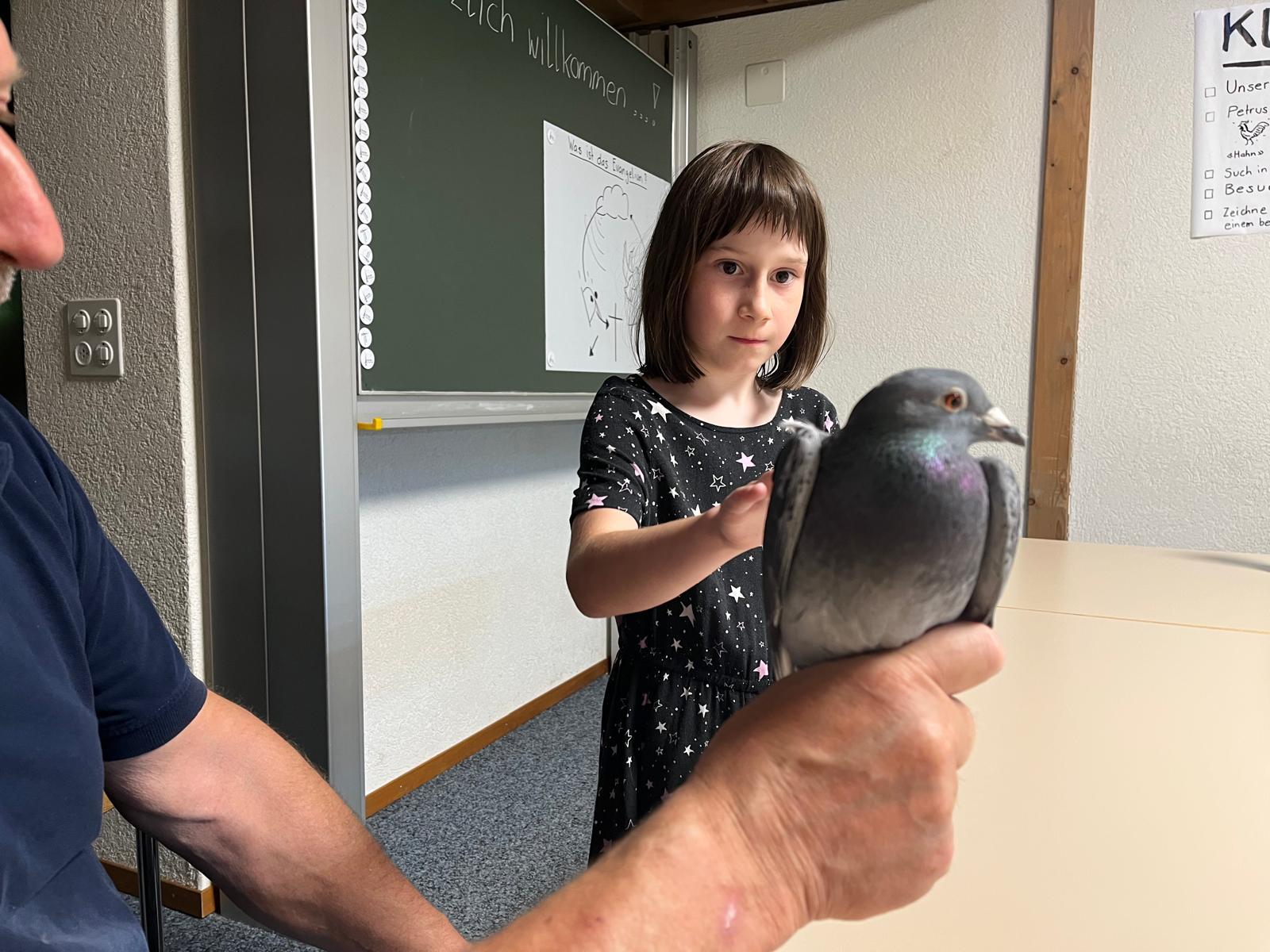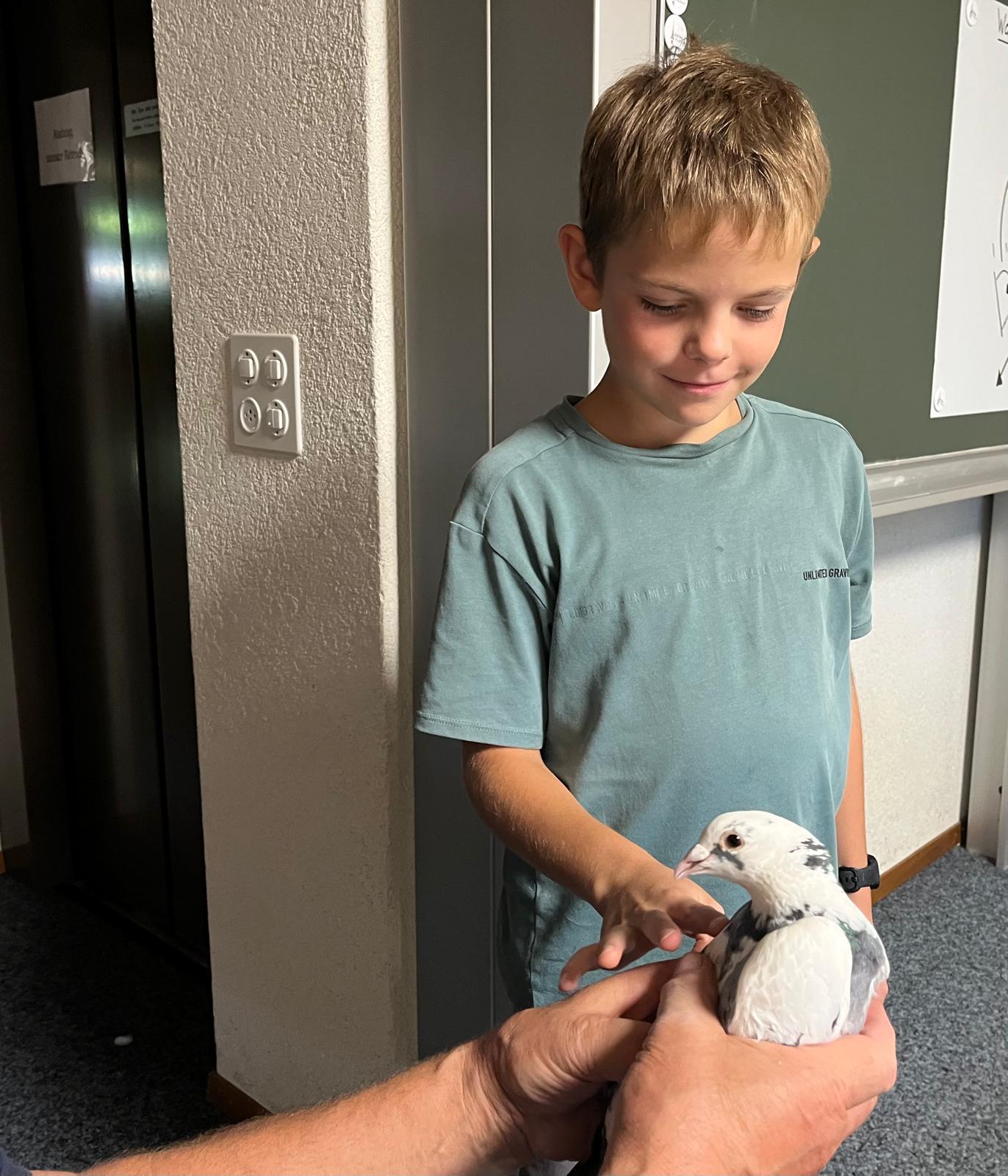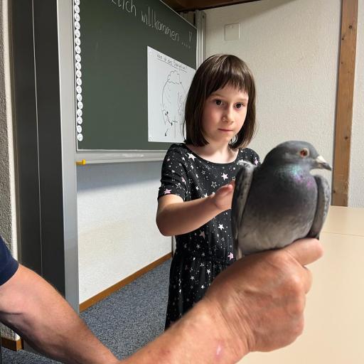 Heute durften wir in der KUW einen spannenden Besuch erleben: Herr Hansruedi Jost aus Madiswil kam zu uns und brachte drei Tiere mit, einen Maran-Hahn und zwei Brieftauben, ein Weibchen und ein Männchen. Herr Jost erzählte uns viel Interessantes über die Tiere. Die Brieftauben sind besonders treu: Ein Taubenpaar bleibt ein Leben lang zusammen. Sie finden ihren Weg nach Hause, ausser wenn es neblig ist. Der Hahn hingegen lebt mit mehreren Hennen und kann bis zu neun Jahre alt werden, eine Taube sogar zehn. Auch die Bibel erzählt von Hahn und Taube: Der Hahn erinnert uns an Petrus, der Jesus dreimal verleugnete, bevor der Hahn krähte. Das machte Petrus traurig, und er bereute es. Die Taube ist ein Zeichen für Frieden und Gottes Nähe. Als Jesus getauft wurde, kam der Heilige Geist wie eine Taube vom Himmel herab. Das zeigt: Gott ist bei uns und liebt uns. So haben uns Hahn und Taube heute nicht nur viel über Tiere gelehrt, sondern auch über Freundschaft, Vergebung und Gottes Liebe.