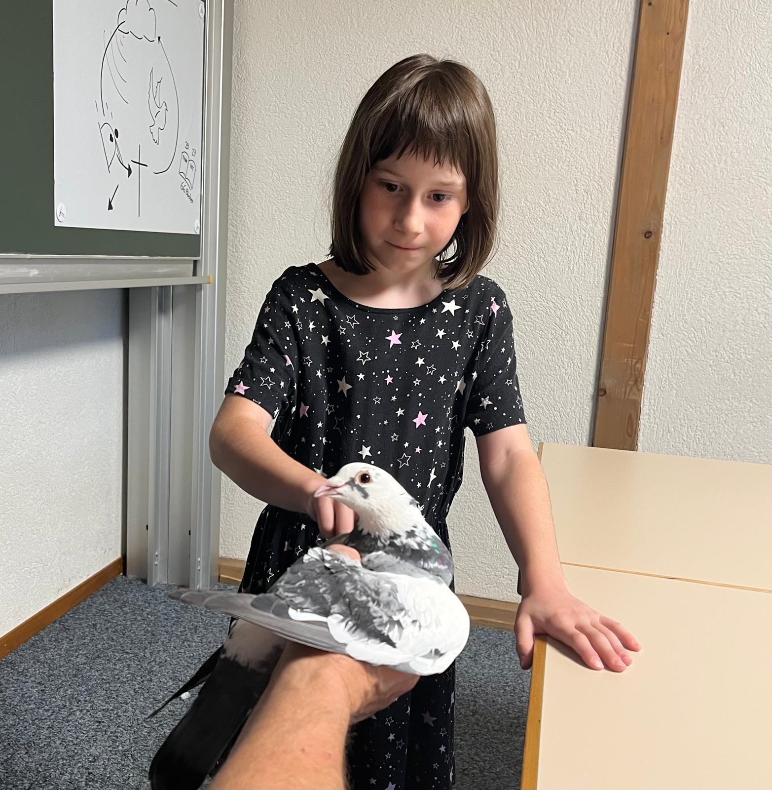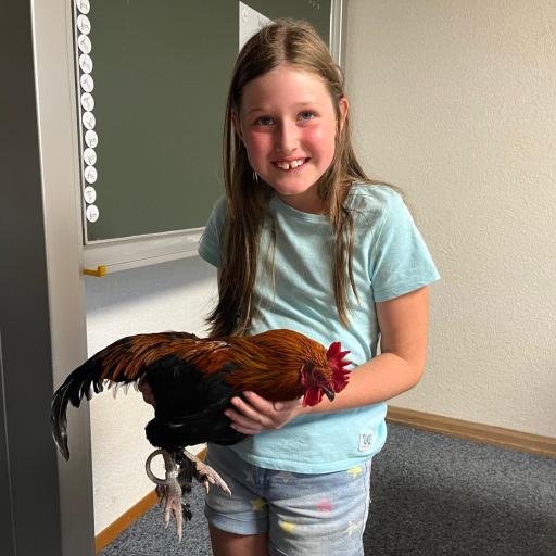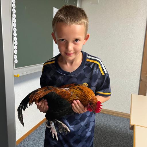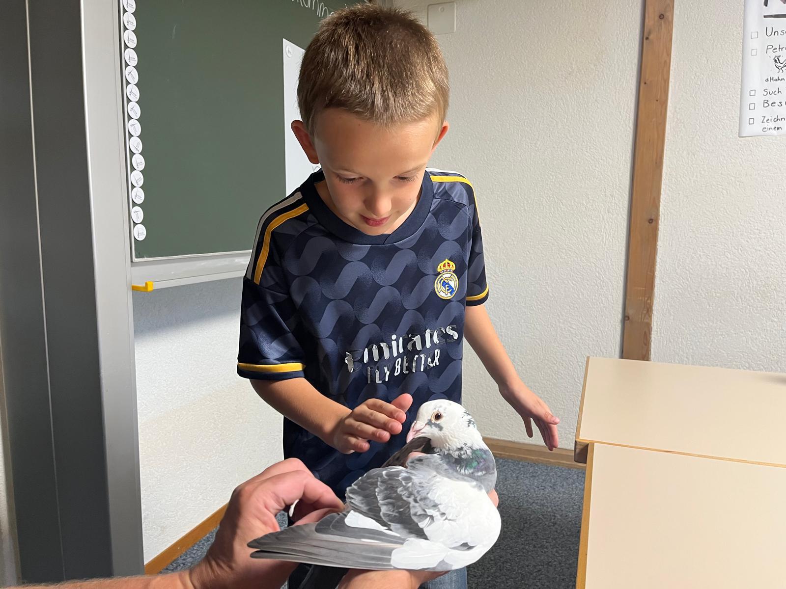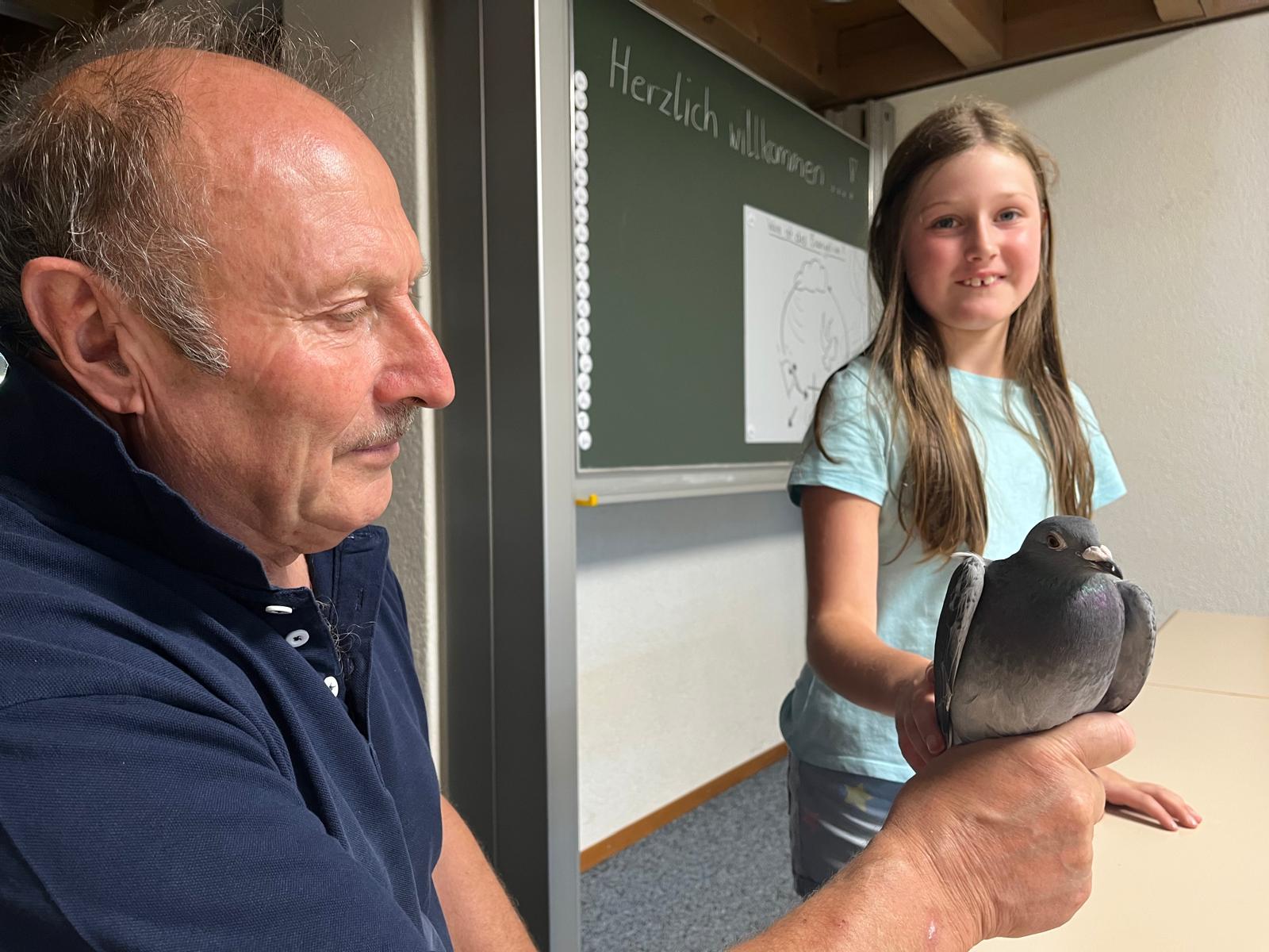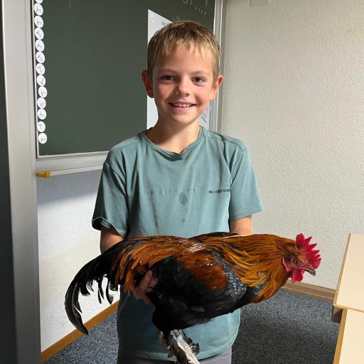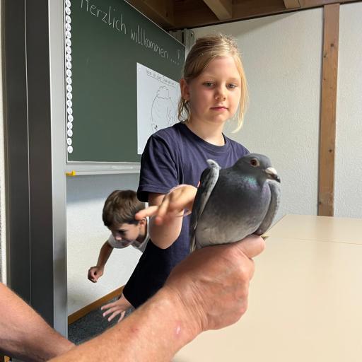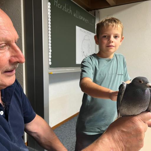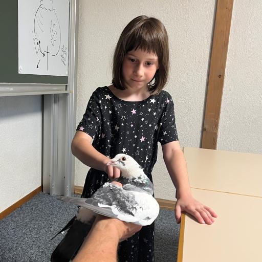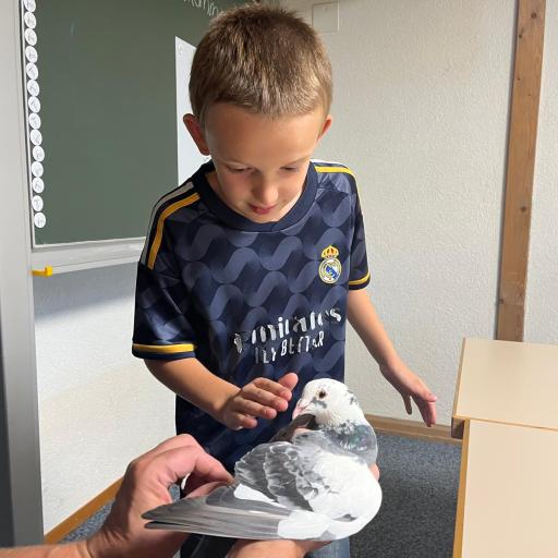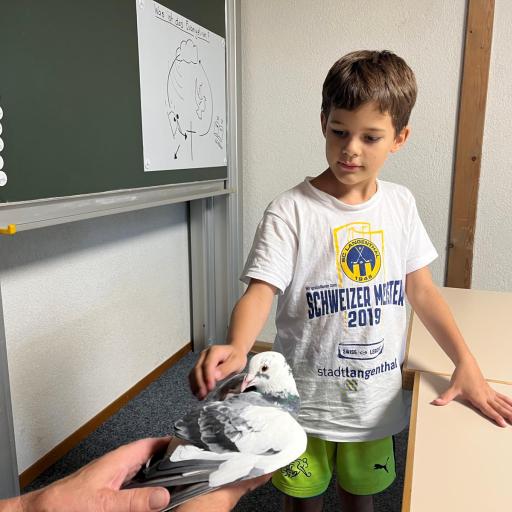 Heute durften wir in der KUW einen spannenden Besuch erleben: Herr Hansruedi Jost aus Madiswil kam zu uns und brachte drei Tiere mit, einen Maran-Hahn und zwei Brieftauben, ein Weibchen und ein Männchen. Herr Jost erzählte uns viel Interessantes über die Tiere. Die Brieftauben sind besonders treu: Ein Taubenpaar bleibt ein Leben lang zusammen. Sie finden ihren Weg nach Hause, ausser wenn es neblig ist. Der Hahn hingegen lebt mit mehreren Hennen und kann bis zu neun Jahre alt werden, eine Taube sogar zehn. Auch die Bibel erzählt von Hahn und Taube: Der Hahn erinnert uns an Petrus, der Jesus dreimal verleugnete, bevor der Hahn krähte. Das machte Petrus traurig, und er bereute es. Die Taube ist ein Zeichen für Frieden und Gottes Nähe. Als Jesus getauft wurde, kam der Heilige Geist wie eine Taube vom Himmel herab. Das zeigt: Gott ist bei uns und liebt uns. So haben uns Hahn und Taube heute nicht nur viel über Tiere gelehrt, sondern auch über Freundschaft, Vergebung und Gottes Liebe.