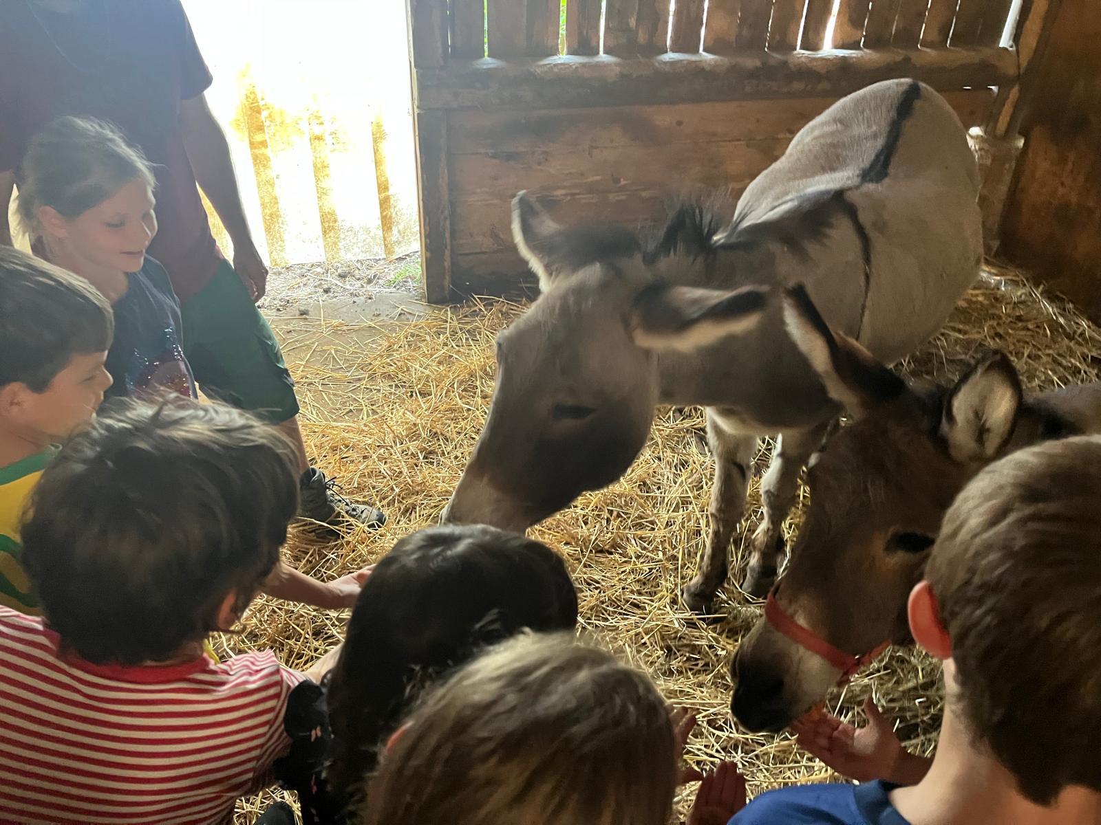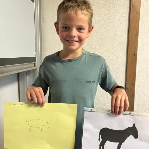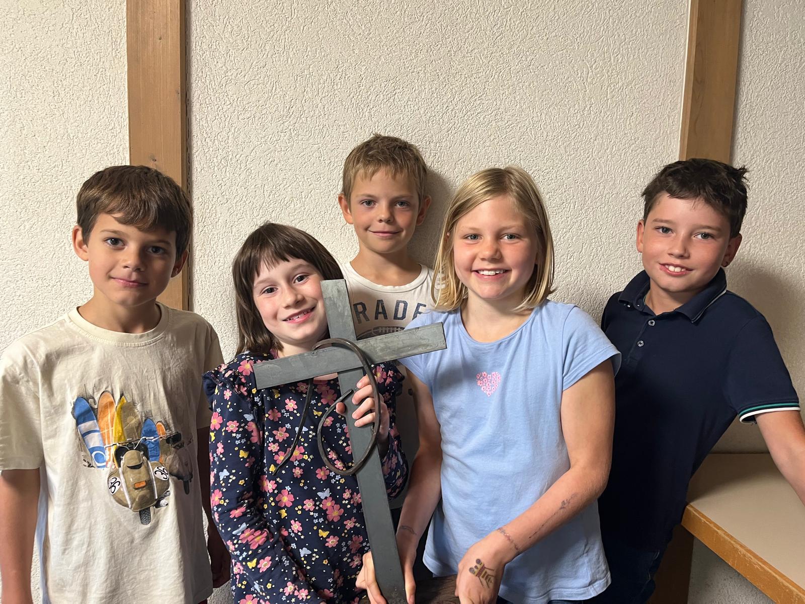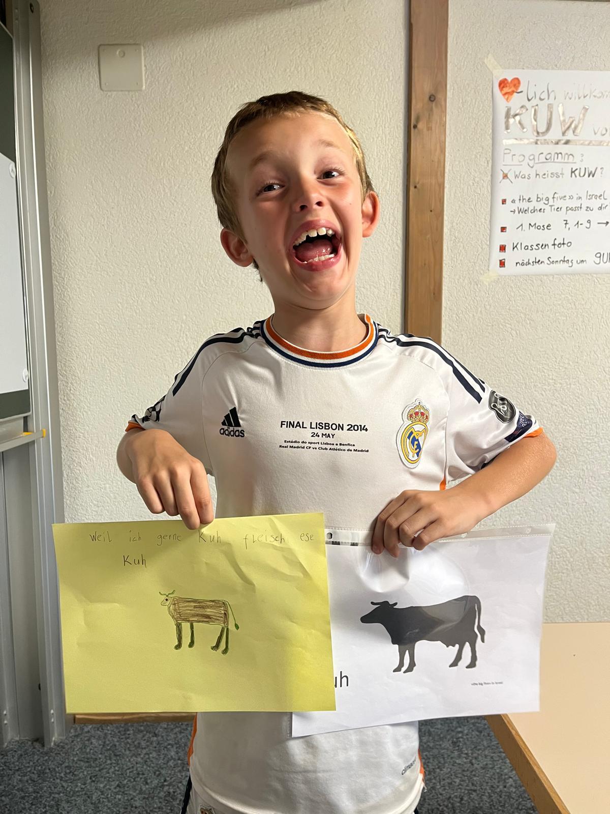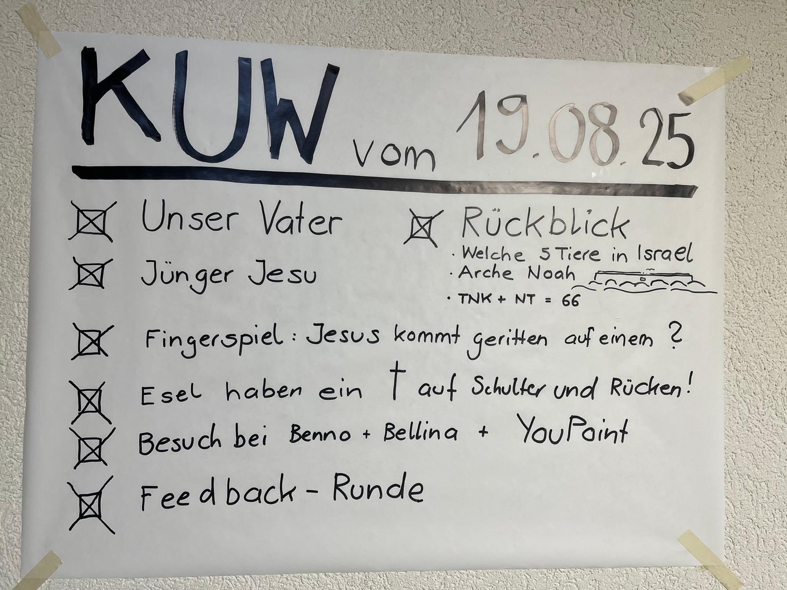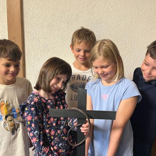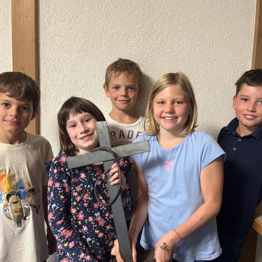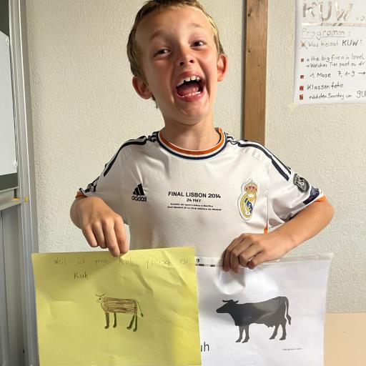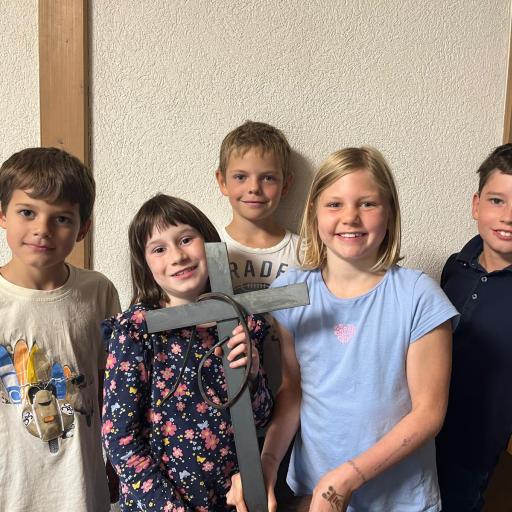 Heute haben wir gemeinsam einen spannenden KUW-Nachmittag erlebt. Wir starteten mit dem «Unser Vater»-Gebet und erinnerten uns an die Geschichte von letzten Sonntag im Gottesdienst vom Jünger Philippus. Er erklärte einem äthiopischen Beamten die Botschaft von Jesus und taufte ihn in einem Fluss. Der Mann fuhr danach voller Freude nach Hause. Wir sprachen über die fünf Tiere Israels, die Arche Noah und die Bibel mit ihren 66 Büchern, dem Tanach und dem Neuen Testament. Besonders spannend war das Kennenlernen der 12 Jünger Jesu. Wir hörten, wie Jesus auf einem Esel nach Jerusalem ritt. Passend dazu besuchten wir den Biohof von Niklaus und Barbara Badertscher. Dort durften wir die beiden Esel «Benno» und «Bellina» streicheln und füttern. Niklaus erzählte uns mit viel Wissen über diese besonderen Tiere. Beide tragen ein Kreuz auf dem Rücken. Ein Zeichen, das uns an Jesus erinnert. Wir sprachen auch darüber, wie Jesus am Kreuz gestorben ist, um uns mit Gott zu versöhnen und uns neues Leben zu schenken. Ein weiterer schöner Augenblick war das kleine Jerseykalb «YouPoint» begrüssen und streicheln zu dürfen. Es trägt den Namen unseres Jugendraums, den wir ab der 7. Klasse besuchen dürfen. Zum Abschluss auf dem Biohof wurden wir mit frischer Bio-Milch und Bio-Apfelsaft durch Barbara verwöhnt. Ein Genuss für alle Sinne! Zurück im Unterrichtszimmer rundeten wir den Tag mit dem Fingerspiel «Jesus kommt geritten» ab. So konnten wir die Erlebnisse spielerisch nachfühlen.