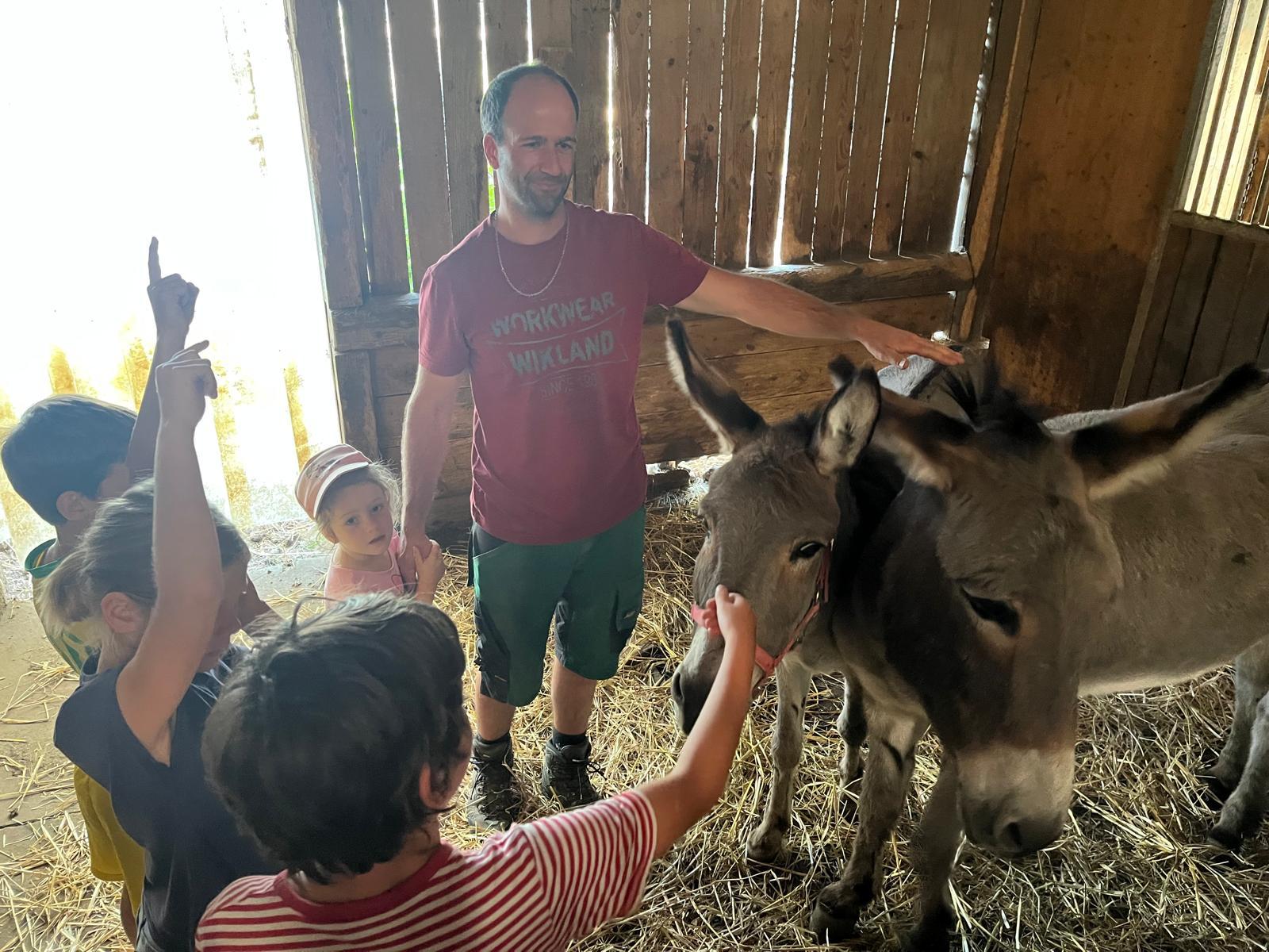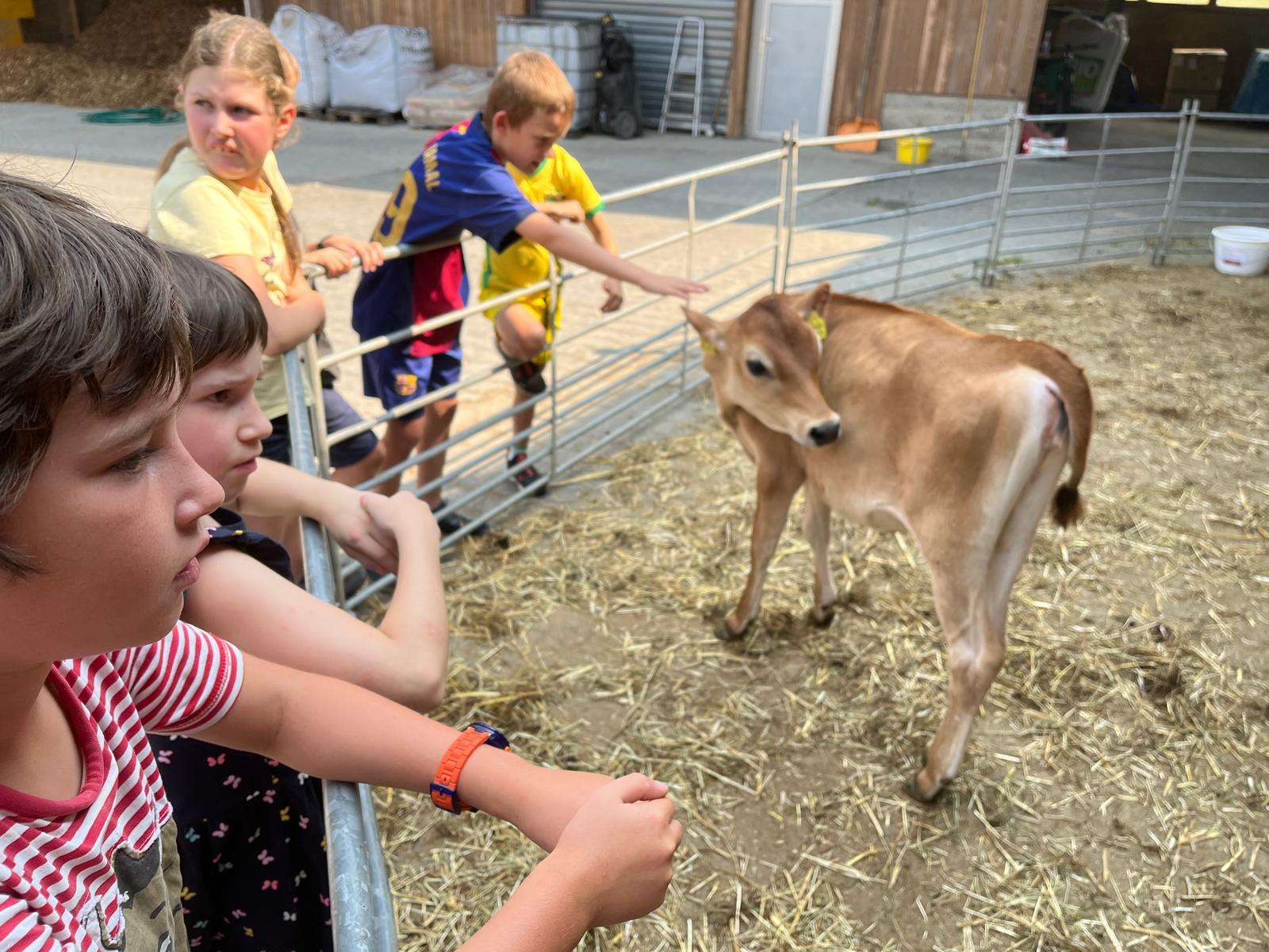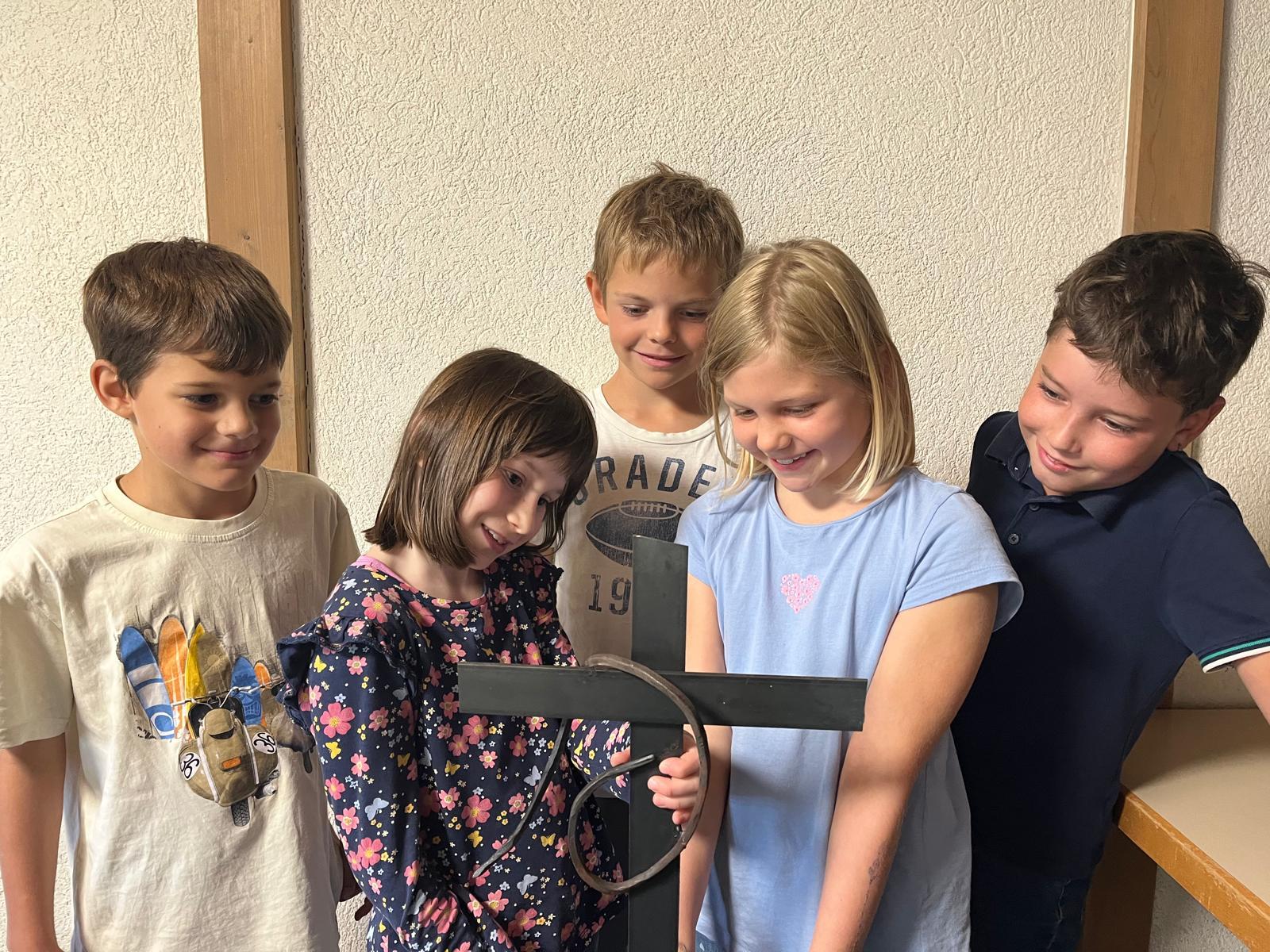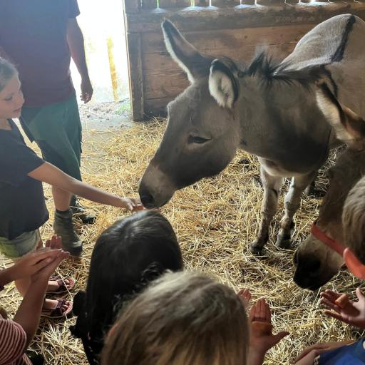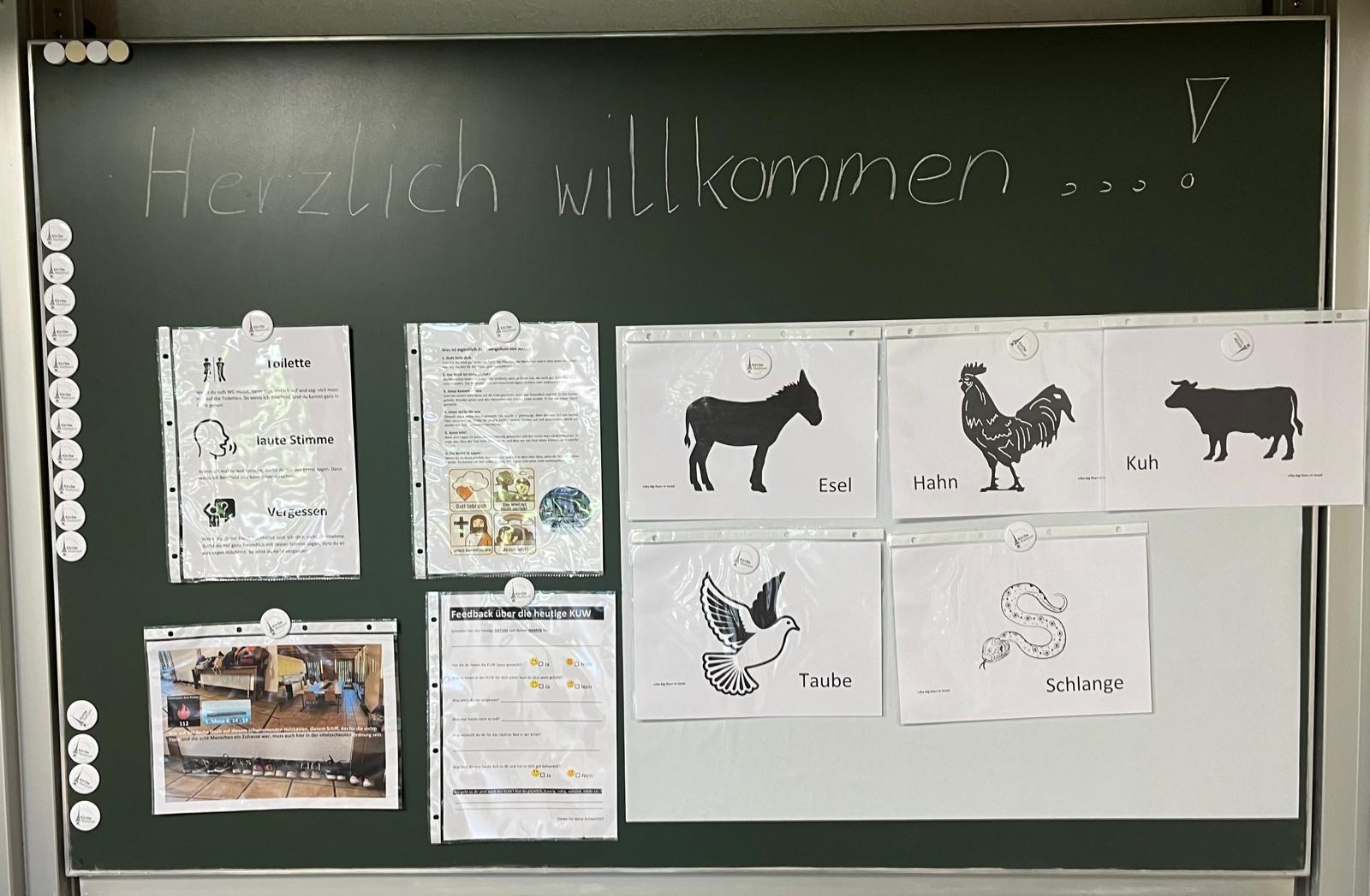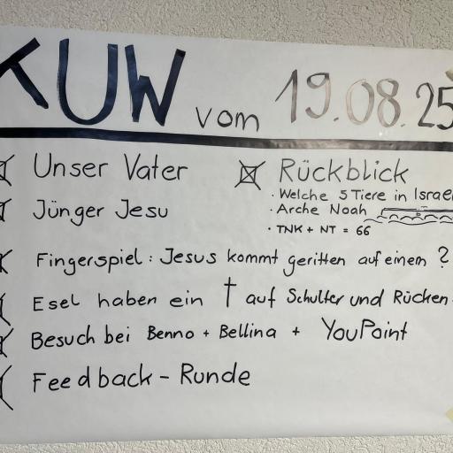 Heute haben wir gemeinsam einen spannenden KUW-Nachmittag erlebt. Wir starteten mit dem «Unser Vater»-Gebet und erinnerten uns an die Geschichte von letzten Sonntag im Gottesdienst vom Jünger Philippus. Er erklärte einem äthiopischen Beamten die Botschaft von Jesus und taufte ihn in einem Fluss. Der Mann fuhr danach voller Freude nach Hause. Wir sprachen über die fünf Tiere Israels, die Arche Noah und die Bibel mit ihren 66 Büchern, dem Tanach und dem Neuen Testament. Besonders spannend war das Kennenlernen der 12 Jünger Jesu. Wir hörten, wie Jesus auf einem Esel nach Jerusalem ritt. Passend dazu besuchten wir den Biohof von Niklaus und Barbara Badertscher. Dort durften wir die beiden Esel «Benno» und «Bellina» streicheln und füttern. Niklaus erzählte uns mit viel Wissen über diese besonderen Tiere. Beide tragen ein Kreuz auf dem Rücken. Ein Zeichen, das uns an Jesus erinnert. Wir sprachen auch darüber, wie Jesus am Kreuz gestorben ist, um uns mit Gott zu versöhnen und uns neues Leben zu schenken. Ein weiterer schöner Augenblick war das kleine Jerseykalb «YouPoint» begrüssen und streicheln zu dürfen. Es trägt den Namen unseres Jugendraums, den wir ab der 7. Klasse besuchen dürfen. Zum Abschluss auf dem Biohof wurden wir mit frischer Bio-Milch und Bio-Apfelsaft durch Barbara verwöhnt. Ein Genuss für alle Sinne! Zurück im Unterrichtszimmer rundeten wir den Tag mit dem Fingerspiel «Jesus kommt geritten» ab. So konnten wir die Erlebnisse spielerisch nachfühlen.