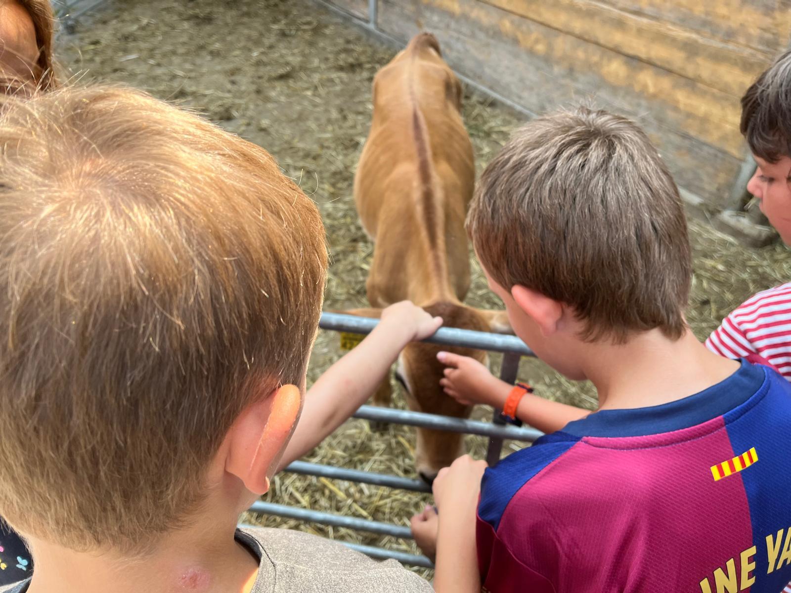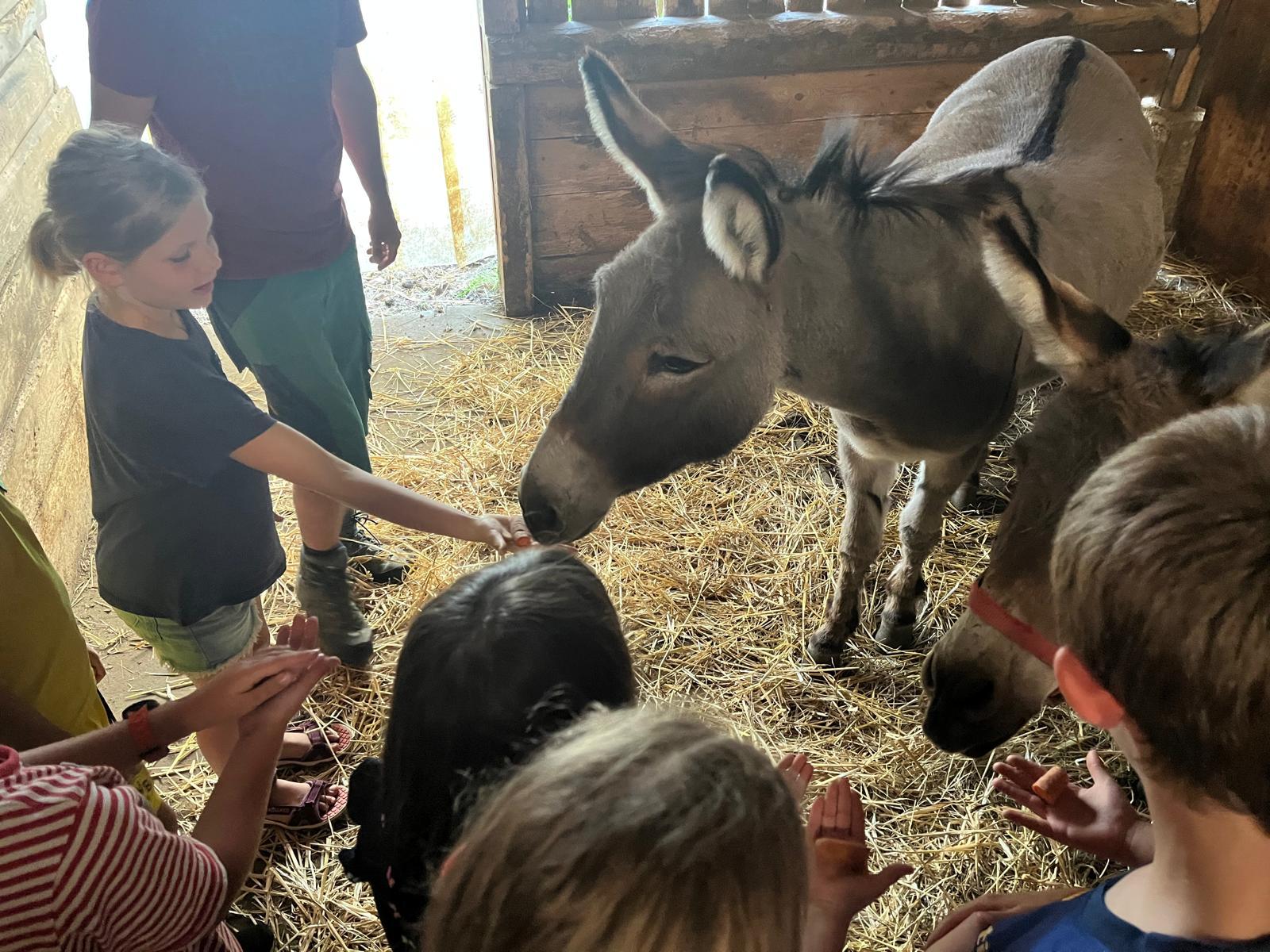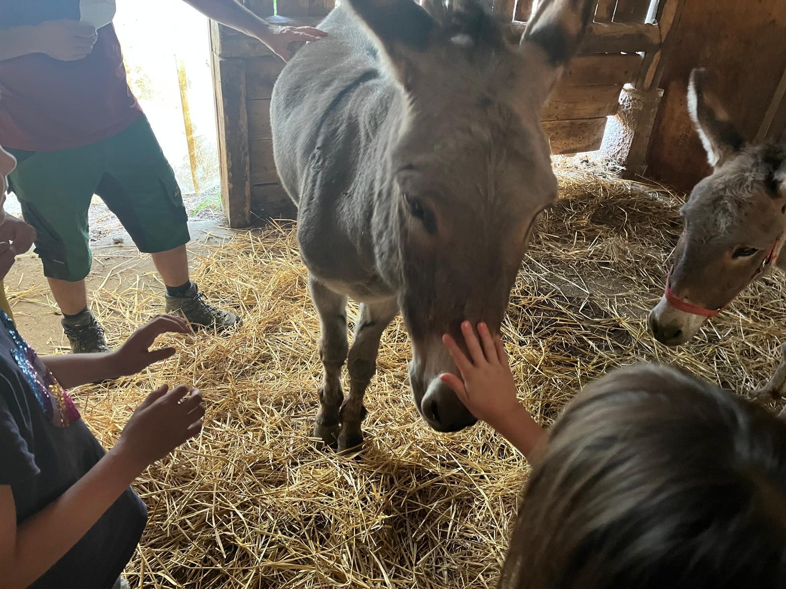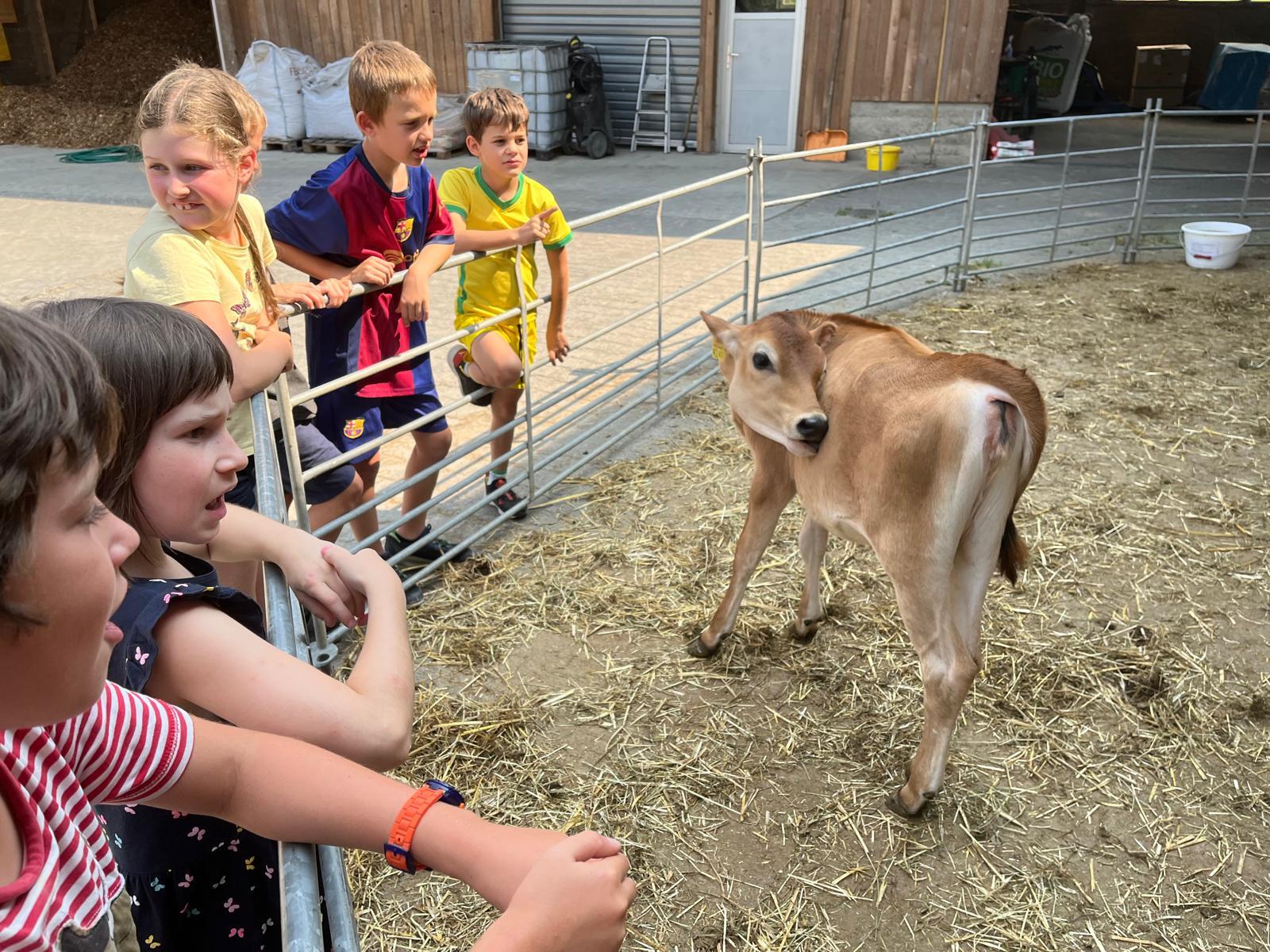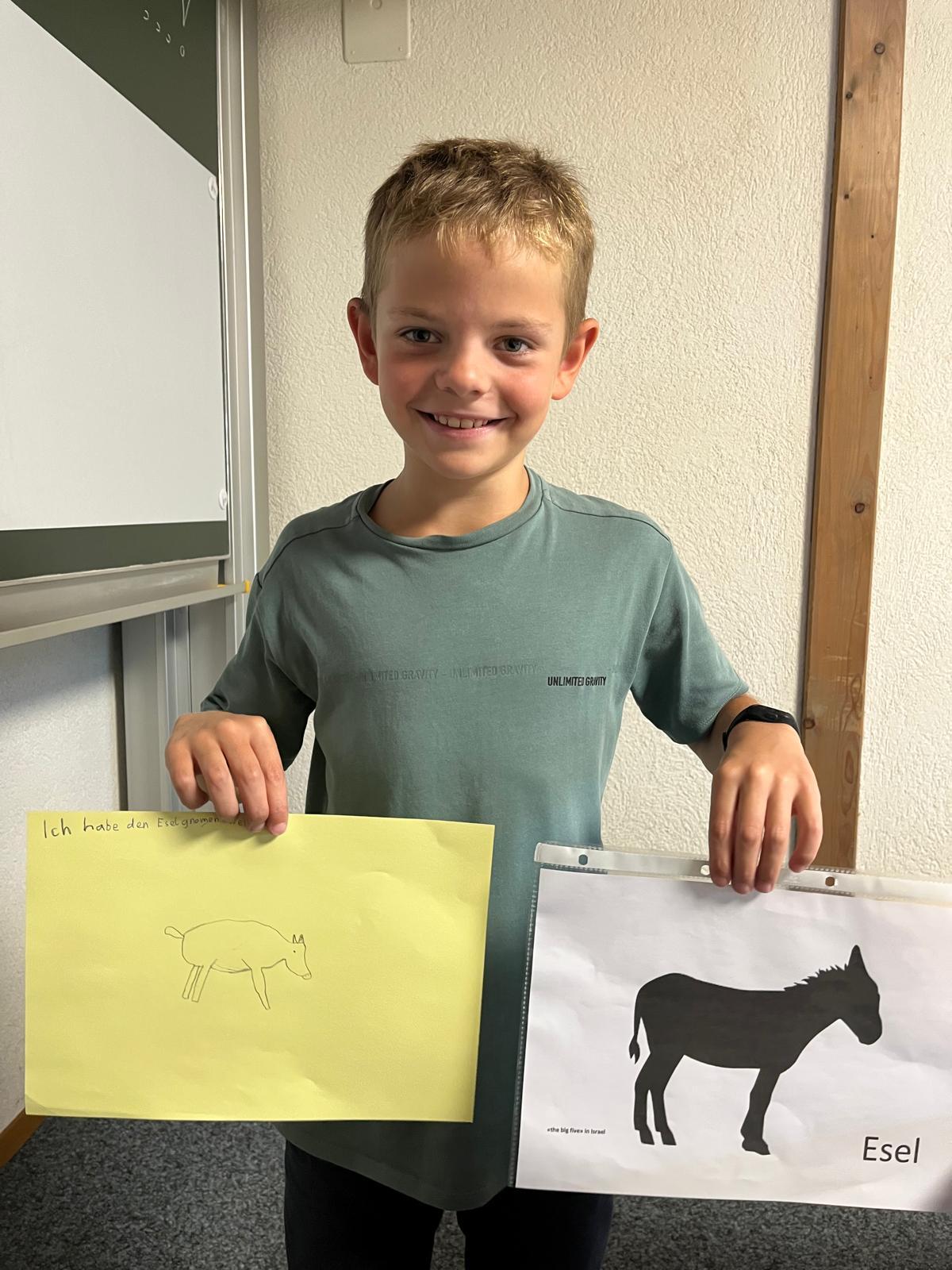 Heute haben wir gemeinsam einen spannenden KUW-Nachmittag erlebt. Wir starteten mit dem «Unser Vater»-Gebet und erinnerten uns an die Geschichte von letzten Sonntag im Gottesdienst vom Jünger Philippus. Er erklärte einem äthiopischen Beamten die Botschaft von Jesus und taufte ihn in einem Fluss. Der Mann fuhr danach voller Freude nach Hause. Wir sprachen über die fünf Tiere Israels, die Arche Noah und die Bibel mit ihren 66 Büchern, dem Tanach und dem Neuen Testament. Besonders spannend war das Kennenlernen der 12 Jünger Jesu. Wir hörten, wie Jesus auf einem Esel nach Jerusalem ritt. Passend dazu besuchten wir den Biohof von Niklaus und Barbara Badertscher. Dort durften wir die beiden Esel «Benno» und «Bellina» streicheln und füttern. Niklaus erzählte uns mit viel Wissen über diese besonderen Tiere. Beide tragen ein Kreuz auf dem Rücken. Ein Zeichen, das uns an Jesus erinnert. Wir sprachen auch darüber, wie Jesus am Kreuz gestorben ist, um uns mit Gott zu versöhnen und uns neues Leben zu schenken. Ein weiterer schöner Augenblick war das kleine Jerseykalb «YouPoint» begrüssen und streicheln zu dürfen. Es trägt den Namen unseres Jugendraums, den wir ab der 7. Klasse besuchen dürfen. Zum Abschluss auf dem Biohof wurden wir mit frischer Bio-Milch und Bio-Apfelsaft durch Barbara verwöhnt. Ein Genuss für alle Sinne! Zurück im Unterrichtszimmer rundeten wir den Tag mit dem Fingerspiel «Jesus kommt geritten» ab. So konnten wir die Erlebnisse spielerisch nachfühlen.