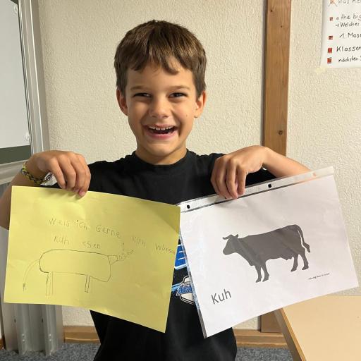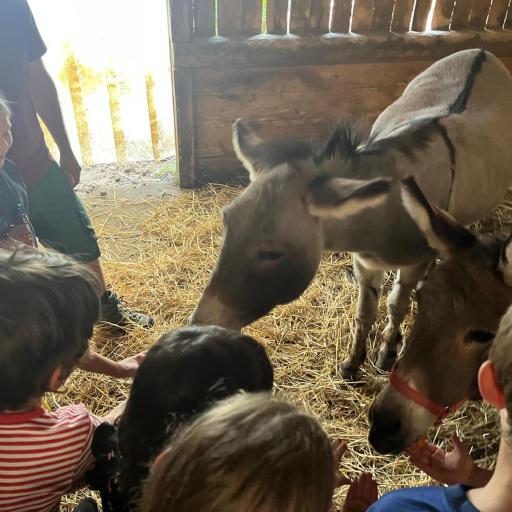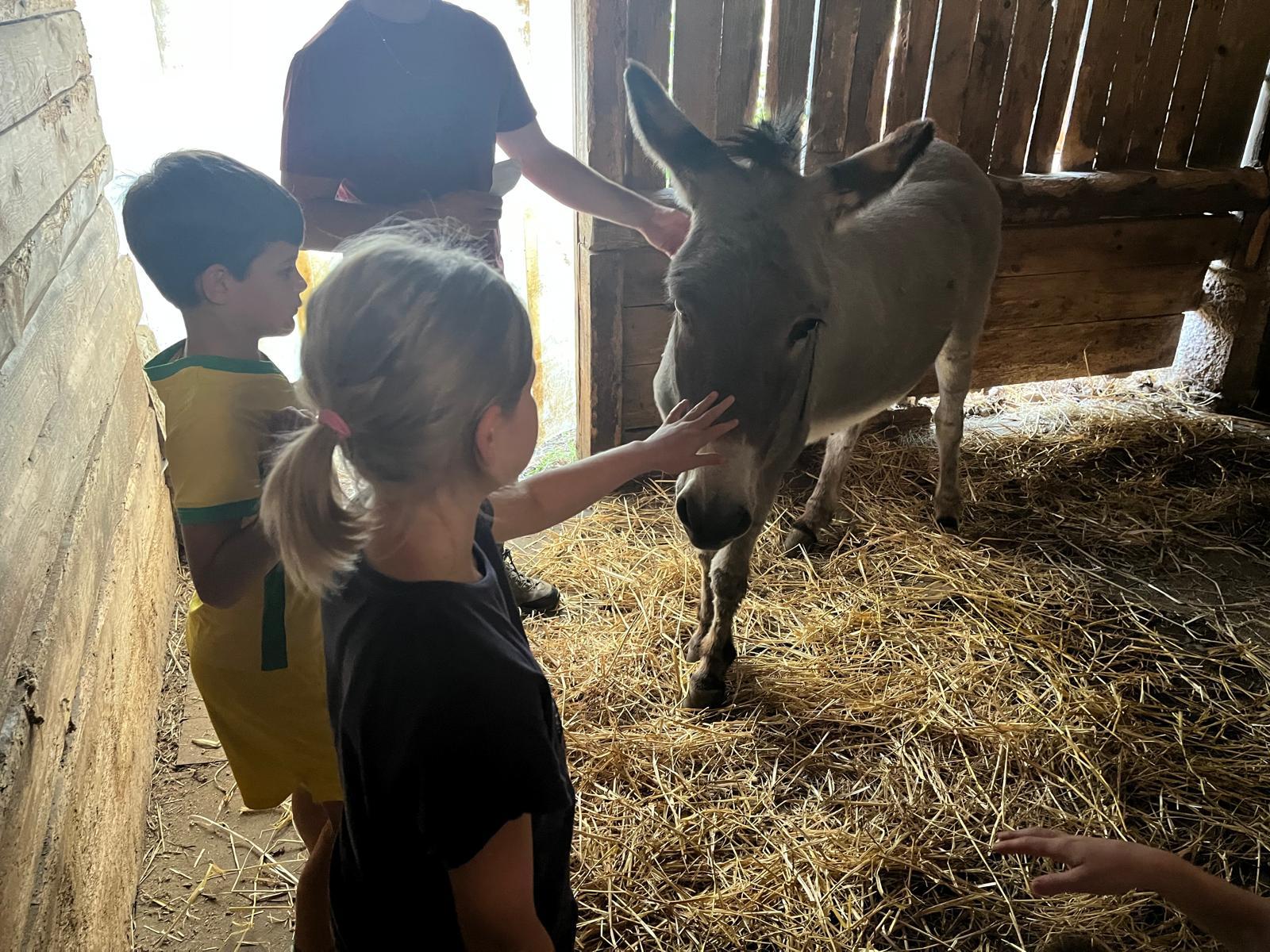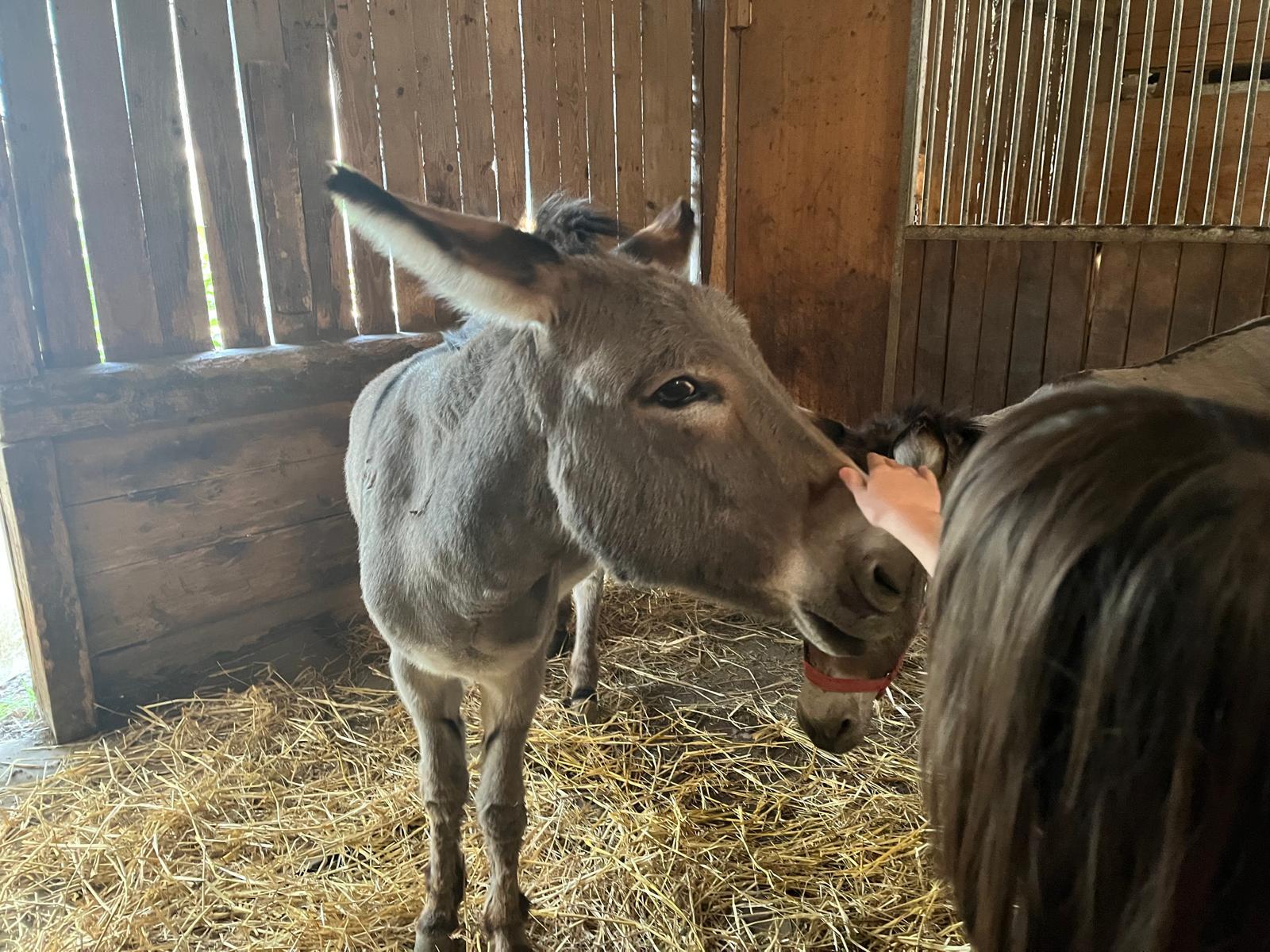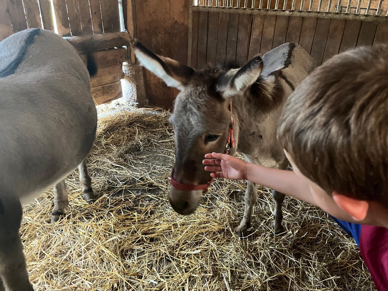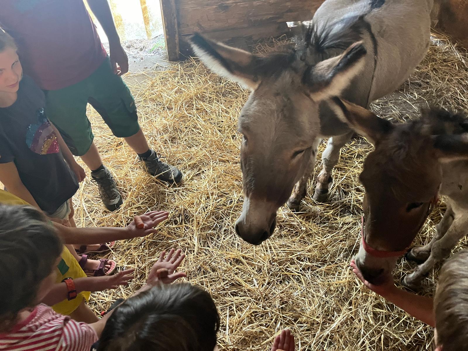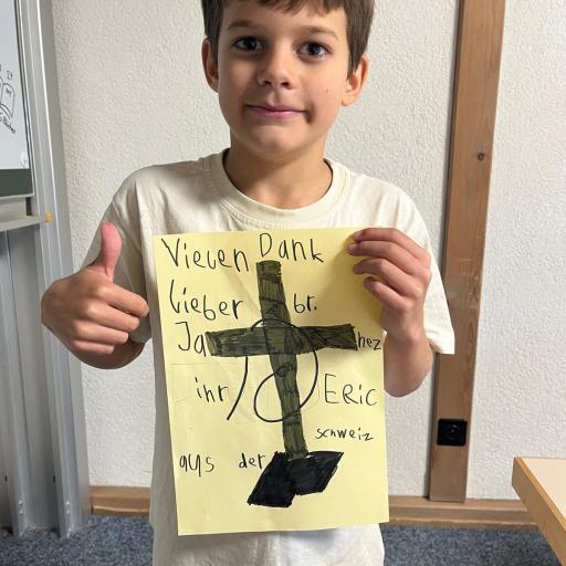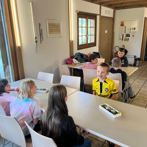 Heute haben wir gemeinsam einen spannenden KUW-Nachmittag erlebt. Wir starteten mit dem «Unser Vater»-Gebet und erinnerten uns an die Geschichte von letzten Sonntag im Gottesdienst vom Jünger Philippus. Er erklärte einem äthiopischen Beamten die Botschaft von Jesus und taufte ihn in einem Fluss. Der Mann fuhr danach voller Freude nach Hause. Wir sprachen über die fünf Tiere Israels, die Arche Noah und die Bibel mit ihren 66 Büchern, dem Tanach und dem Neuen Testament. Besonders spannend war das Kennenlernen der 12 Jünger Jesu. Wir hörten, wie Jesus auf einem Esel nach Jerusalem ritt. Passend dazu besuchten wir den Biohof von Niklaus und Barbara Badertscher. Dort durften wir die beiden Esel «Benno» und «Bellina» streicheln und füttern. Niklaus erzählte uns mit viel Wissen über diese besonderen Tiere. Beide tragen ein Kreuz auf dem Rücken. Ein Zeichen, das uns an Jesus erinnert. Wir sprachen auch darüber, wie Jesus am Kreuz gestorben ist, um uns mit Gott zu versöhnen und uns neues Leben zu schenken. Ein weiterer schöner Augenblick war das kleine Jerseykalb «YouPoint» begrüssen und streicheln zu dürfen. Es trägt den Namen unseres Jugendraums, den wir ab der 7. Klasse besuchen dürfen. Zum Abschluss auf dem Biohof wurden wir mit frischer Bio-Milch und Bio-Apfelsaft durch Barbara verwöhnt. Ein Genuss für alle Sinne! Zurück im Unterrichtszimmer rundeten wir den Tag mit dem Fingerspiel «Jesus kommt geritten» ab. So konnten wir die Erlebnisse spielerisch nachfühlen.