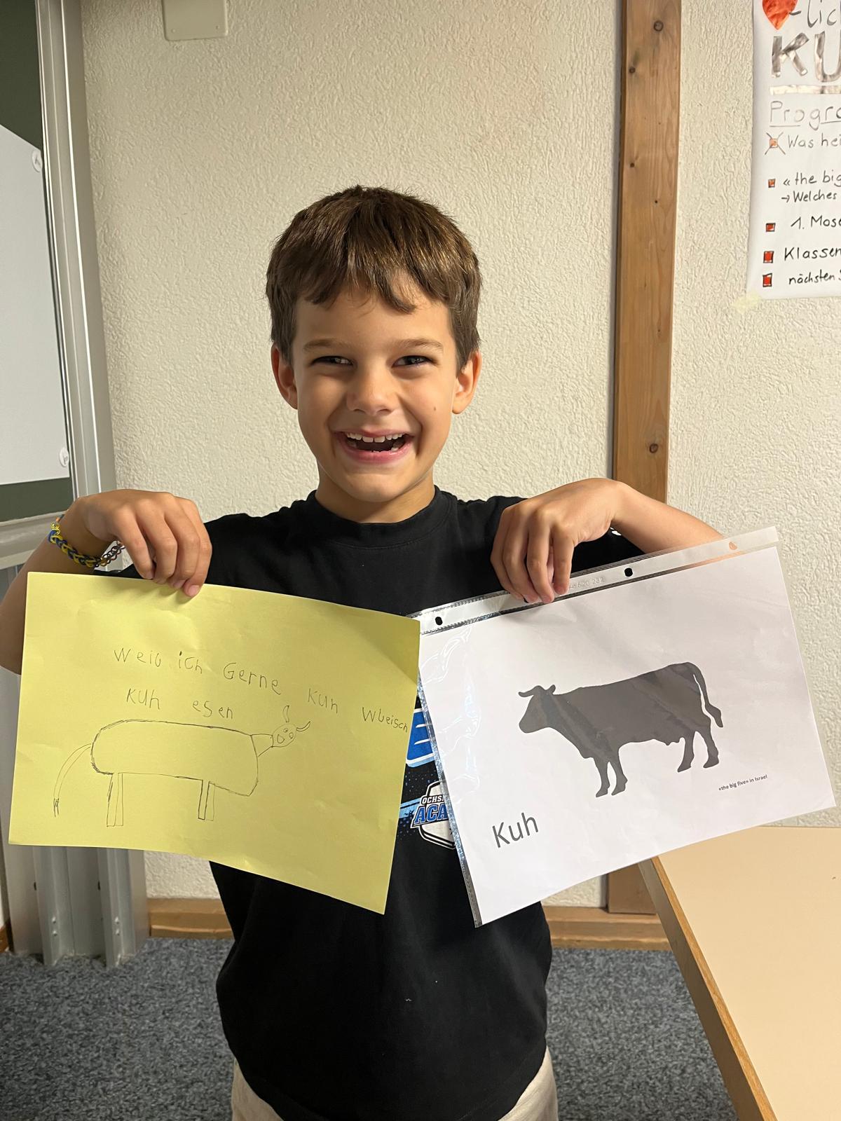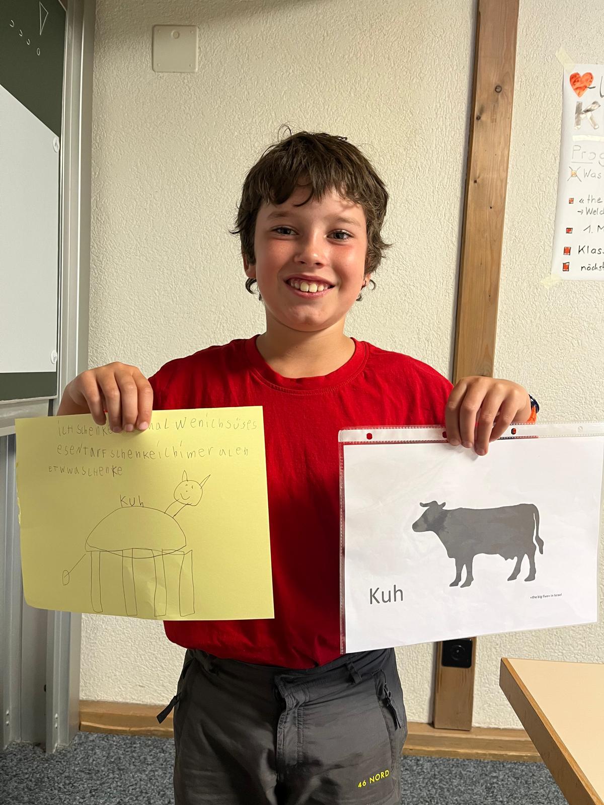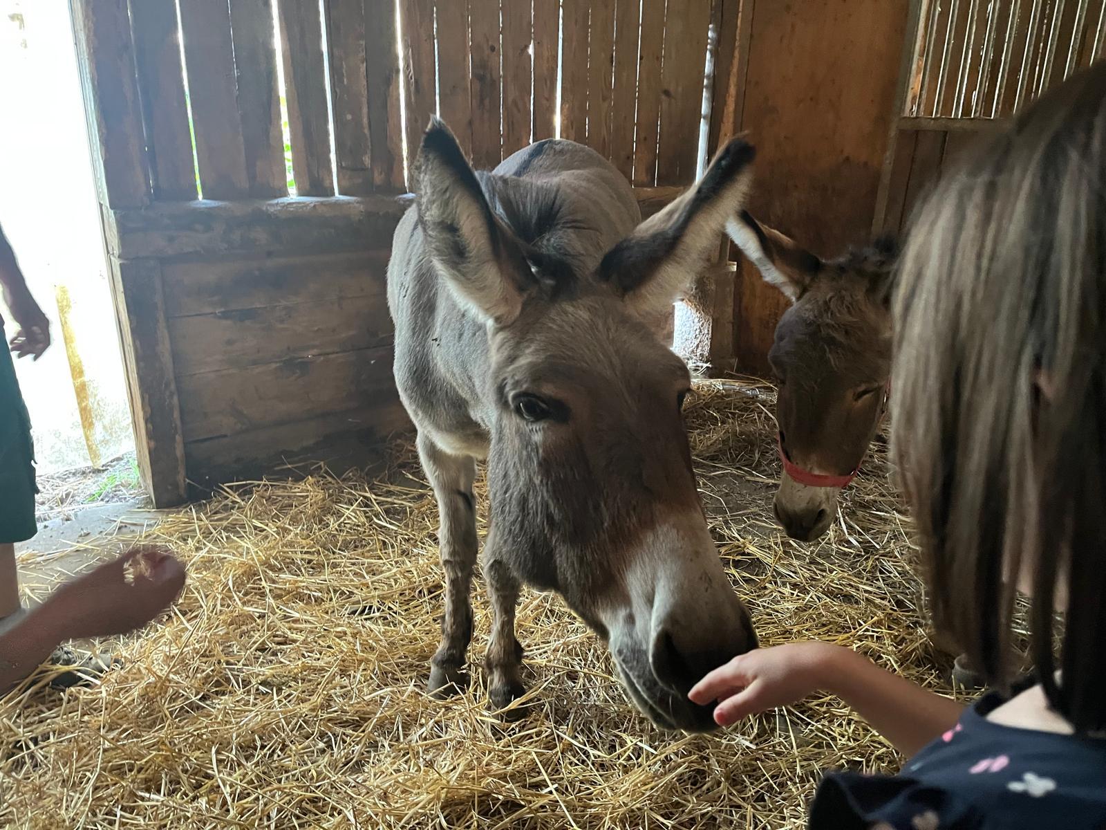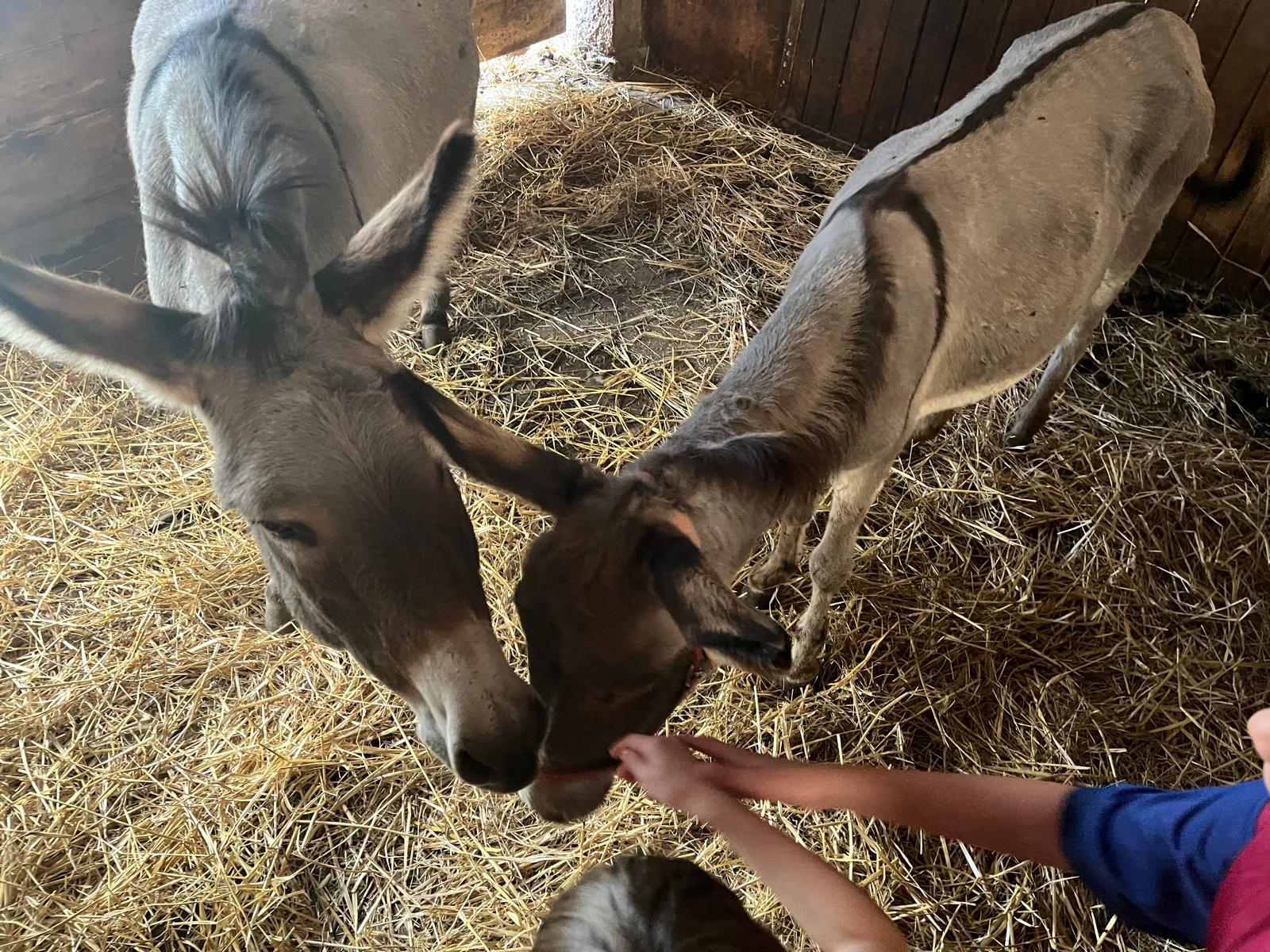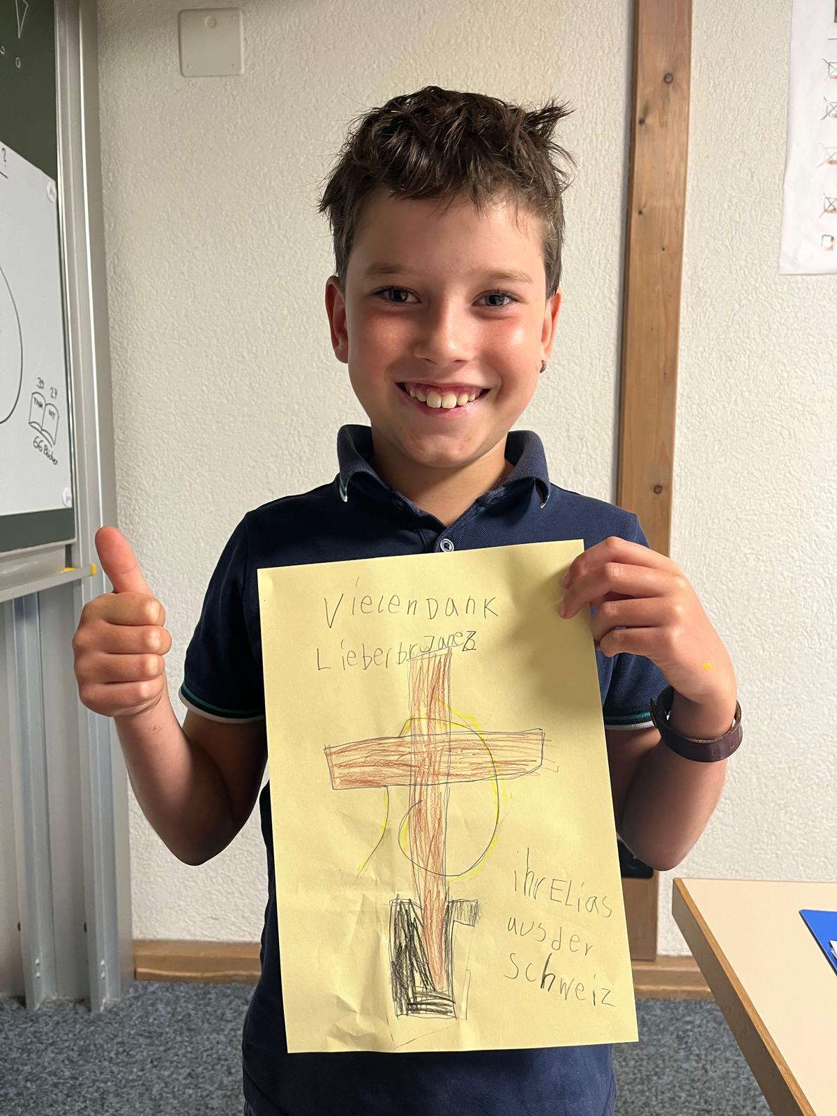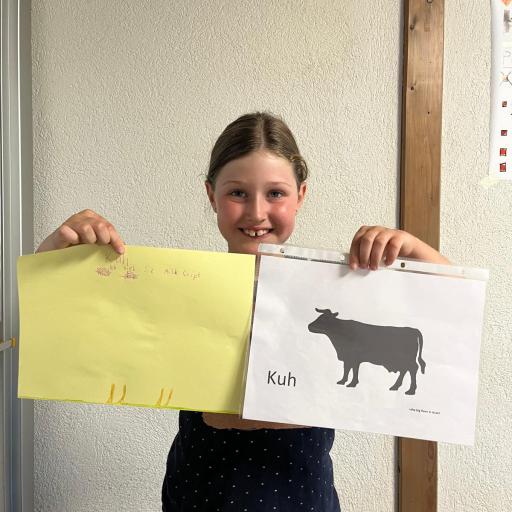 Heute haben wir gemeinsam einen spannenden KUW-Nachmittag erlebt. Wir starteten mit dem «Unser Vater»-Gebet und erinnerten uns an die Geschichte von letzten Sonntag im Gottesdienst vom Jünger Philippus. Er erklärte einem äthiopischen Beamten die Botschaft von Jesus und taufte ihn in einem Fluss. Der Mann fuhr danach voller Freude nach Hause. Wir sprachen über die fünf Tiere Israels, die Arche Noah und die Bibel mit ihren 66 Büchern, dem Tanach und dem Neuen Testament. Besonders spannend war das Kennenlernen der 12 Jünger Jesu. Wir hörten, wie Jesus auf einem Esel nach Jerusalem ritt. Passend dazu besuchten wir den Biohof von Niklaus und Barbara Badertscher. Dort durften wir die beiden Esel «Benno» und «Bellina» streicheln und füttern. Niklaus erzählte uns mit viel Wissen über diese besonderen Tiere. Beide tragen ein Kreuz auf dem Rücken. Ein Zeichen, das uns an Jesus erinnert. Wir sprachen auch darüber, wie Jesus am Kreuz gestorben ist, um uns mit Gott zu versöhnen und uns neues Leben zu schenken. Ein weiterer schöner Augenblick war das kleine Jerseykalb «YouPoint» begrüssen und streicheln zu dürfen. Es trägt den Namen unseres Jugendraums, den wir ab der 7. Klasse besuchen dürfen. Zum Abschluss auf dem Biohof wurden wir mit frischer Bio-Milch und Bio-Apfelsaft durch Barbara verwöhnt. Ein Genuss für alle Sinne! Zurück im Unterrichtszimmer rundeten wir den Tag mit dem Fingerspiel «Jesus kommt geritten» ab. So konnten wir die Erlebnisse spielerisch nachfühlen.