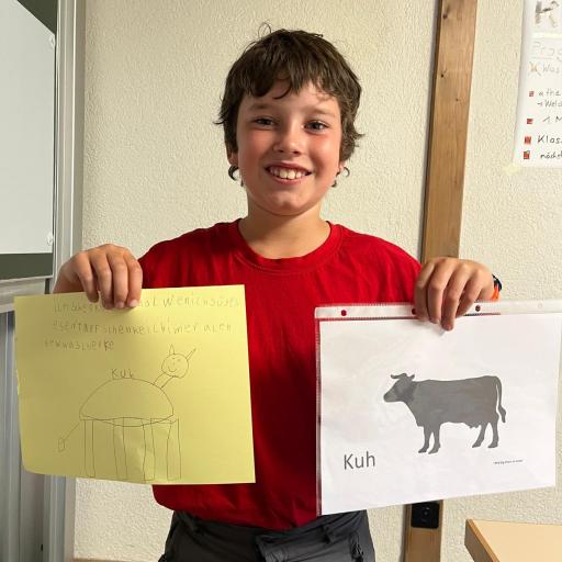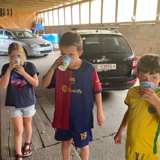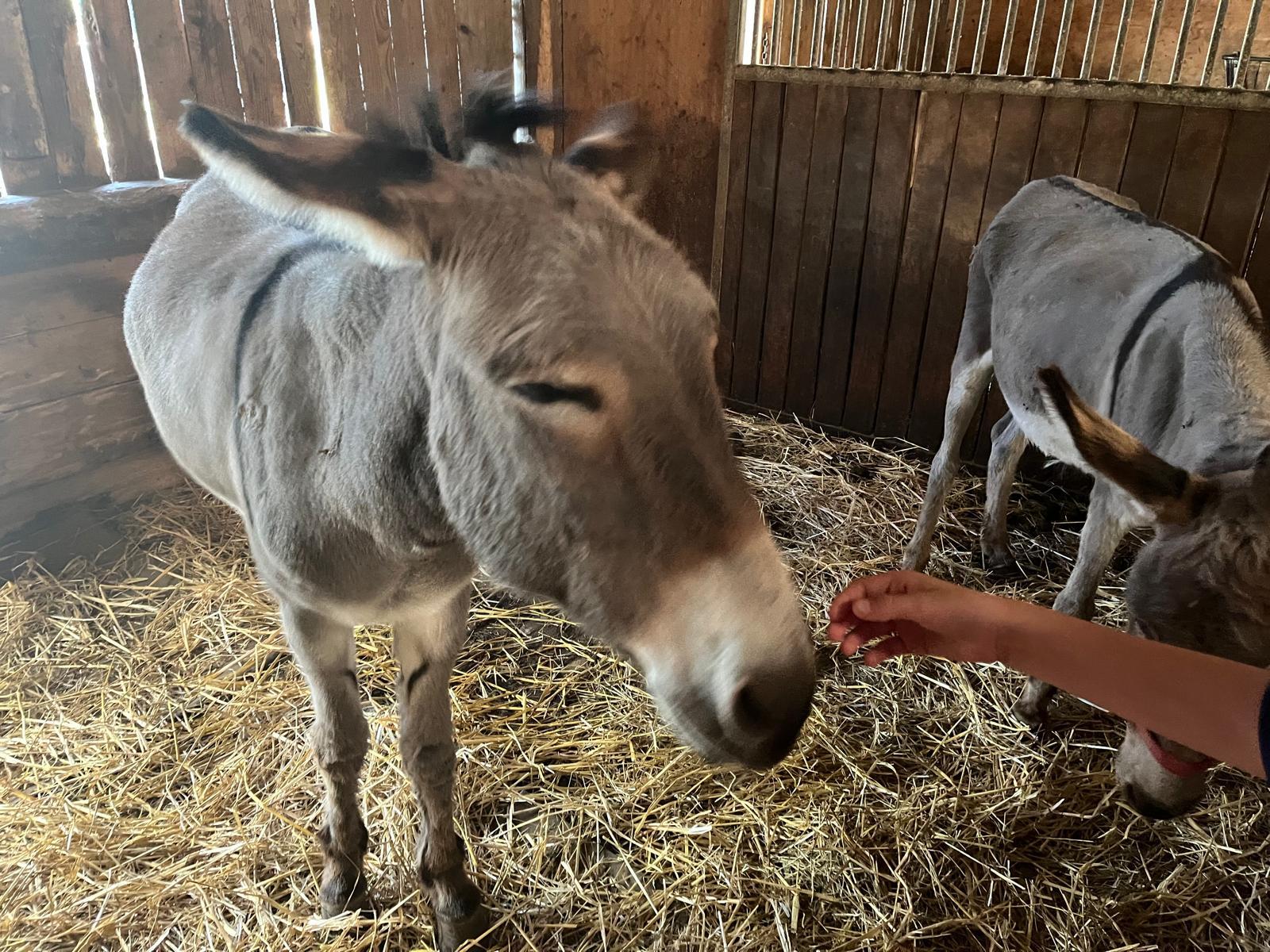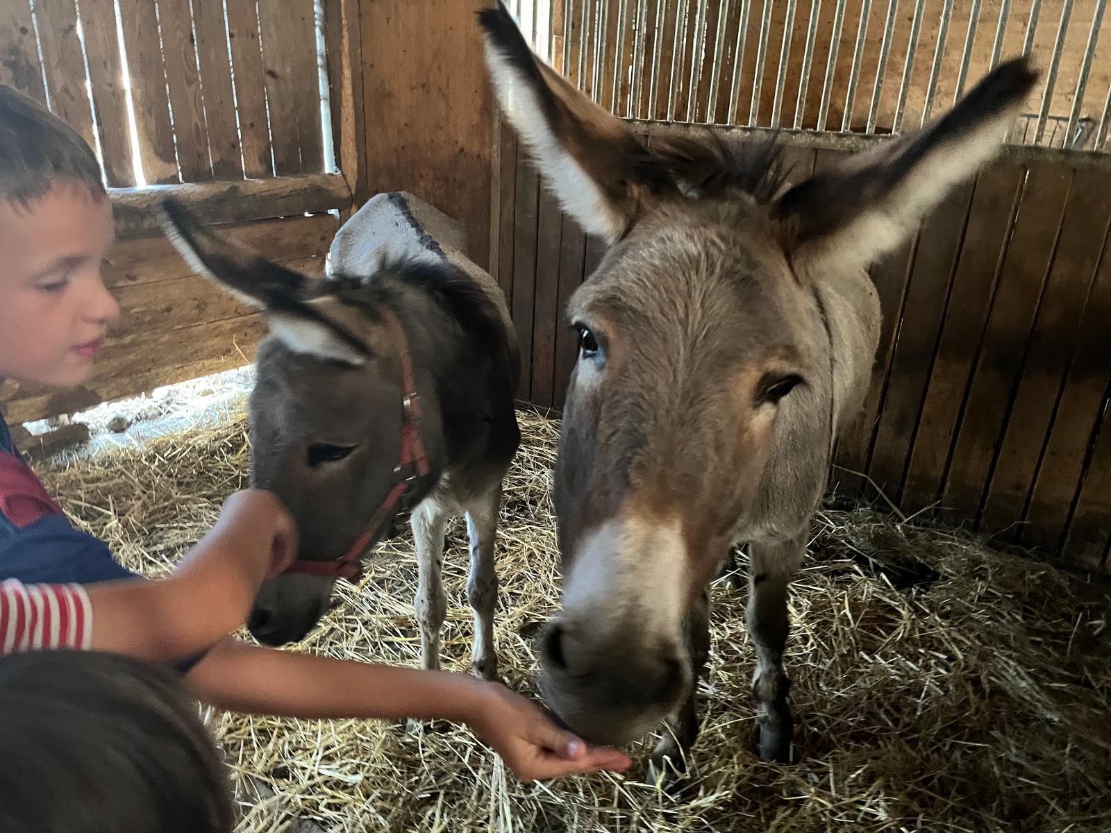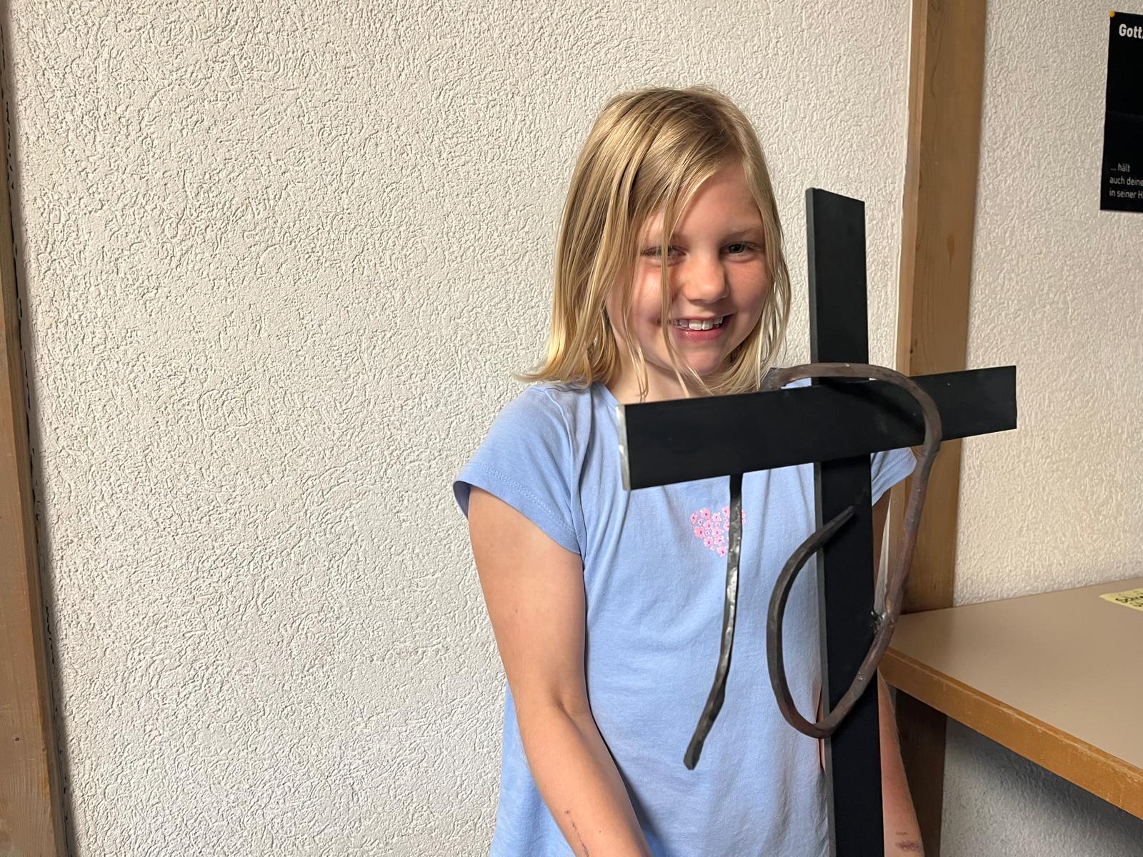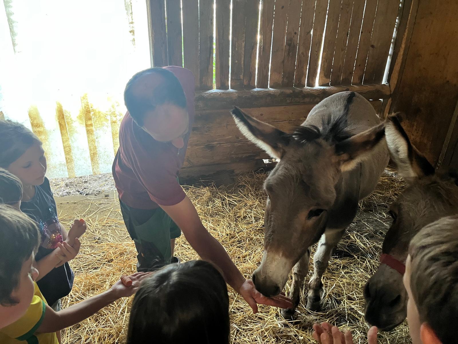 Heute haben wir gemeinsam einen spannenden KUW-Nachmittag erlebt. Wir starteten mit dem «Unser Vater»-Gebet und erinnerten uns an die Geschichte von letzten Sonntag im Gottesdienst vom Jünger Philippus. Er erklärte einem äthiopischen Beamten die Botschaft von Jesus und taufte ihn in einem Fluss. Der Mann fuhr danach voller Freude nach Hause. Wir sprachen über die fünf Tiere Israels, die Arche Noah und die Bibel mit ihren 66 Büchern, dem Tanach und dem Neuen Testament. Besonders spannend war das Kennenlernen der 12 Jünger Jesu. Wir hörten, wie Jesus auf einem Esel nach Jerusalem ritt. Passend dazu besuchten wir den Biohof von Niklaus und Barbara Badertscher. Dort durften wir die beiden Esel «Benno» und «Bellina» streicheln und füttern. Niklaus erzählte uns mit viel Wissen über diese besonderen Tiere. Beide tragen ein Kreuz auf dem Rücken. Ein Zeichen, das uns an Jesus erinnert. Wir sprachen auch darüber, wie Jesus am Kreuz gestorben ist, um uns mit Gott zu versöhnen und uns neues Leben zu schenken. Ein weiterer schöner Augenblick war das kleine Jerseykalb «YouPoint» begrüssen und streicheln zu dürfen. Es trägt den Namen unseres Jugendraums, den wir ab der 7. Klasse besuchen dürfen. Zum Abschluss auf dem Biohof wurden wir mit frischer Bio-Milch und Bio-Apfelsaft durch Barbara verwöhnt. Ein Genuss für alle Sinne! Zurück im Unterrichtszimmer rundeten wir den Tag mit dem Fingerspiel «Jesus kommt geritten» ab. So konnten wir die Erlebnisse spielerisch nachfühlen.