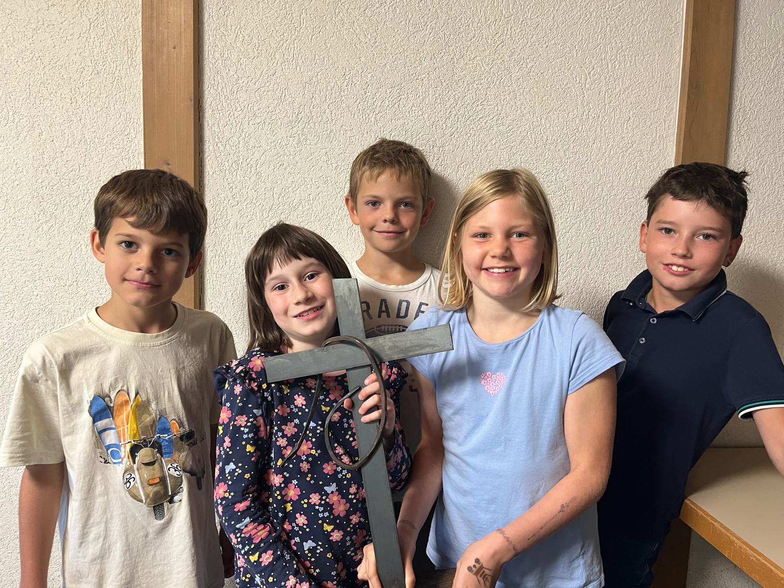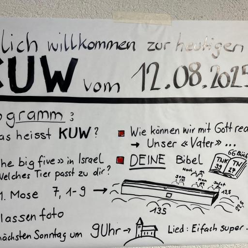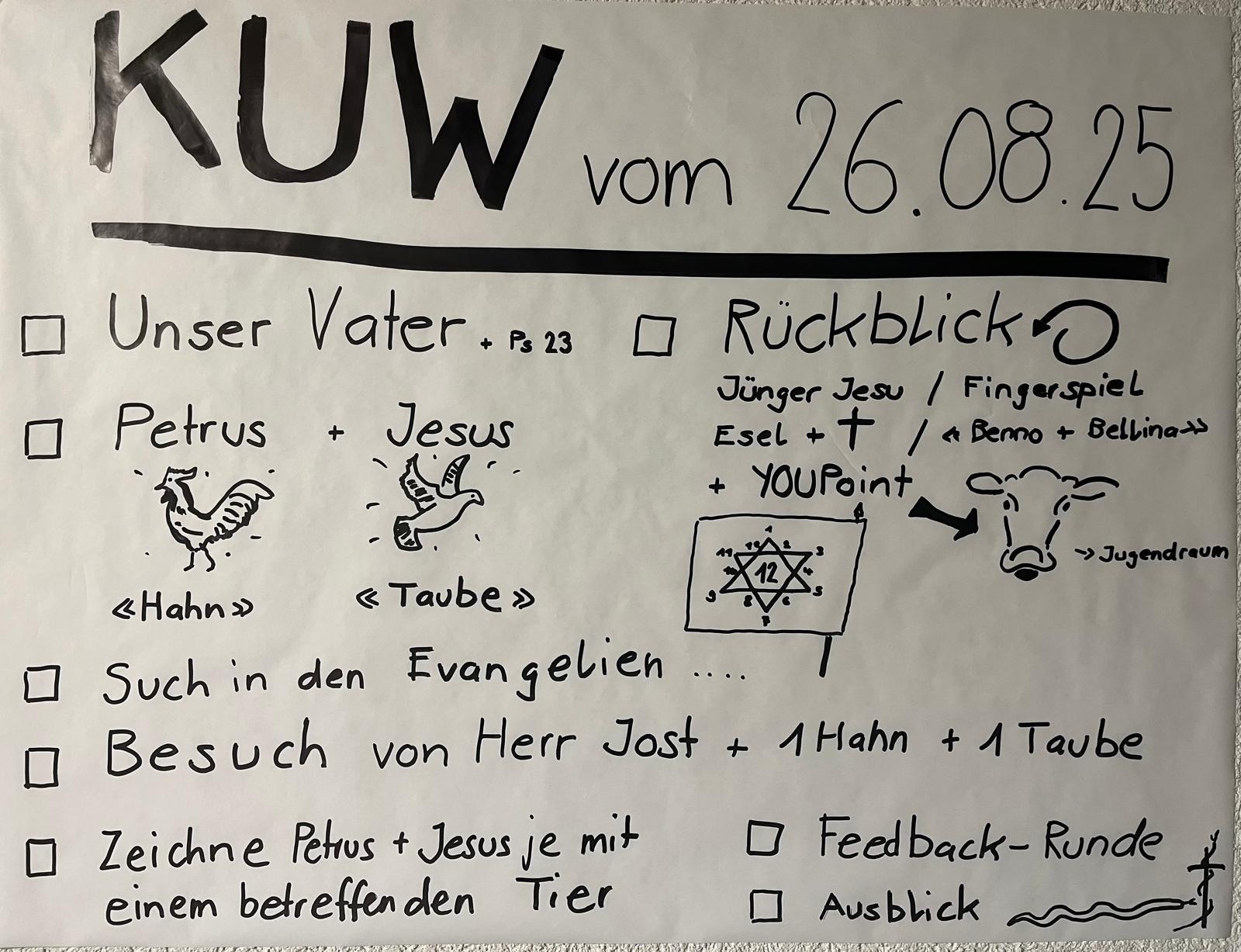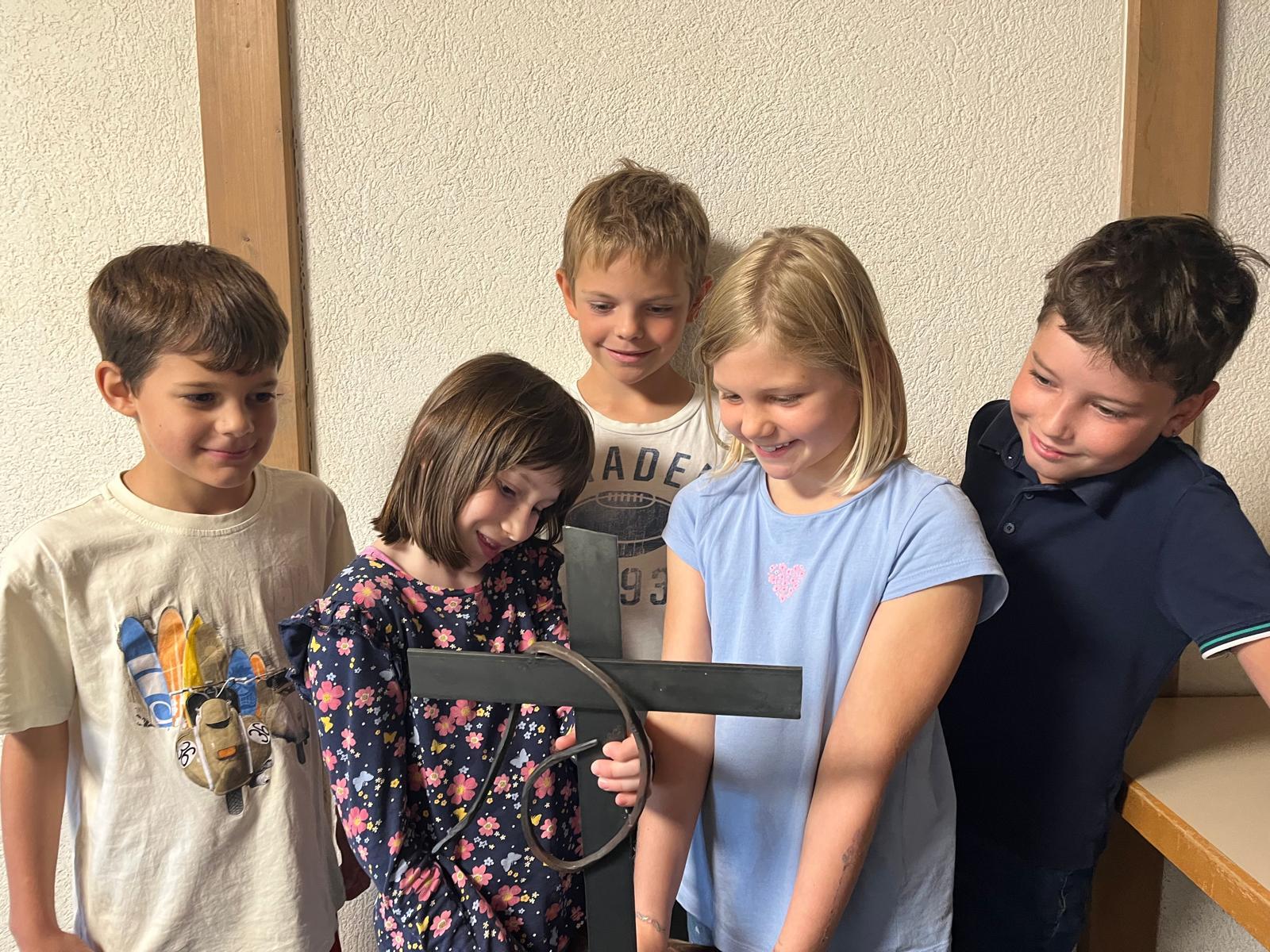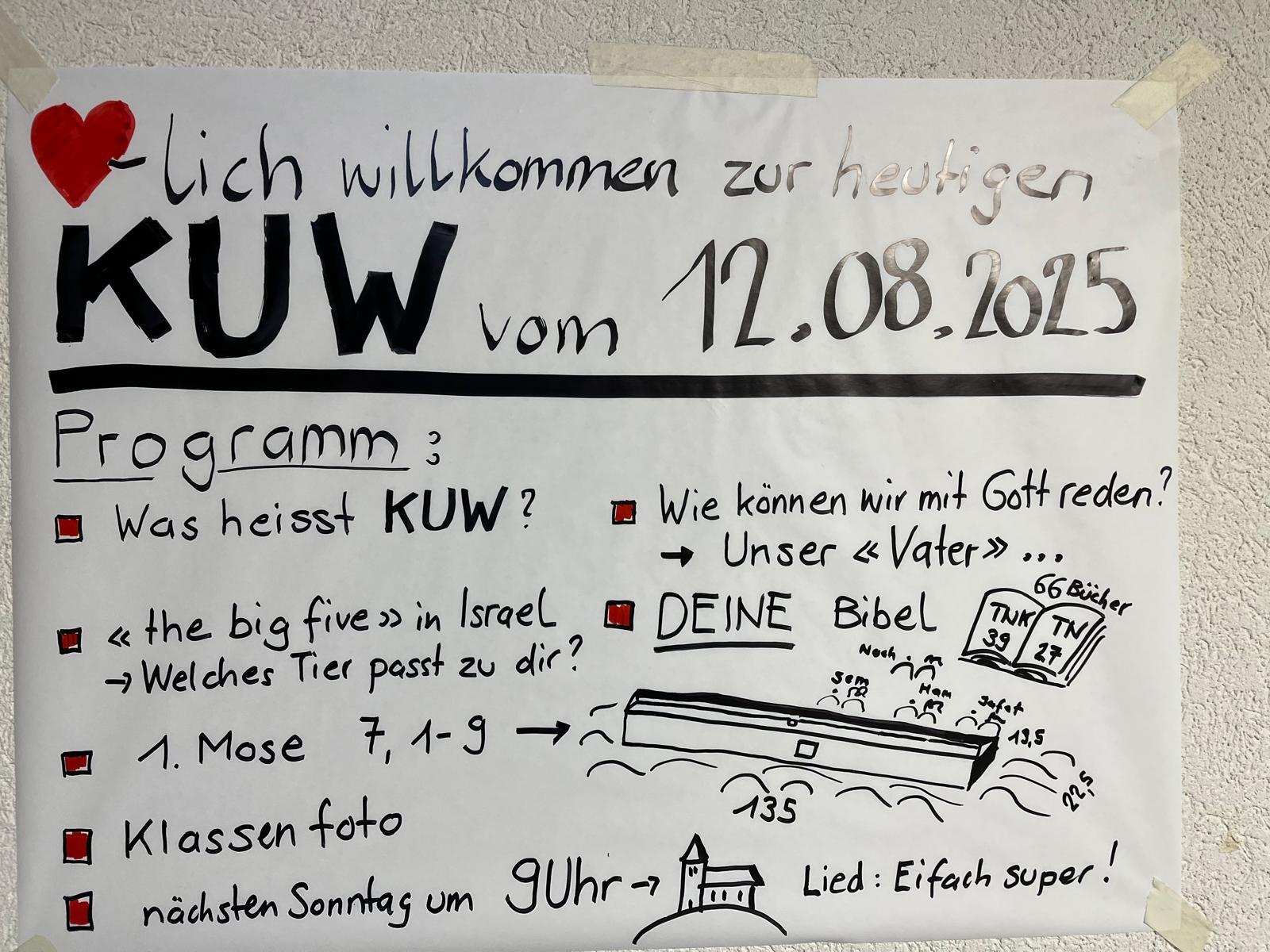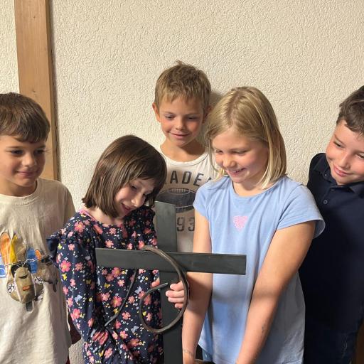 Mit viel Freude und Neugier sind wir gemeinsam in die KUW gestartet. Am Anfang haben wir uns gegenseitig kennengelernt. Wer ist wer, was mögen wir, und was macht uns besonders? Als Erinnerung an diesen schönen Moment machten wir ein fröhliches Klassenfoto. Aus den «Big Five» Israels durfte sich jedes Kind ein Tier aussuchen, das gut zur eigenen Persönlichkeit passt. So wurde jedes Tier zu einem kleinen Spiegel unserer Stärken und Eigenarten. Gemeinsam hörten wir das Gebet «Unser Vater» und lernten das Lied «Eifach super»! Besonders spannend war die Geschichte von Noah und seiner Arche. Wir sprachen darüber, wie wichtig Ordnung und Regeln sind, damit sich alle wohlfühlen, genau wie in Noahs Arche. Unsere eigene «Holz-Arche» in der Pfarrscheune bekam deshalb auch klare Regeln: Die Türen werden immer gut geschlossen. Das WC bleibt sauber. Die Schuhe werden ordentlich versorgt. Ein ganz besonderer Moment war, als jedes Kind seine eigene Bibel bekam. Wir lernten, dass Gott und Jesus durch die Bibel zu uns sprechen. Jesus bringt uns das Evangelium, seine liebevolle und rettende Botschaft, die uns zeigt: Du bist wichtig, du bist geliebt, und du bist nie allein. Am Sonntag feierten wir in der Kirche unseren Familiengottesdienst. Pfarrer Hurni erzählte die schöne Geschichte von Philippus und dem Mann aus Äthiopien. Philippus sieht diesen Mann, der in einem Wagen sitzt und in der Bibel das Buch vom Propheten Jesaja liest. Der Mann versteht den Text nicht, also erklärt Philippus ihm alles über Jesus. Der Mann freut sich und lässt sich taufen. Danach fährt er fröhlich weiter.