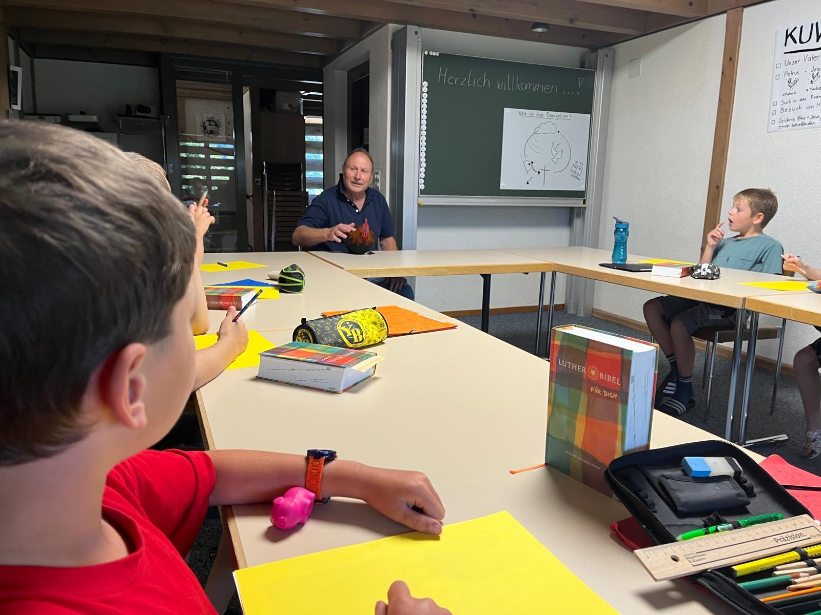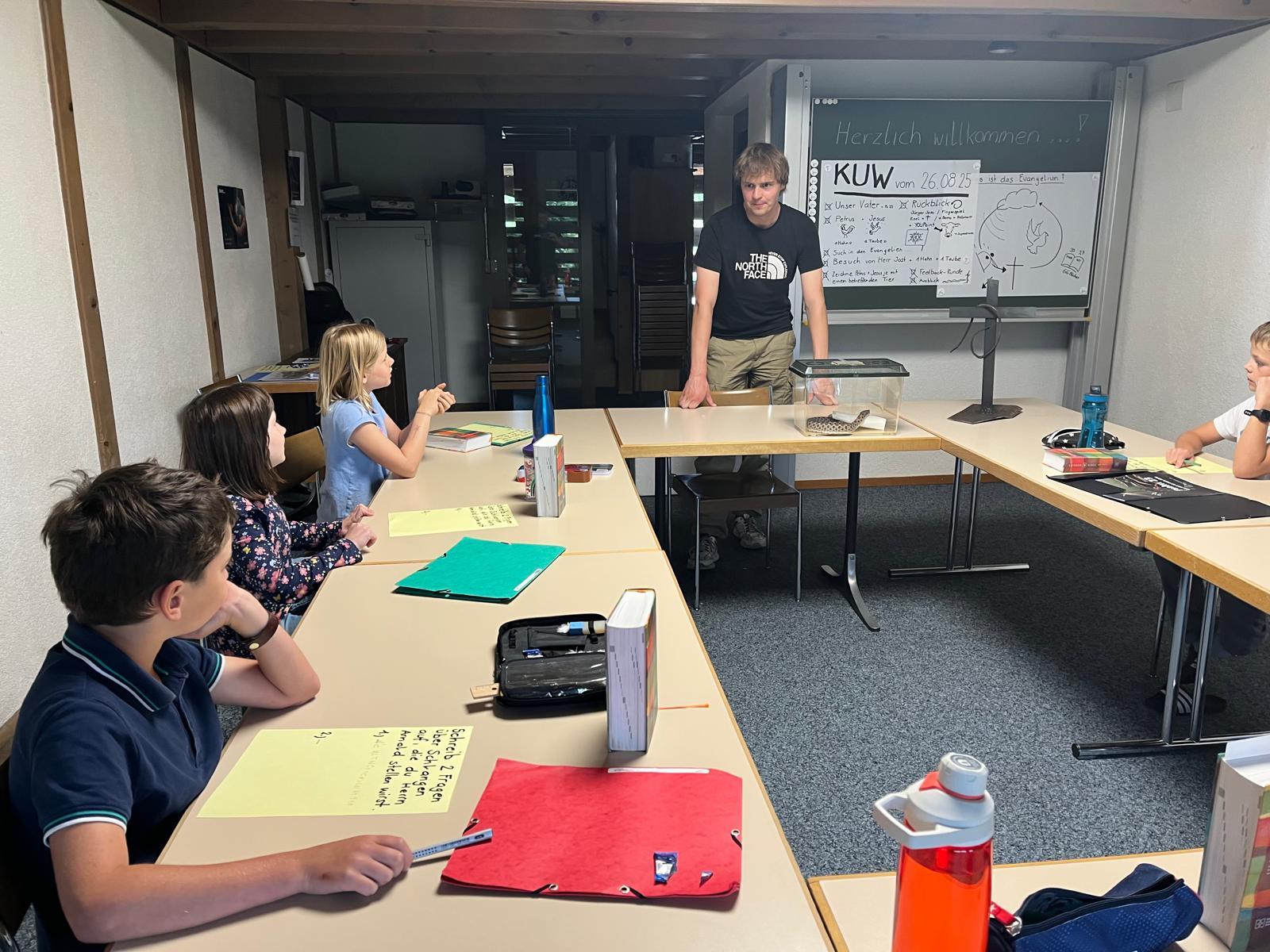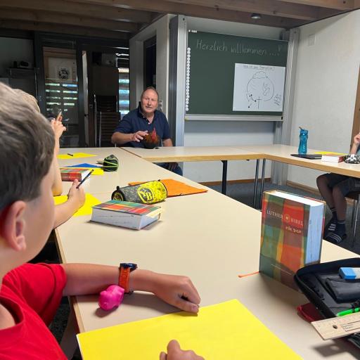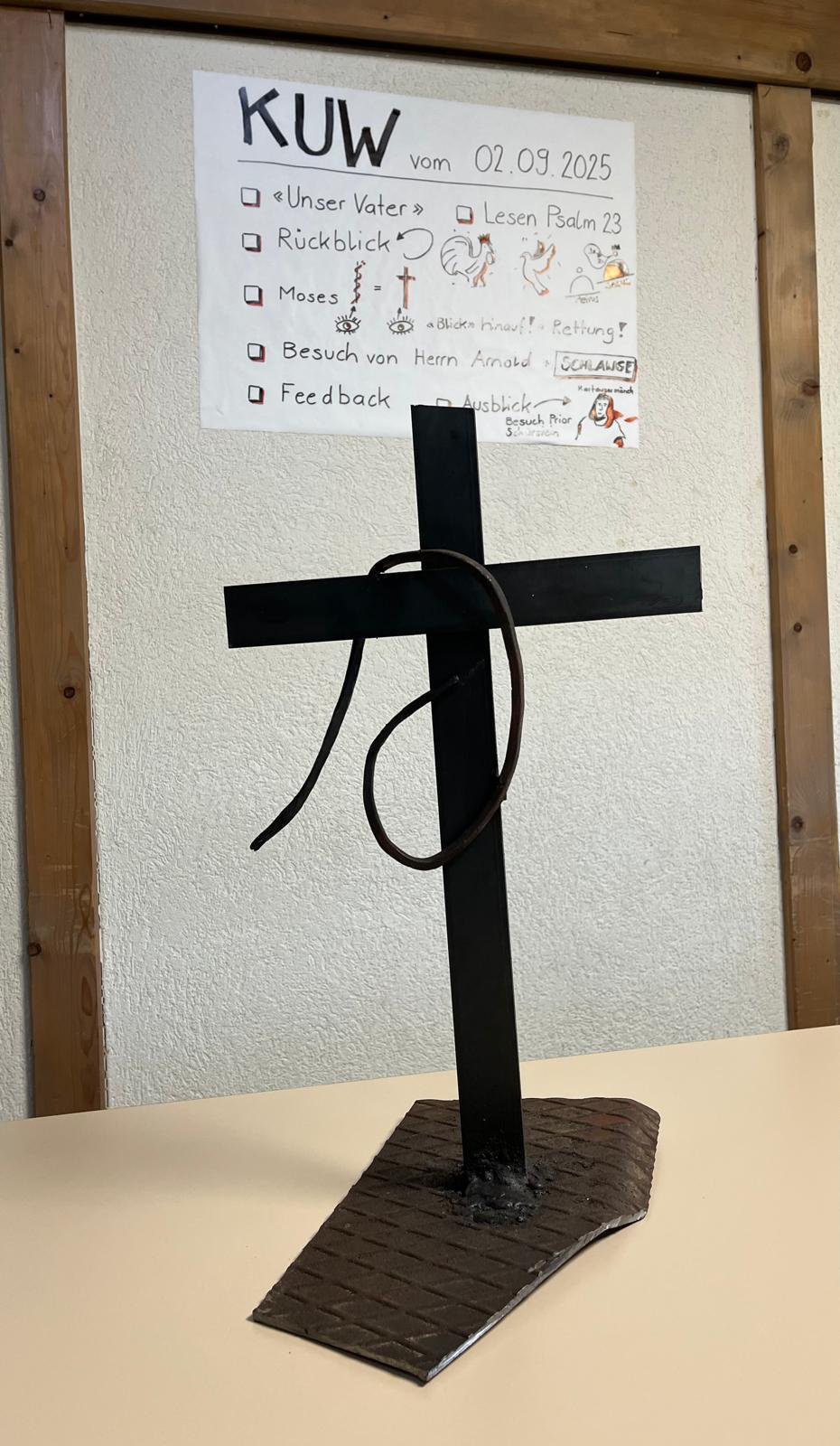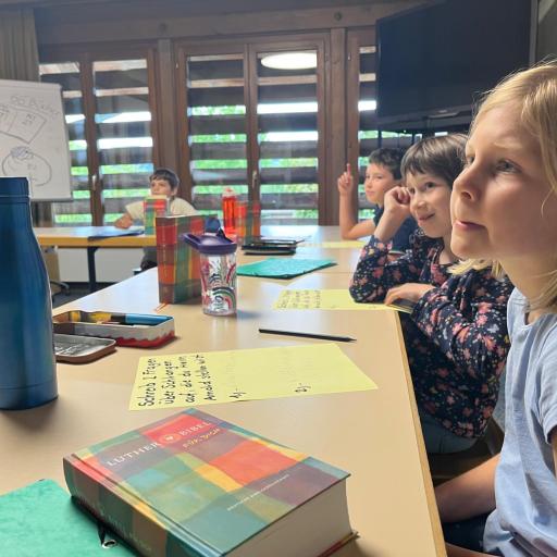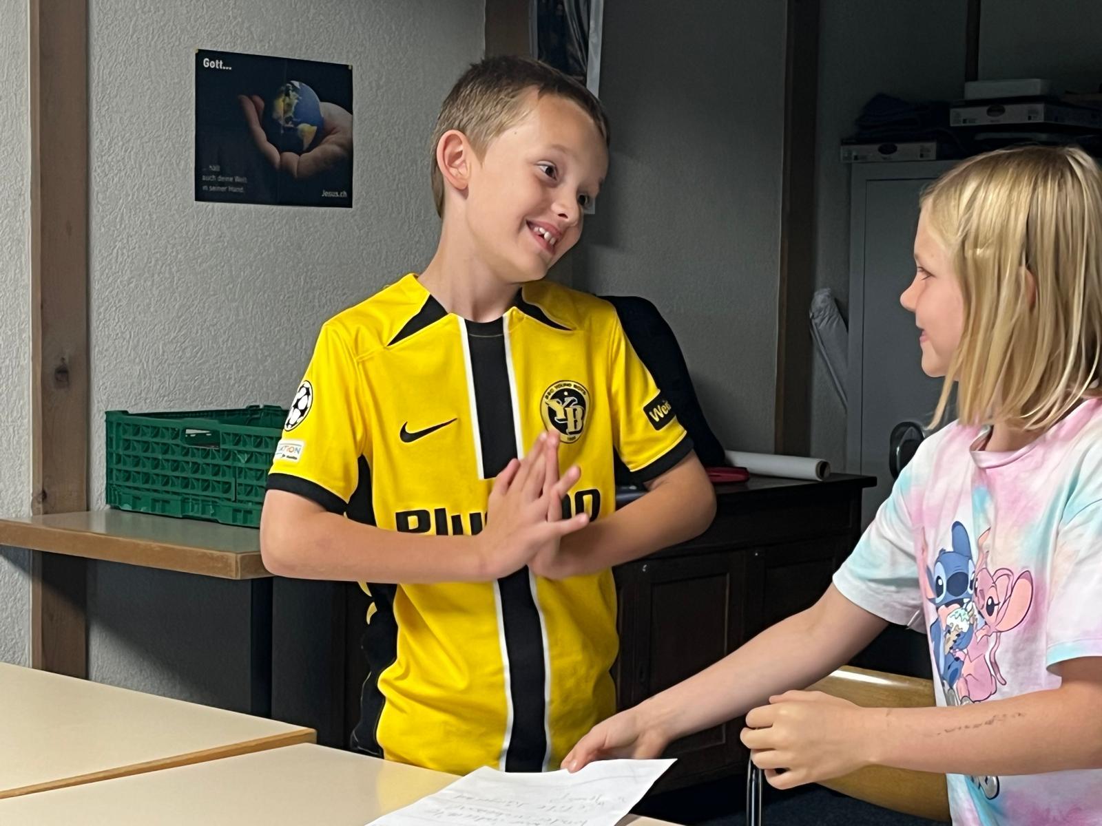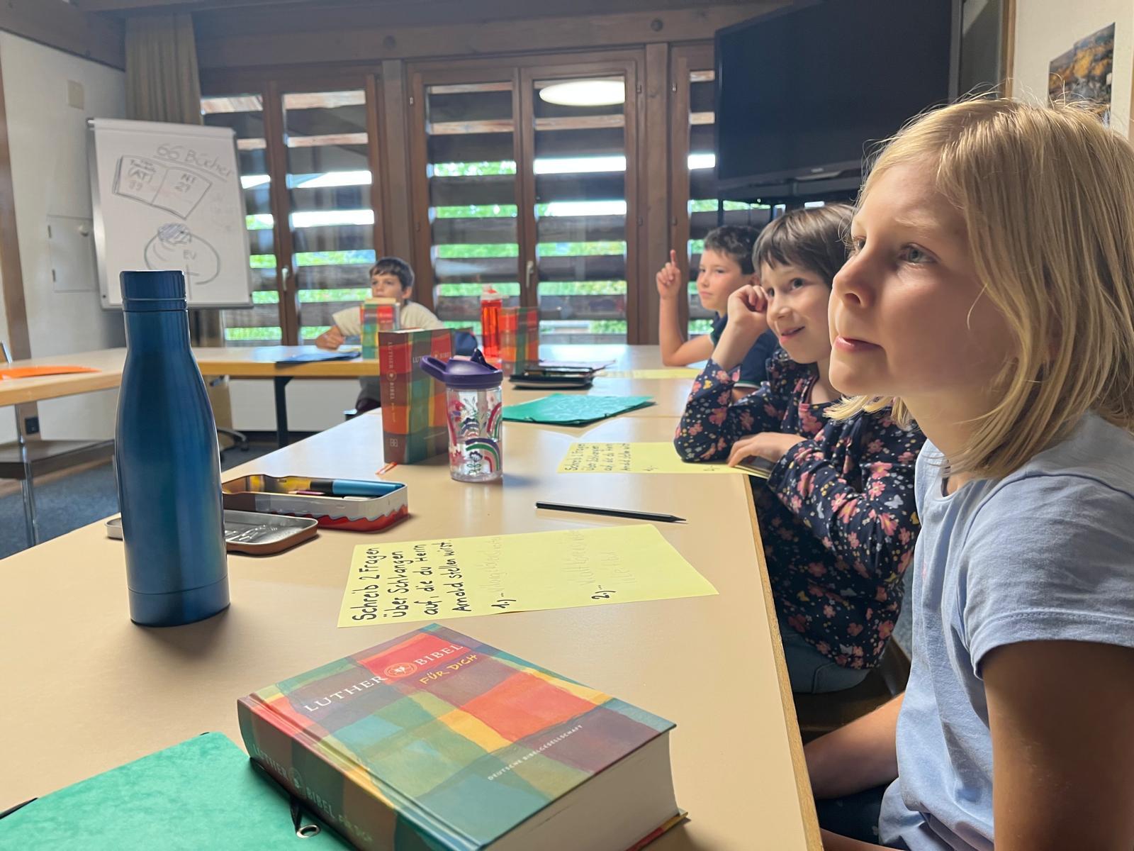 Mit viel Freude und Neugier sind wir gemeinsam in die KUW gestartet. Am Anfang haben wir uns gegenseitig kennengelernt. Wer ist wer, was mögen wir, und was macht uns besonders? Als Erinnerung an diesen schönen Moment machten wir ein fröhliches Klassenfoto. Aus den «Big Five» Israels durfte sich jedes Kind ein Tier aussuchen, das gut zur eigenen Persönlichkeit passt. So wurde jedes Tier zu einem kleinen Spiegel unserer Stärken und Eigenarten. Gemeinsam hörten wir das Gebet «Unser Vater» und lernten das Lied «Eifach super»! Besonders spannend war die Geschichte von Noah und seiner Arche. Wir sprachen darüber, wie wichtig Ordnung und Regeln sind, damit sich alle wohlfühlen, genau wie in Noahs Arche. Unsere eigene «Holz-Arche» in der Pfarrscheune bekam deshalb auch klare Regeln: Die Türen werden immer gut geschlossen. Das WC bleibt sauber. Die Schuhe werden ordentlich versorgt. Ein ganz besonderer Moment war, als jedes Kind seine eigene Bibel bekam. Wir lernten, dass Gott und Jesus durch die Bibel zu uns sprechen. Jesus bringt uns das Evangelium, seine liebevolle und rettende Botschaft, die uns zeigt: Du bist wichtig, du bist geliebt, und du bist nie allein. Am Sonntag feierten wir in der Kirche unseren Familiengottesdienst. Pfarrer Hurni erzählte die schöne Geschichte von Philippus und dem Mann aus Äthiopien. Philippus sieht diesen Mann, der in einem Wagen sitzt und in der Bibel das Buch vom Propheten Jesaja liest. Der Mann versteht den Text nicht, also erklärt Philippus ihm alles über Jesus. Der Mann freut sich und lässt sich taufen. Danach fährt er fröhlich weiter.