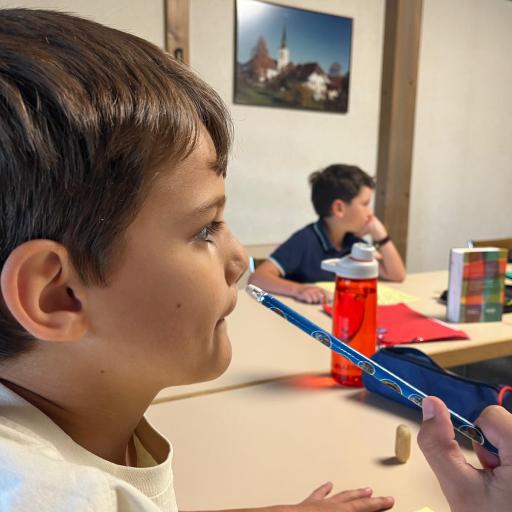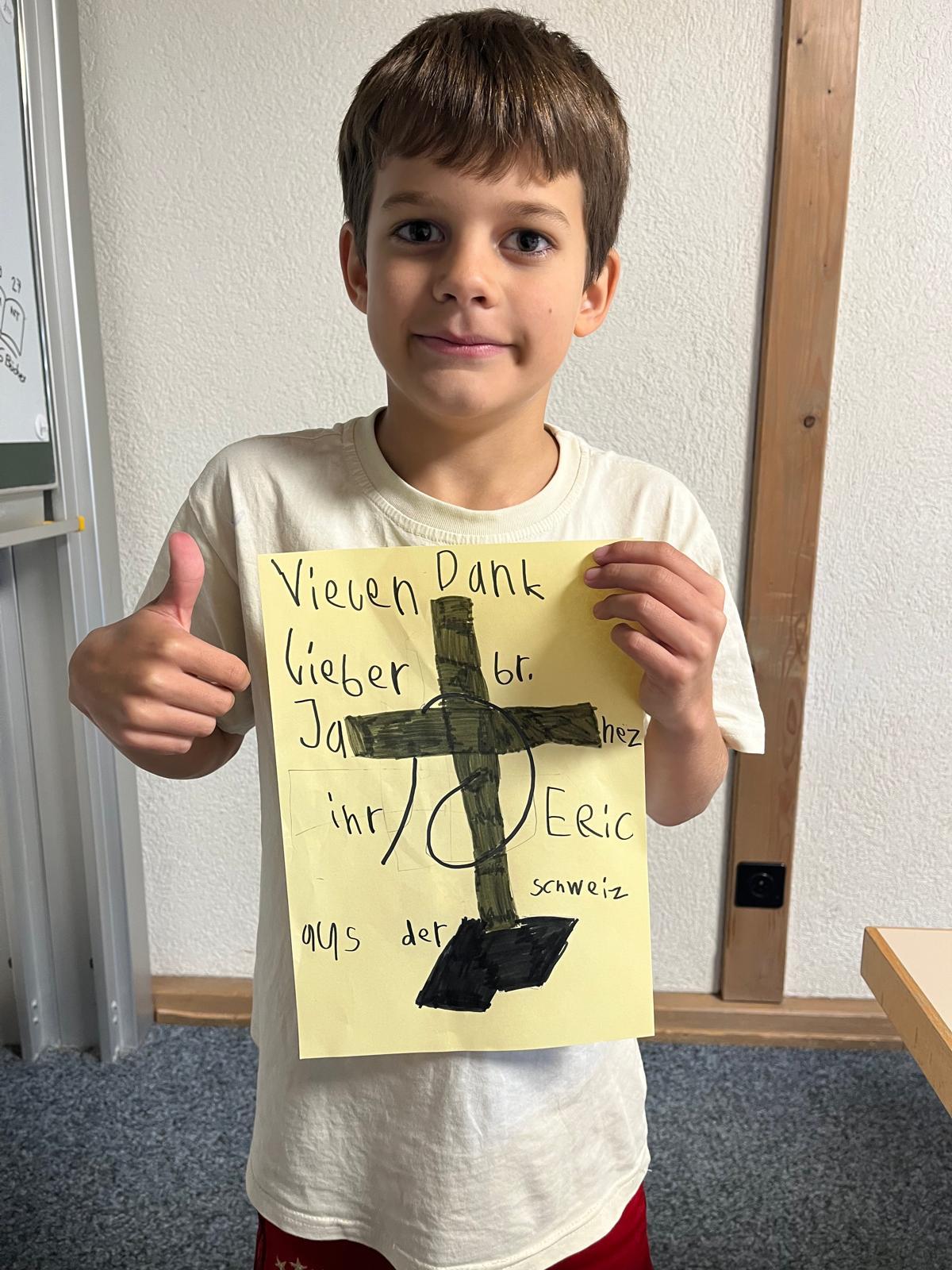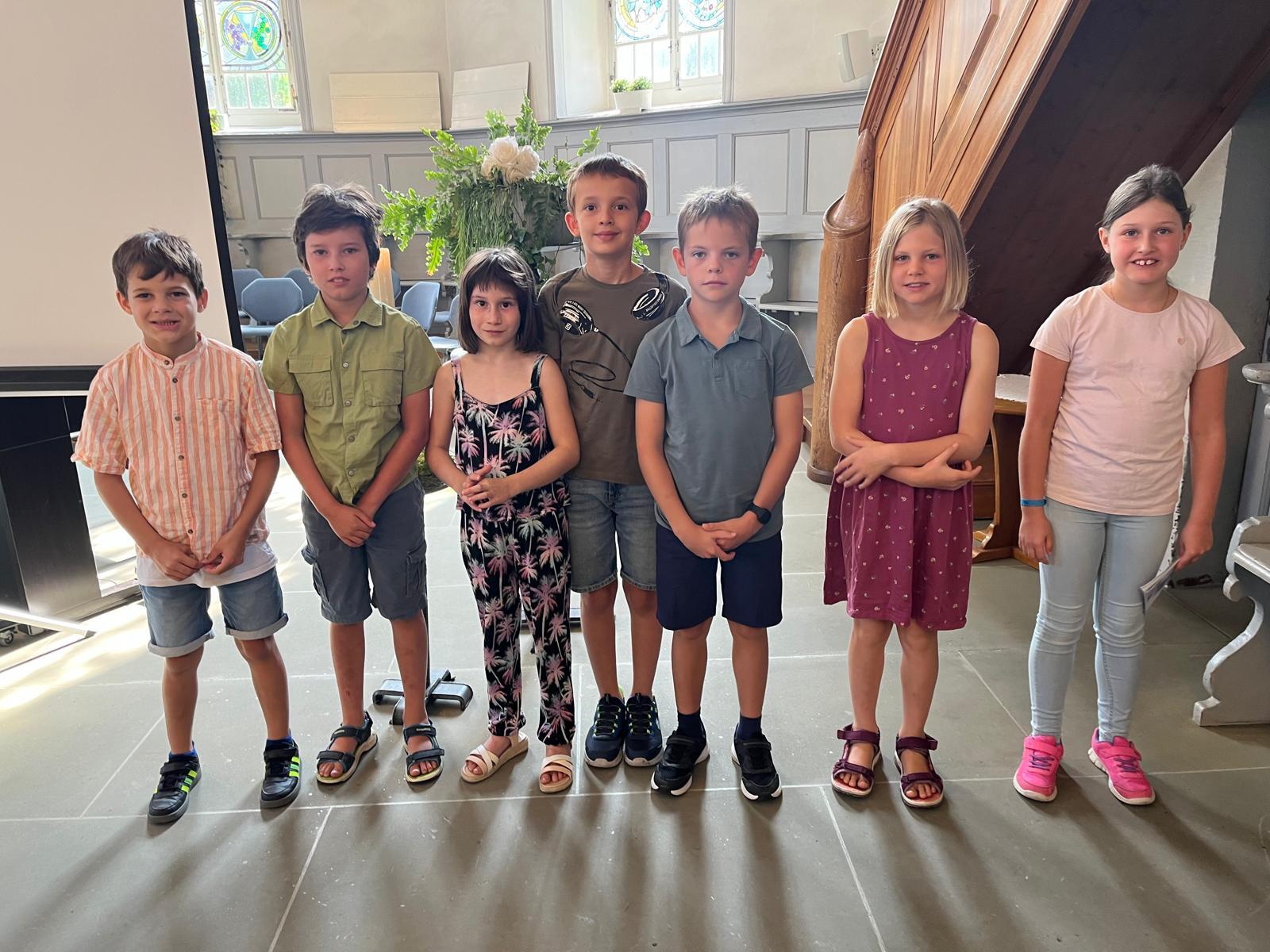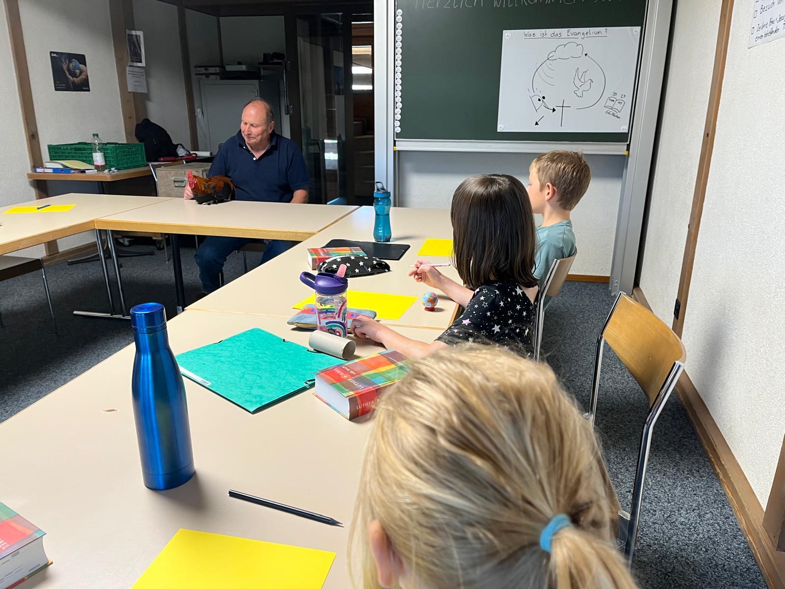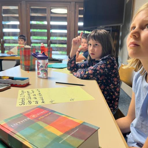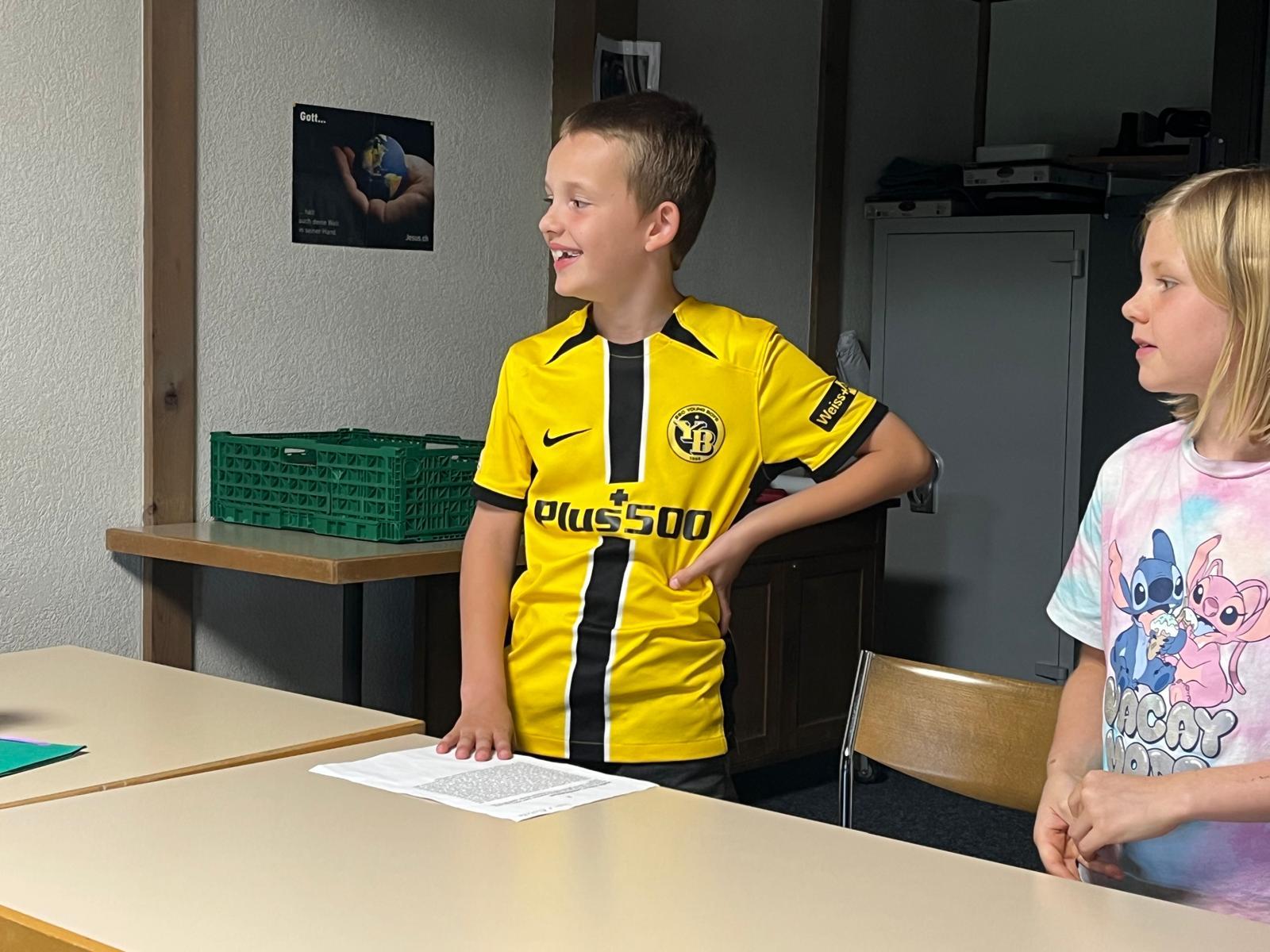Mit viel Freude und Neugier sind wir gemeinsam in die KUW gestartet. Am Anfang haben wir uns gegenseitig kennengelernt. Wer ist wer, was mögen wir, und was macht uns besonders? Als Erinnerung an diesen schönen Moment machten wir ein fröhliches Klassenfoto. Aus den «Big Five» Israels durfte sich jedes Kind ein Tier aussuchen, das gut zur eigenen Persönlichkeit passt. So wurde jedes Tier zu einem kleinen Spiegel unserer Stärken und Eigenarten. Gemeinsam hörten wir das Gebet «Unser Vater» und lernten das Lied «Eifach super»! Besonders spannend war die Geschichte von Noah und seiner Arche. Wir sprachen darüber, wie wichtig Ordnung und Regeln sind, damit sich alle wohlfühlen, genau wie in Noahs Arche. Unsere eigene «Holz-Arche» in der Pfarrscheune bekam deshalb auch klare Regeln: Die Türen werden immer gut geschlossen. Das WC bleibt sauber. Die Schuhe werden ordentlich versorgt. Ein ganz besonderer Moment war, als jedes Kind seine eigene Bibel bekam. Wir lernten, dass Gott und Jesus durch die Bibel zu uns sprechen. Jesus bringt uns das Evangelium, seine liebevolle und rettende Botschaft, die uns zeigt: Du bist wichtig, du bist geliebt, und du bist nie allein. Am Sonntag feierten wir in der Kirche unseren Familiengottesdienst. Pfarrer Hurni erzählte die schöne Geschichte von Philippus und dem Mann aus Äthiopien. Philippus sieht diesen Mann, der in einem Wagen sitzt und in der Bibel das Buch vom Propheten Jesaja liest. Der Mann versteht den Text nicht, also erklärt Philippus ihm alles über Jesus. Der Mann freut sich und lässt sich taufen. Danach fährt er fröhlich weiter.