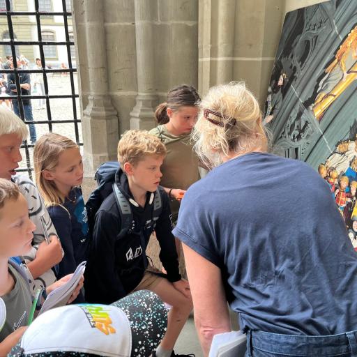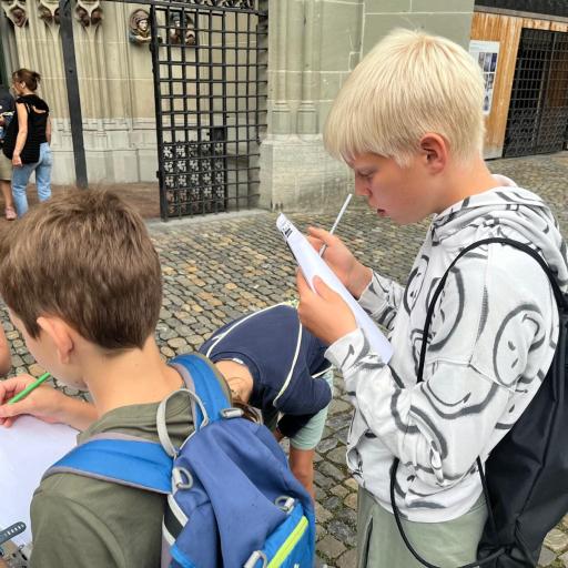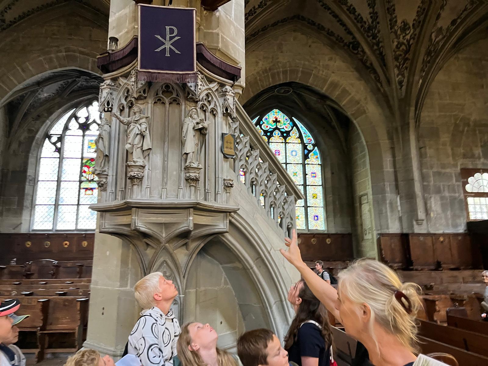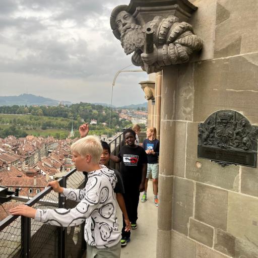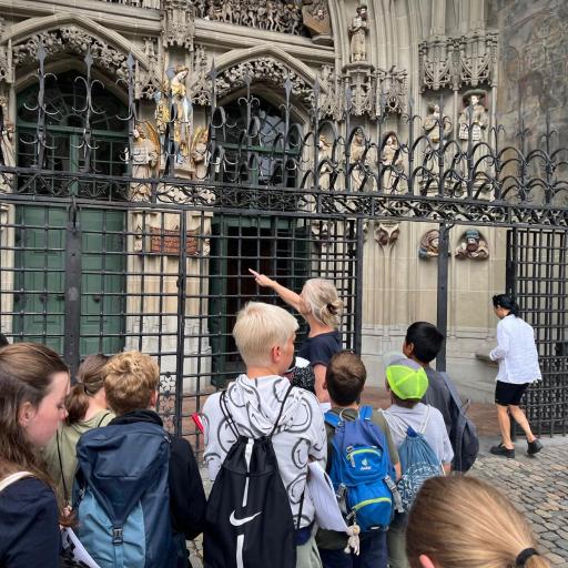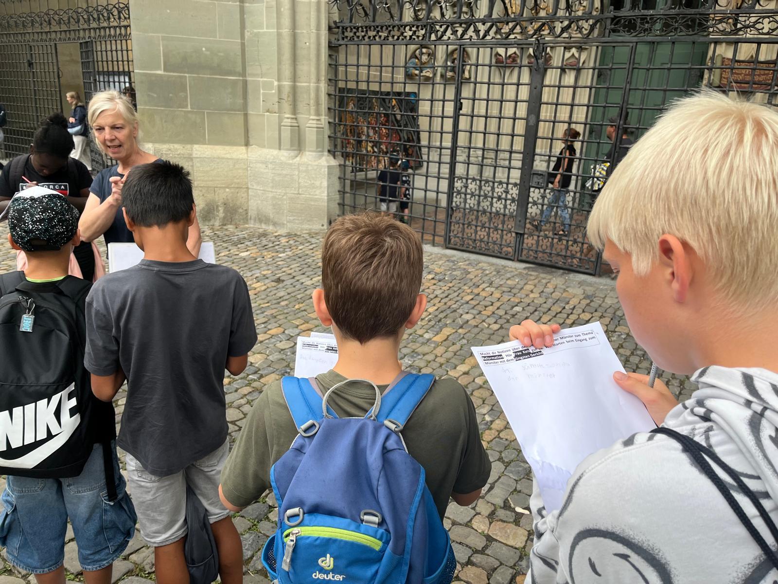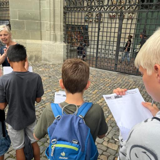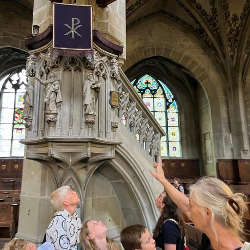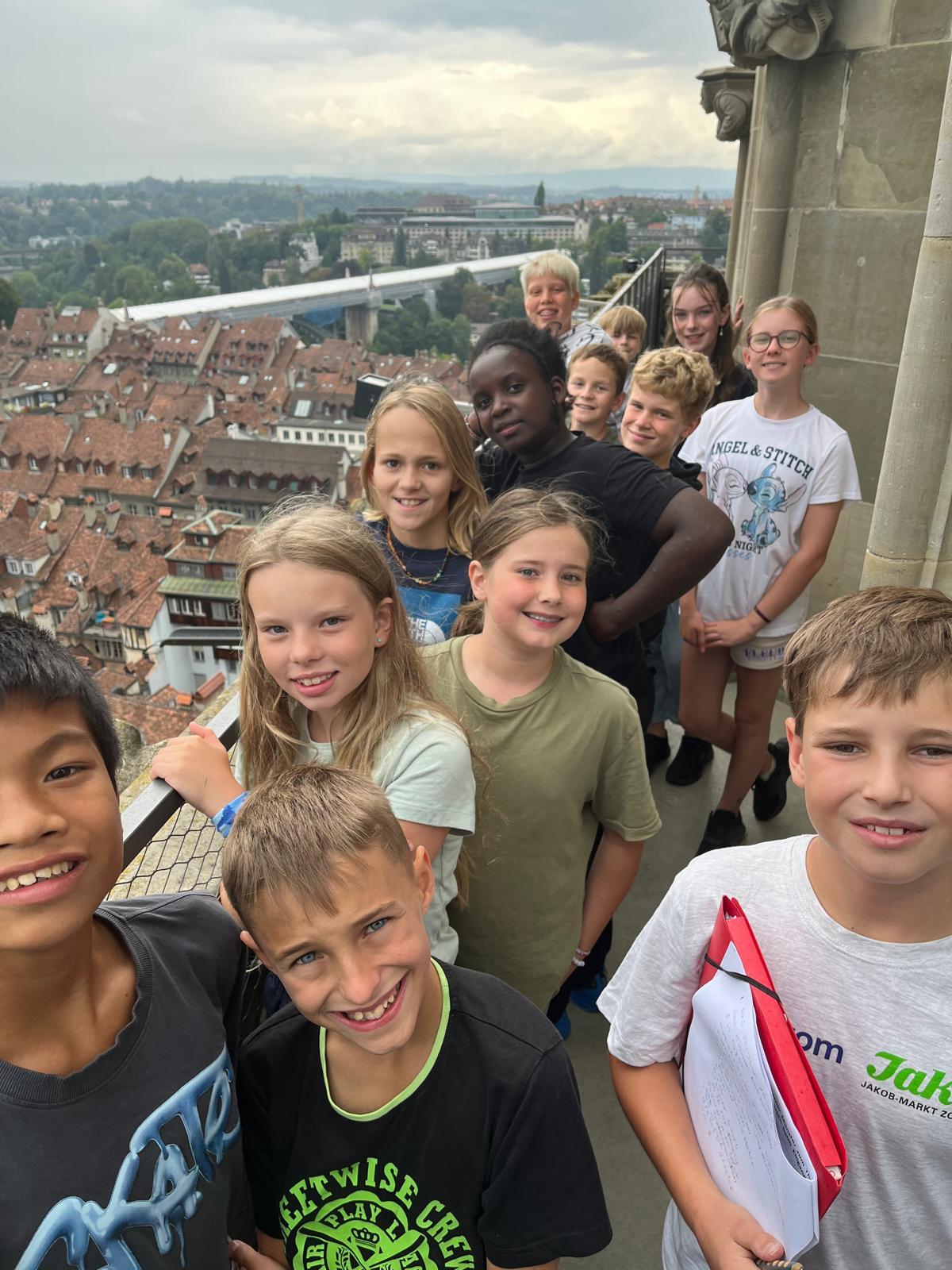 Heute besuchten wir das Berner Münster, eine riesige und sehr alte Kirche mitten in Bern. Sie ist über 600 Jahre alt und ganz schön beeindruckend! Unsere Führerin, Frau Kels, zeigte uns vieles und erzählte spannende Geschichten über die Reformationszeit vor rund 500 Jahren. Früher war das Münster katholisch. Die Menschen beteten zu Heiligen. Das sind besondere Personen, die Gott sehr nahe stehen. Im Münster gab es viele bunte Bilder und Statuen. Doch bei der Reformation änderte sich vieles: Die Leute wollten nun direkt zu Gott beten, ohne Heilige oder Bilder, und auch selbst die Bibel lesen. Musik und Kunst galten als Ablenkung. Deshalb wurden viele Figuren entfernt und auf die Münsterplattform geworfen. Nur das grosse Kunstwerk «Das Jüngste Gericht» blieb erhalten. Es zeigt über 180 Figuren: Gute Menschen kommen in den Himmel, böse in die Hölle. Warum gerade dieses Kunstwerk nicht zerstört wurde, weiss niemand genau. Die letzte katholische Messe fand bei der Metzgerzunft statt. Das war eine Gruppe von Berner Fleischern. Wir sahen die Schwalbenorgel, die hoch oben hängt wie ein Vogel. Die alte Orgel wurde ins Wallis gebracht. Früher war Musik verboten, aber heute darf man wieder Orgel spielen. Wir stiegen viele, viele Treppen hoch zur Glockenstube und zur ersten Aussichtsplattform. In der Glockenstube hängen riesige Glocken. Von oben hatten wir eine tolle Aussicht über Bern. Die Stadt sah aus wie ein Spielzeugland! Wir sahen Moses auf dem Mosesbrunnen auf dem Münsterplatz mit den Zehn Geboten (auch «Zehn Worte» genannt) auf zwei Steintafeln. Sein Gesicht glänzt, weil er mit Gott gesprochen hat. Deshalb hat man ihm zwei kleine Hörner auf den Kopf gesetzt und das war früher ein Zeichen für göttlichen Abglanz. Anschliessend fuhren wir vor das Gefängnis für Männer auf den Thorberg zur JVA (Justizvollzugsanstalt) Thorberg. Dort steht noch heute das «Glauser-Hüsi», ein kleines Häuschen aus der Zeit des Kartäuserklosters. Es wurde von Kartäusermönchen gebaut und gehörte zur Klosteranlage. Prior und Kartäusermönch Niclaus Schürstein lebte dort. Während der Reformation verliess er den Orden und wurde später ein reformierter Pfarrer. Ein besonders lustiger Moment war, als wir chinesische Touristen trafen. Sie waren sehr freundlich, und wir begrüssten sie mit einem fröhlichen «Nǐ hǎo», das heisst «Guten Tag» auf Chinesisch.