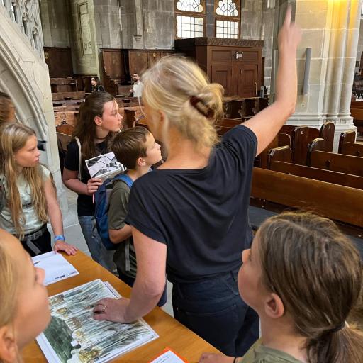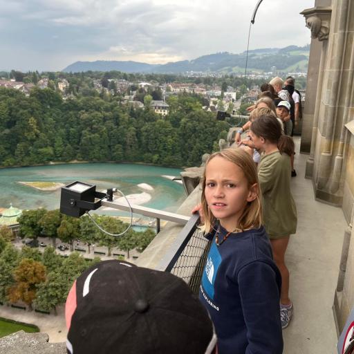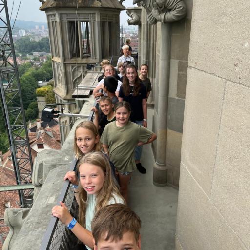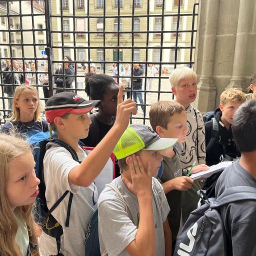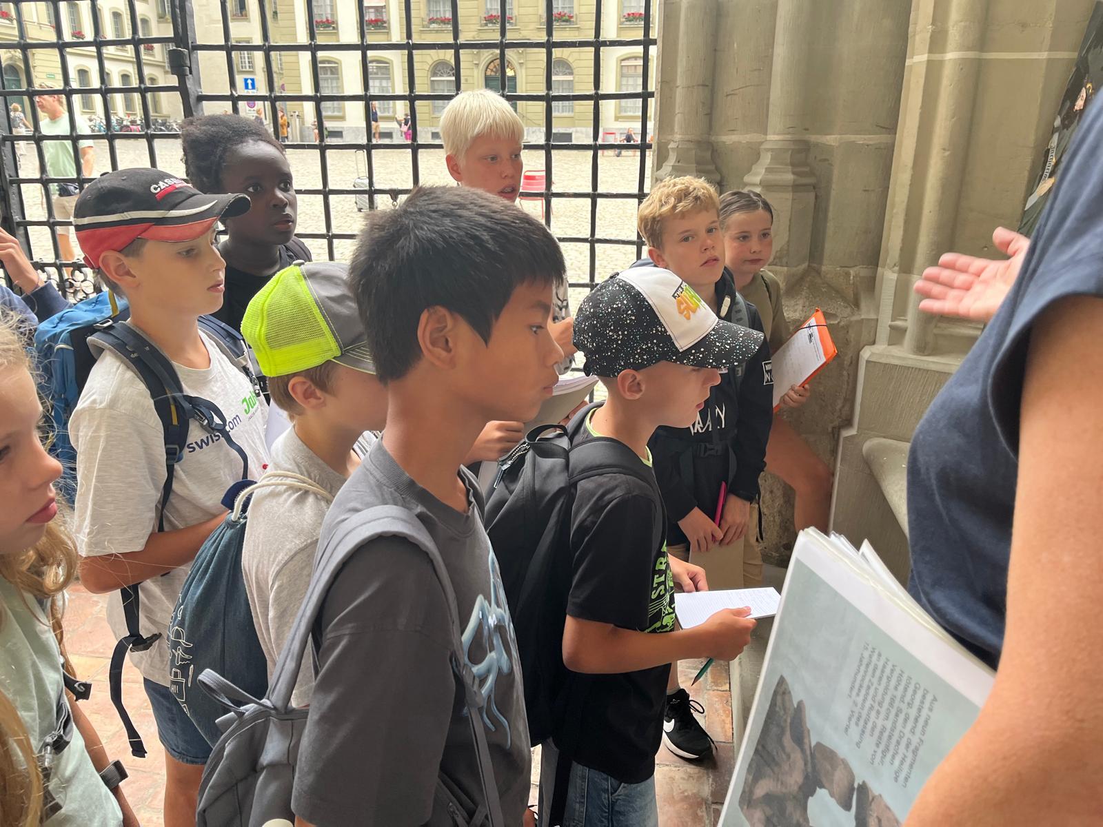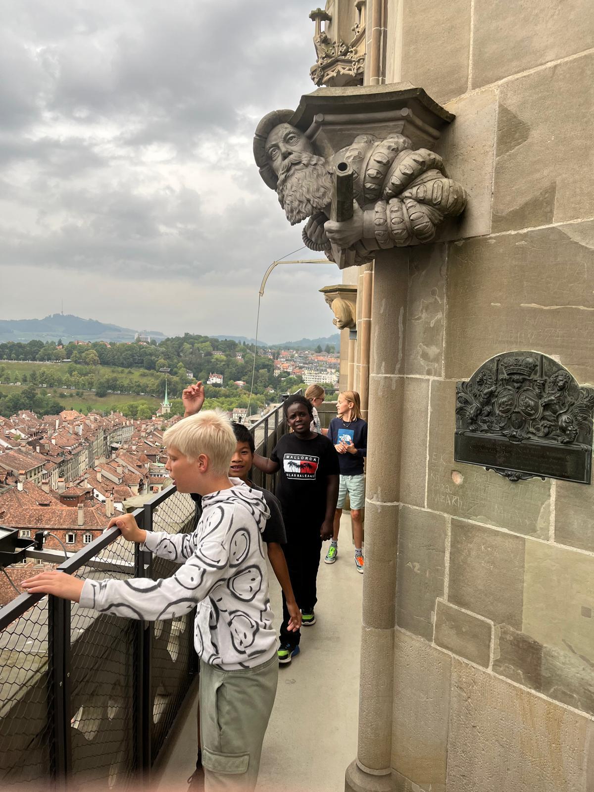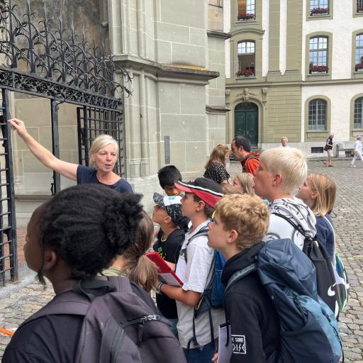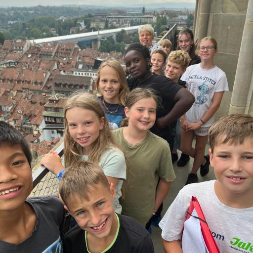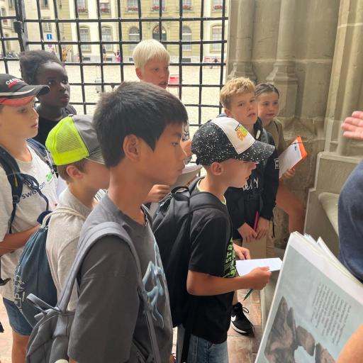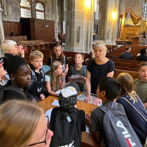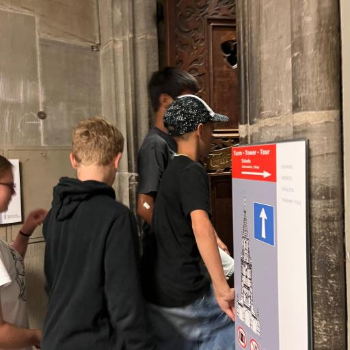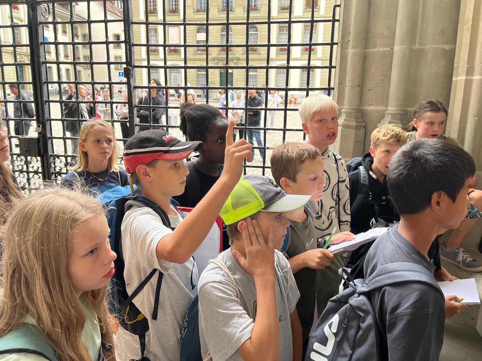 Heute besuchten wir das Berner Münster, eine riesige und sehr alte Kirche mitten in Bern. Sie ist über 600 Jahre alt und ganz schön beeindruckend! Unsere Führerin, Frau Kels, zeigte uns vieles und erzählte spannende Geschichten über die Reformationszeit vor rund 500 Jahren. Früher war das Münster katholisch. Die Menschen beteten zu Heiligen. Das sind besondere Personen, die Gott sehr nahe stehen. Im Münster gab es viele bunte Bilder und Statuen. Doch bei der Reformation änderte sich vieles: Die Leute wollten nun direkt zu Gott beten, ohne Heilige oder Bilder, und auch selbst die Bibel lesen. Musik und Kunst galten als Ablenkung. Deshalb wurden viele Figuren entfernt und auf die Münsterplattform geworfen. Nur das grosse Kunstwerk «Das Jüngste Gericht» blieb erhalten. Es zeigt über 180 Figuren: Gute Menschen kommen in den Himmel, böse in die Hölle. Warum gerade dieses Kunstwerk nicht zerstört wurde, weiss niemand genau. Die letzte katholische Messe fand bei der Metzgerzunft statt. Das war eine Gruppe von Berner Fleischern. Wir sahen die Schwalbenorgel, die hoch oben hängt wie ein Vogel. Die alte Orgel wurde ins Wallis gebracht. Früher war Musik verboten, aber heute darf man wieder Orgel spielen. Wir stiegen viele, viele Treppen hoch zur Glockenstube und zur ersten Aussichtsplattform. In der Glockenstube hängen riesige Glocken. Von oben hatten wir eine tolle Aussicht über Bern. Die Stadt sah aus wie ein Spielzeugland! Wir sahen Moses auf dem Mosesbrunnen auf dem Münsterplatz mit den Zehn Geboten (auch «Zehn Worte» genannt) auf zwei Steintafeln. Sein Gesicht glänzt, weil er mit Gott gesprochen hat. Deshalb hat man ihm zwei kleine Hörner auf den Kopf gesetzt und das war früher ein Zeichen für göttlichen Abglanz. Anschliessend fuhren wir vor das Gefängnis für Männer auf den Thorberg zur JVA (Justizvollzugsanstalt) Thorberg. Dort steht noch heute das «Glauser-Hüsi», ein kleines Häuschen aus der Zeit des Kartäuserklosters. Es wurde von Kartäusermönchen gebaut und gehörte zur Klosteranlage. Prior und Kartäusermönch Niclaus Schürstein lebte dort. Während der Reformation verliess er den Orden und wurde später ein reformierter Pfarrer. Ein besonders lustiger Moment war, als wir chinesische Touristen trafen. Sie waren sehr freundlich, und wir begrüssten sie mit einem fröhlichen «Nǐ hǎo», das heisst «Guten Tag» auf Chinesisch.