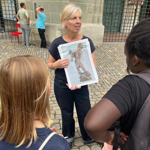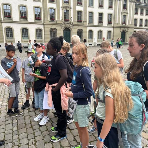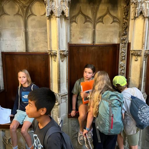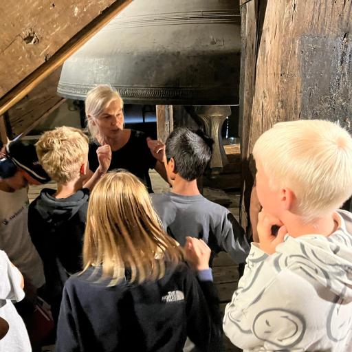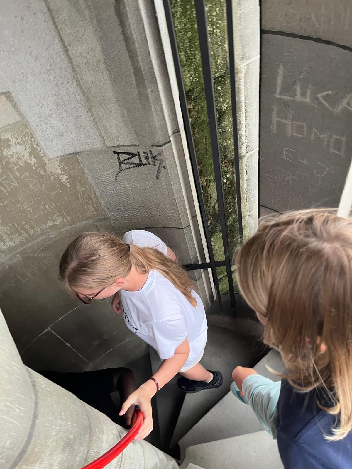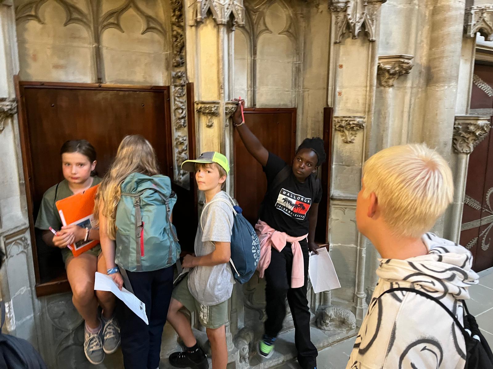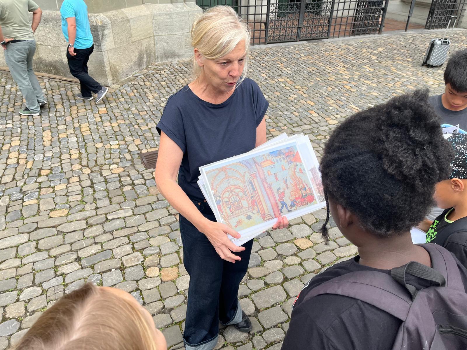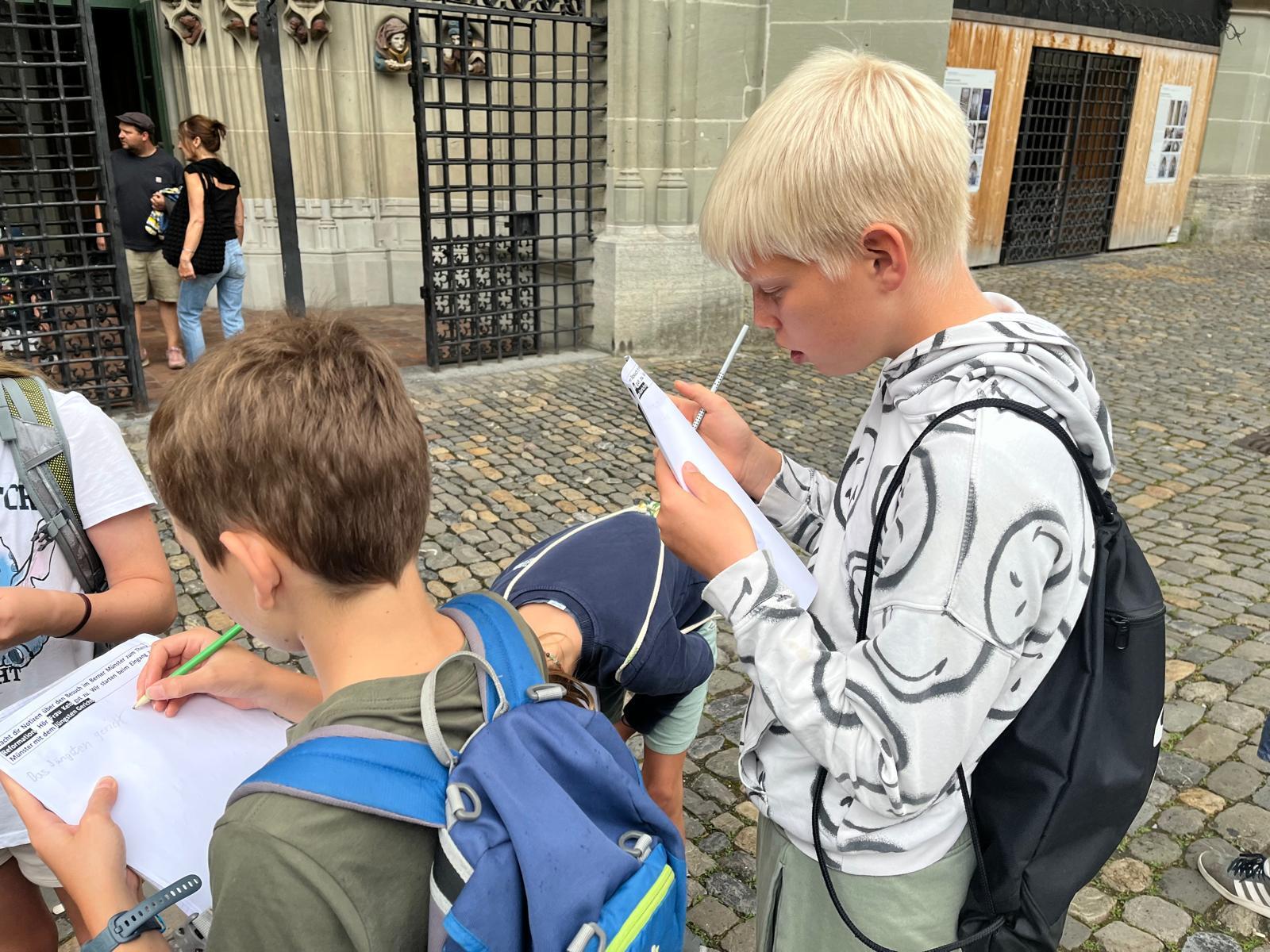 Heute besuchten wir das Berner Münster, eine riesige und sehr alte Kirche mitten in Bern. Sie ist über 600 Jahre alt und ganz schön beeindruckend! Unsere Führerin, Frau Kels, zeigte uns vieles und erzählte spannende Geschichten über die Reformationszeit vor rund 500 Jahren. Früher war das Münster katholisch. Die Menschen beteten zu Heiligen. Das sind besondere Personen, die Gott sehr nahe stehen. Im Münster gab es viele bunte Bilder und Statuen. Doch bei der Reformation änderte sich vieles: Die Leute wollten nun direkt zu Gott beten, ohne Heilige oder Bilder, und auch selbst die Bibel lesen. Musik und Kunst galten als Ablenkung. Deshalb wurden viele Figuren entfernt und auf die Münsterplattform geworfen. Nur das grosse Kunstwerk «Das Jüngste Gericht» blieb erhalten. Es zeigt über 180 Figuren: Gute Menschen kommen in den Himmel, böse in die Hölle. Warum gerade dieses Kunstwerk nicht zerstört wurde, weiss niemand genau. Die letzte katholische Messe fand bei der Metzgerzunft statt. Das war eine Gruppe von Berner Fleischern. Wir sahen die Schwalbenorgel, die hoch oben hängt wie ein Vogel. Die alte Orgel wurde ins Wallis gebracht. Früher war Musik verboten, aber heute darf man wieder Orgel spielen. Wir stiegen viele, viele Treppen hoch zur Glockenstube und zur ersten Aussichtsplattform. In der Glockenstube hängen riesige Glocken. Von oben hatten wir eine tolle Aussicht über Bern. Die Stadt sah aus wie ein Spielzeugland! Wir sahen Moses auf dem Mosesbrunnen auf dem Münsterplatz mit den Zehn Geboten (auch «Zehn Worte» genannt) auf zwei Steintafeln. Sein Gesicht glänzt, weil er mit Gott gesprochen hat. Deshalb hat man ihm zwei kleine Hörner auf den Kopf gesetzt und das war früher ein Zeichen für göttlichen Abglanz. Anschliessend fuhren wir vor das Gefängnis für Männer auf den Thorberg zur JVA (Justizvollzugsanstalt) Thorberg. Dort steht noch heute das «Glauser-Hüsi», ein kleines Häuschen aus der Zeit des Kartäuserklosters. Es wurde von Kartäusermönchen gebaut und gehörte zur Klosteranlage. Prior und Kartäusermönch Niclaus Schürstein lebte dort. Während der Reformation verliess er den Orden und wurde später ein reformierter Pfarrer. Ein besonders lustiger Moment war, als wir chinesische Touristen trafen. Sie waren sehr freundlich, und wir begrüssten sie mit einem fröhlichen «Nǐ hǎo», das heisst «Guten Tag» auf Chinesisch.