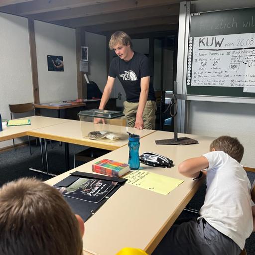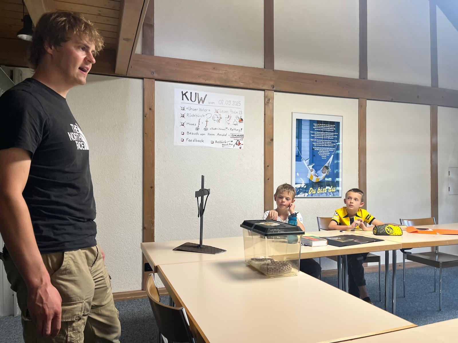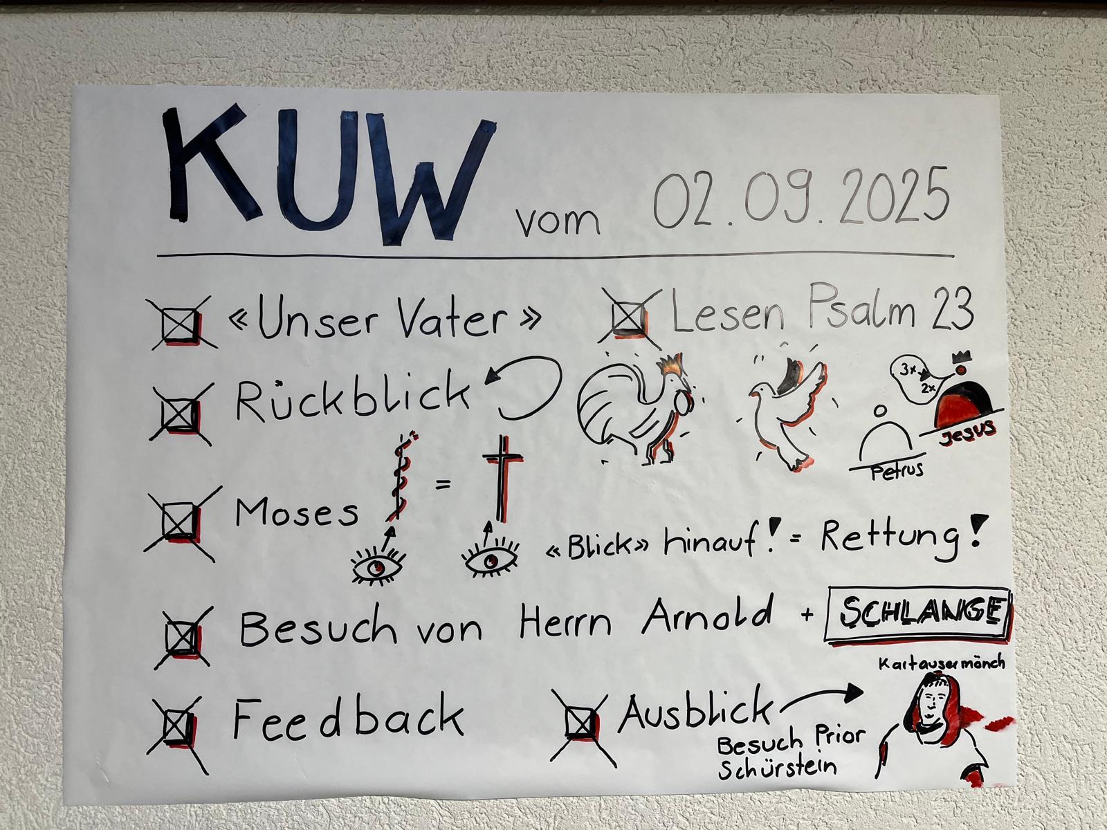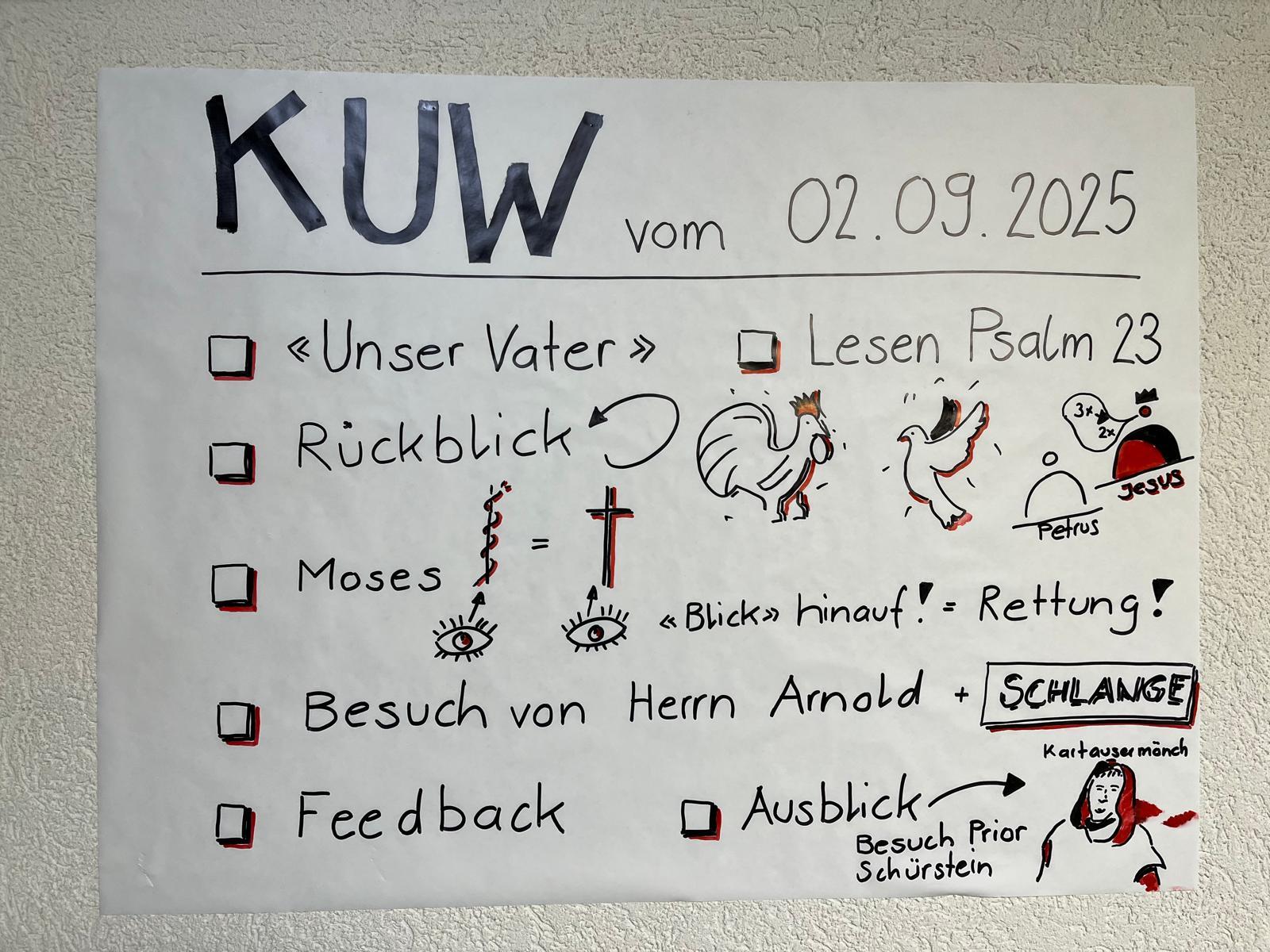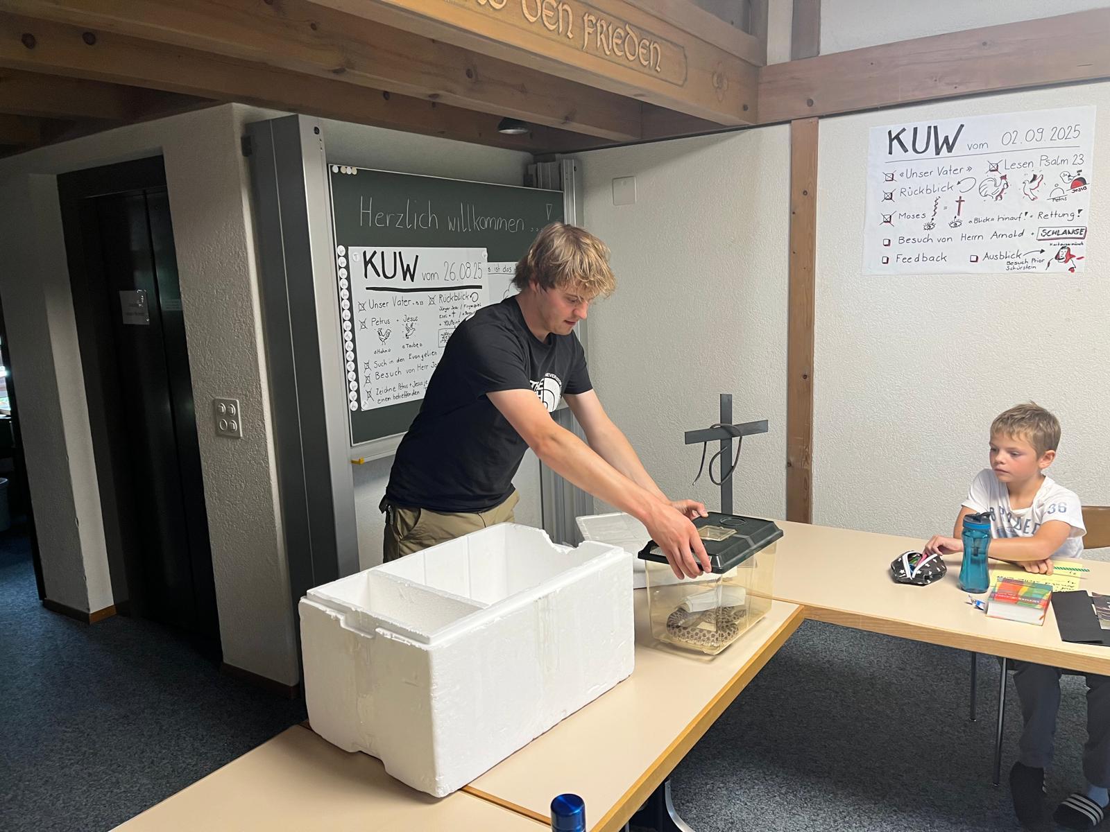 Heute haben wir in der KUW ganz fest zusammen gebetet. Das «Unser Vater». Danach haben wir uns erinnert, was wir beim letzten Mal gelernt haben. Und dann wurde es richtig spannend: Wir haben Geschichten aus der Bibel gelesen und dabei wieder Kaugummi gekaut. Dieses Wiederkäuen erinnert uns daran, dass das Wort Gottes unsere seelische Nahrung ist, da wir wie eine Kuh den biblischen Text immer und immer wieder lesen. Wir hörten von einer Zeit, in der das Volk Israel durch die Wüste wanderte. Dort gab es giftige Schlangen, die viele Menschen gebissen haben. Die Leute hatten grosse Angst und baten Mose, mit Gott zu sprechen. Gott sagte Mose, er solle eine Schlange aus Kupfer machen und sie auf einen Stab setzen. Wer von einer Schlange gebissen wurde und die Kupferschlange anschaute, wurde gesund und gerettet! Jesus hat später von dieser Geschichte erzählt und gesagt: Wer ihn anschaut und an ihn glaubt, wird auch gerettet und bekommt das ewige Leben geschenkt. Das ist ein wunderschönes Versprechen! Wir haben diese Geschichten selbst in der Bibel gesucht, im Tanach (das ist die jüdische Bibel) und im Neuen Testament. Und dann kam ein ganz besonderer Moment: Eine echte Schlange hat uns besucht! Es war eine Hakennasennatter. Herr Arnold, ihr Besitzer, hat uns erklärt, dass ihr Gift etwa so wirkt wie das einer Biene also nicht gefährlich für uns. Die Schlange war wunderschön. Danach haben wir ein besonderes Kunstwerk angeschaut und sogar in die Hände genommen: Die eherne Schlange am Kreuz, gestaltet vom Kartäusermönch Bruder Janez. Er ist der älteste noch lebende Kartäuser der Welt und hat dieses Kunstwerk extra für uns 3. Klässler der KUW Madiswil gemacht. Wir haben das Bild abgezeichnet und Bruder Janez dafür gedankt. Zum Schluss durften wir sagen, ob uns die heutige KUW gefallen hat. Wir haben heute gelernt, dass der Glaube an Jesus uns helfen kann, wenn es im Leben schwierig wird. Wir haben gespürt, dass Gott uns ganz nahe ist und uns Hoffnung schenkt. Und wir durften kreativ sein und dabei viel über Jesus und die Bibel erfahren.
