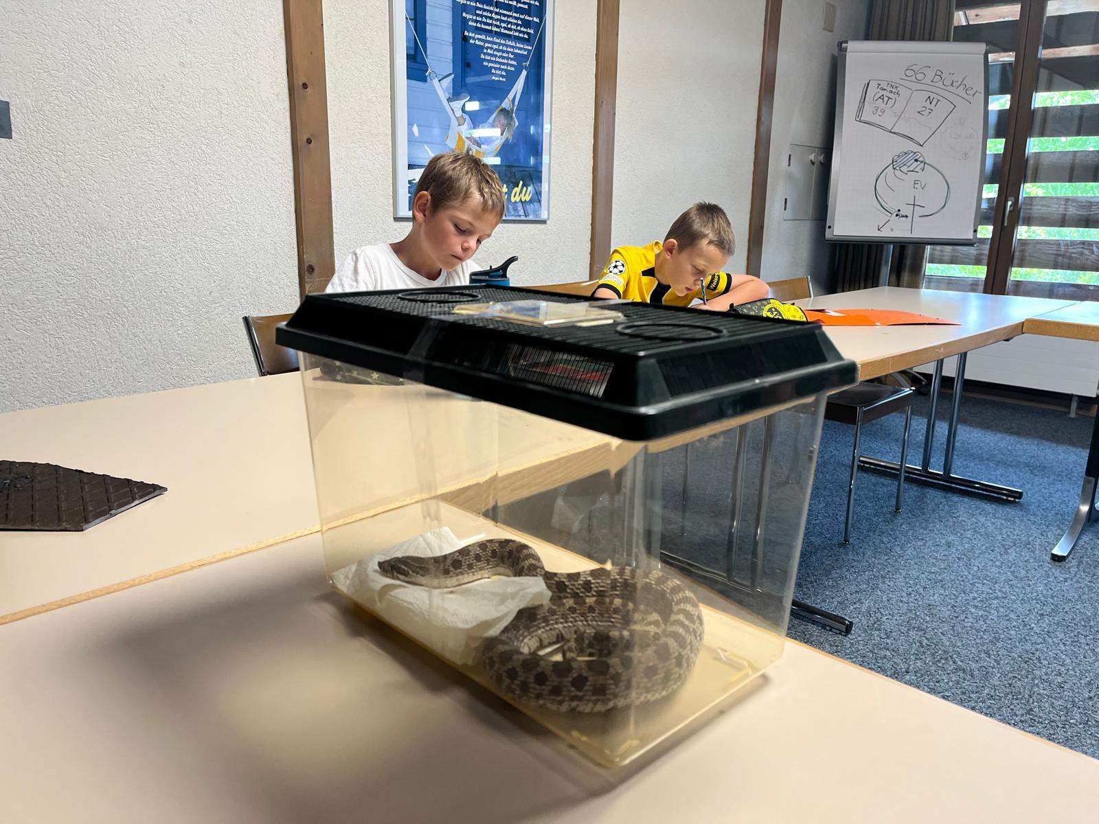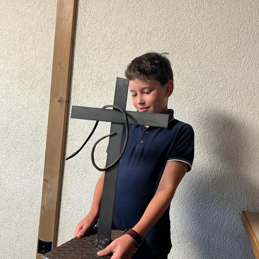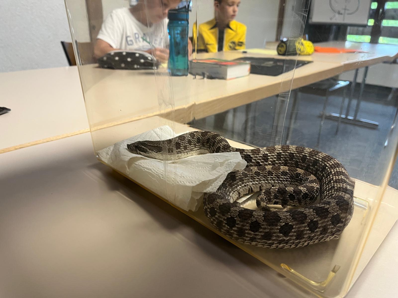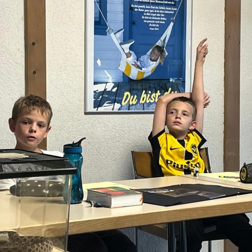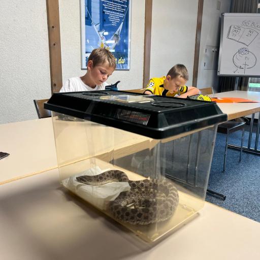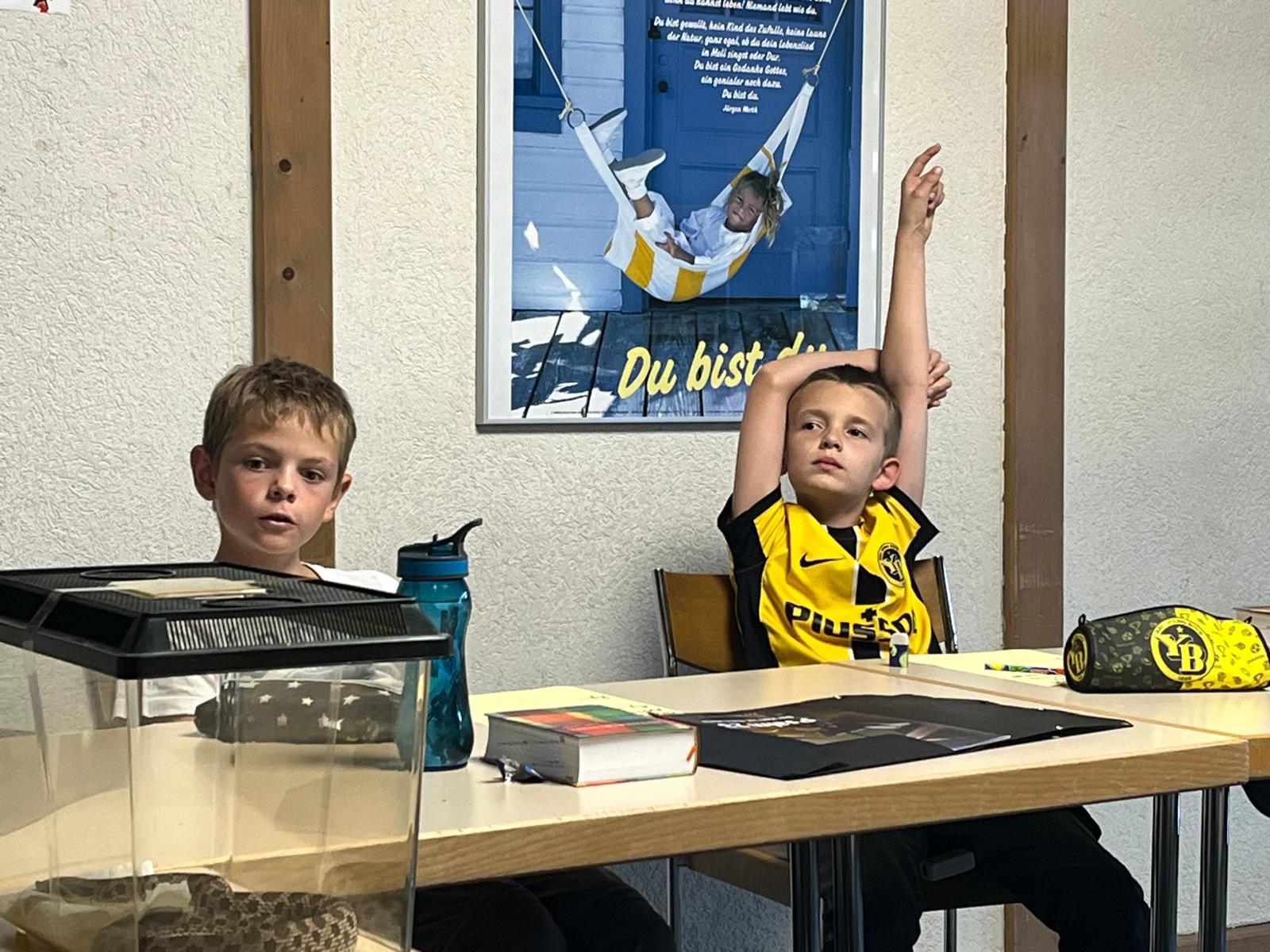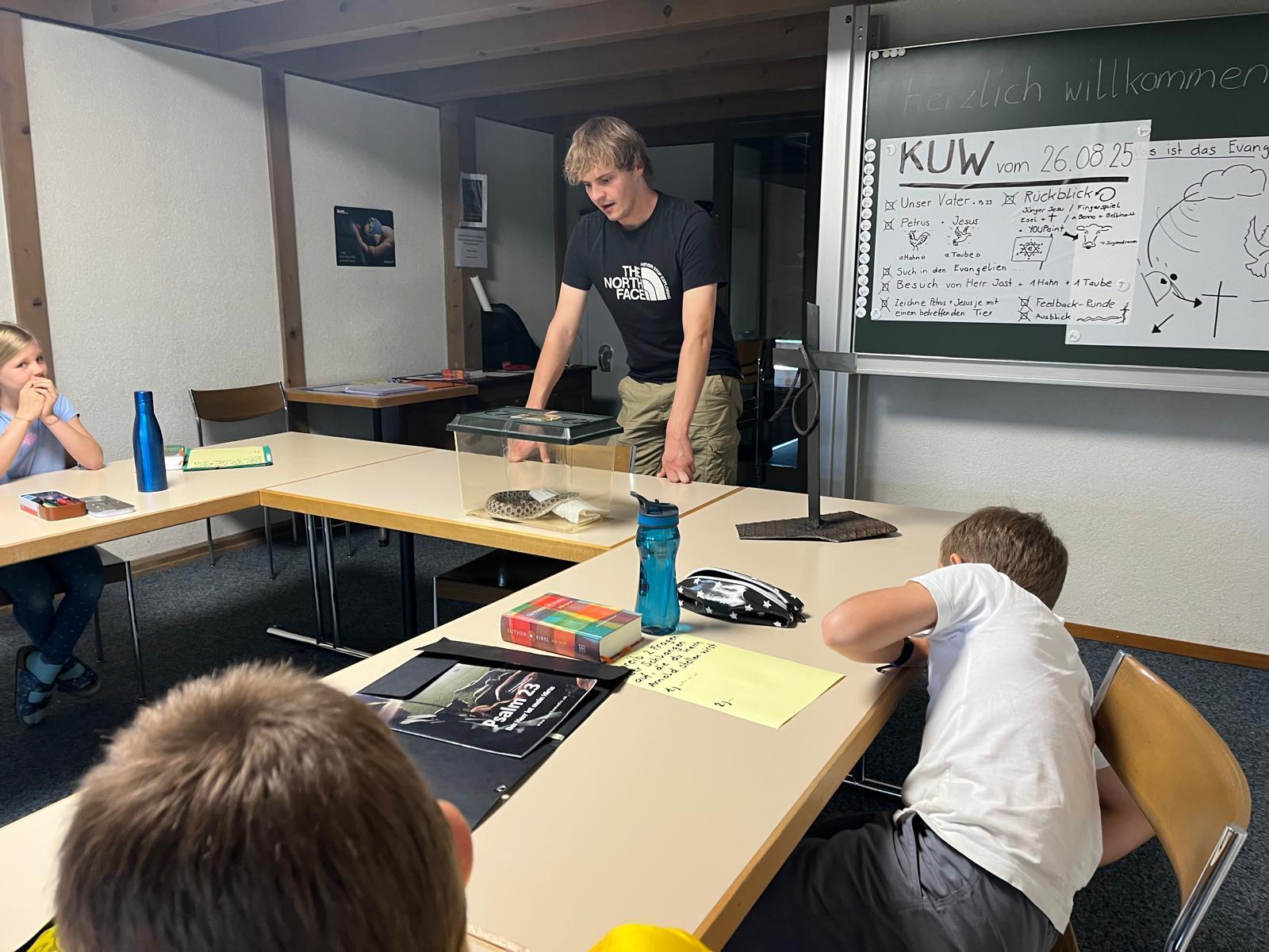 Heute haben wir in der KUW ganz fest zusammen gebetet. Das «Unser Vater». Danach haben wir uns erinnert, was wir beim letzten Mal gelernt haben. Und dann wurde es richtig spannend: Wir haben Geschichten aus der Bibel gelesen und dabei wieder Kaugummi gekaut. Dieses Wiederkäuen erinnert uns daran, dass das Wort Gottes unsere seelische Nahrung ist, da wir wie eine Kuh den biblischen Text immer und immer wieder lesen. Wir hörten von einer Zeit, in der das Volk Israel durch die Wüste wanderte. Dort gab es giftige Schlangen, die viele Menschen gebissen haben. Die Leute hatten grosse Angst und baten Mose, mit Gott zu sprechen. Gott sagte Mose, er solle eine Schlange aus Kupfer machen und sie auf einen Stab setzen. Wer von einer Schlange gebissen wurde und die Kupferschlange anschaute, wurde gesund und gerettet! Jesus hat später von dieser Geschichte erzählt und gesagt: Wer ihn anschaut und an ihn glaubt, wird auch gerettet und bekommt das ewige Leben geschenkt. Das ist ein wunderschönes Versprechen! Wir haben diese Geschichten selbst in der Bibel gesucht, im Tanach (das ist die jüdische Bibel) und im Neuen Testament. Und dann kam ein ganz besonderer Moment: Eine echte Schlange hat uns besucht! Es war eine Hakennasennatter. Herr Arnold, ihr Besitzer, hat uns erklärt, dass ihr Gift etwa so wirkt wie das einer Biene also nicht gefährlich für uns. Die Schlange war wunderschön. Danach haben wir ein besonderes Kunstwerk angeschaut und sogar in die Hände genommen: Die eherne Schlange am Kreuz, gestaltet vom Kartäusermönch Bruder Janez. Er ist der älteste noch lebende Kartäuser der Welt und hat dieses Kunstwerk extra für uns 3. Klässler der KUW Madiswil gemacht. Wir haben das Bild abgezeichnet und Bruder Janez dafür gedankt. Zum Schluss durften wir sagen, ob uns die heutige KUW gefallen hat. Wir haben heute gelernt, dass der Glaube an Jesus uns helfen kann, wenn es im Leben schwierig wird. Wir haben gespürt, dass Gott uns ganz nahe ist und uns Hoffnung schenkt. Und wir durften kreativ sein und dabei viel über Jesus und die Bibel erfahren.