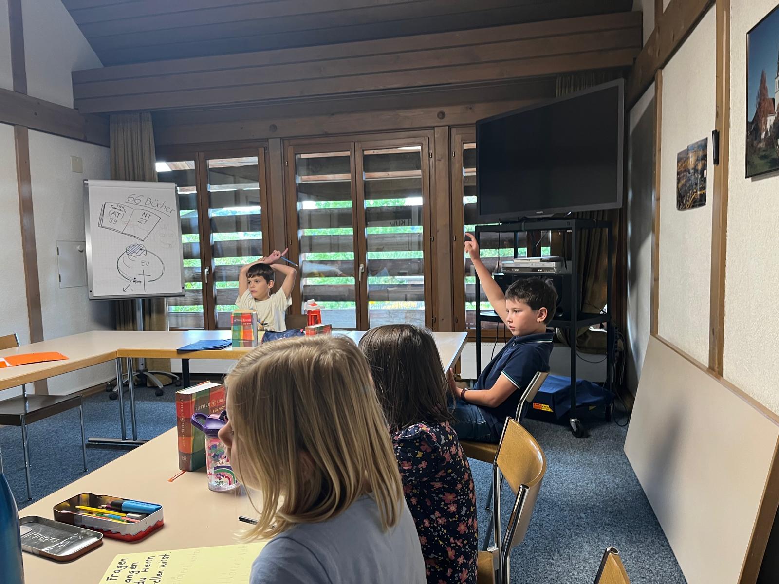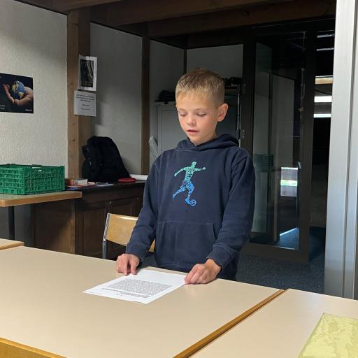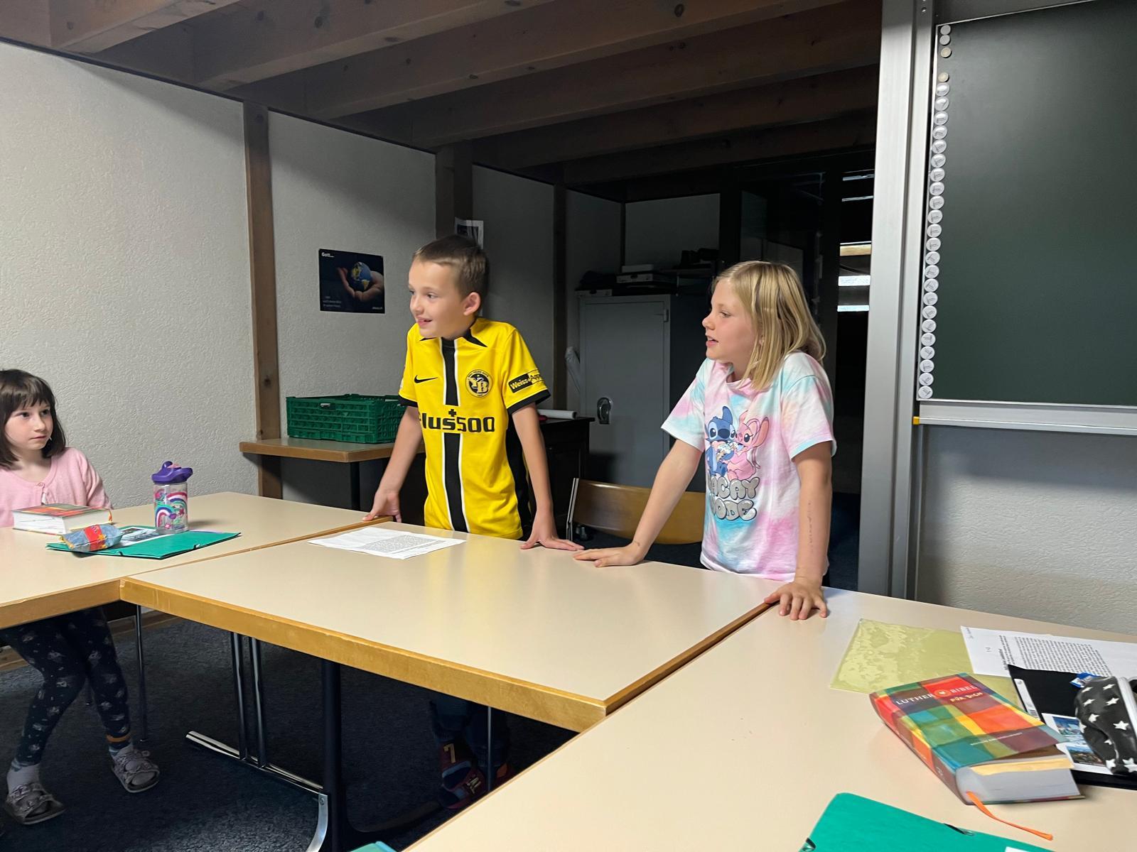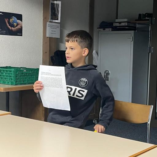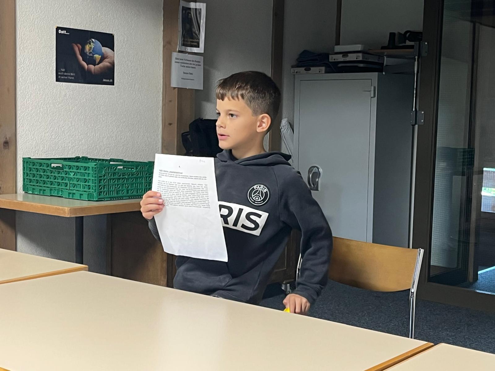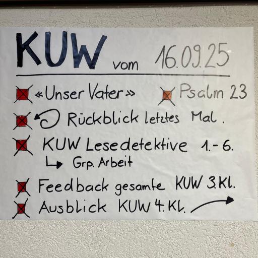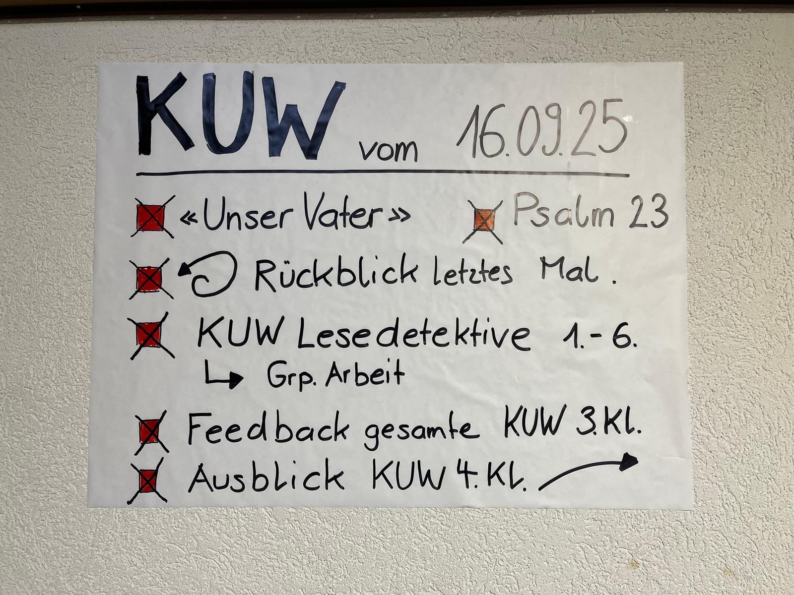Zu Beginn unsere KUW nachmittags haben wir wie gewohnt gemeinsam das Gebet «Unser Vater» gesprochen. Dieses besondere Gebet hat Jesus seinen zwölf Jüngern beigebracht und auch wir dürfen es beten, wenn wir mit Gott sprechen möchten. Es verbindet uns mit ihm und schenkt uns Ruhe und Vertrauen. Danach haben wir zusammen den Psalm 23 gelesen. Darin beschreibt König David, wie Gott wie ein guter Hirte für uns sorgt. Viele Kinder haben dabei gespürt: Gott ist immer bei uns auch wenn wir Angst haben oder traurig sind. Dann wurden wir zu echten Lesedetektiven! In sechs Gruppen haben wir die spannenden KUW Themen aus der 3. Klasse noch einmal unter die Lupe genommen. Jede Gruppe hat eine kleine Präsentation vorbereitet und den anderen Kindern gezeigt, was sie gelernt hat. So konnten wir gemeinsam alles wiederholen, Fragen stellen und unser Wissen festigen. Unsere KUW Themen waren bunt und aufregend: