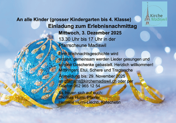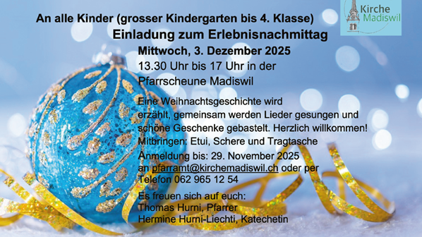 Mittwoch, 3. Dezember 2025, 13:30 Uhr für alle Kinder vom grossen Kindergarten bis zur 4. Klasse Ort Pfarrscheune zur Agenda