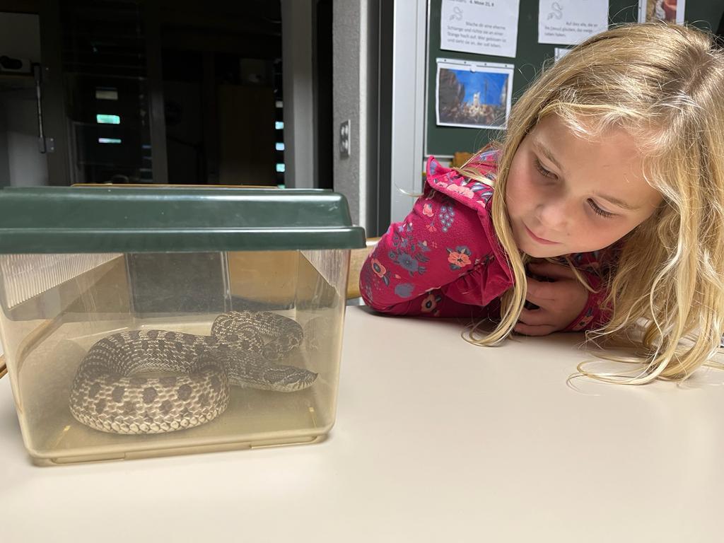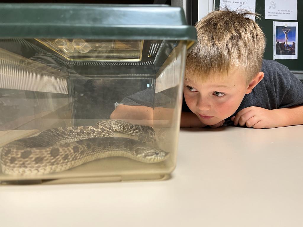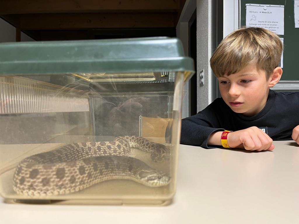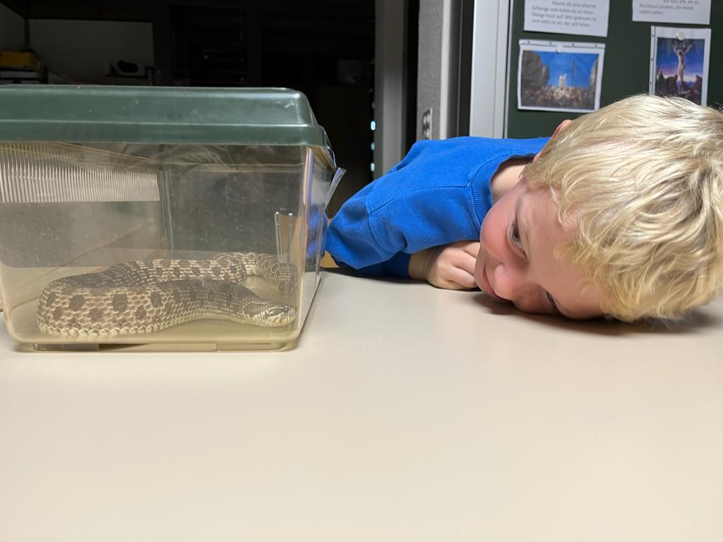 Der Besuch einer Hakennasennatter-Schlange rundete die heutige KUW mit dem Thema Glauben ab. Herr Arnold hat uns seine Schlange vorgestellt und wichtige Informationen über diese wunderbaren Tiere erzählt.